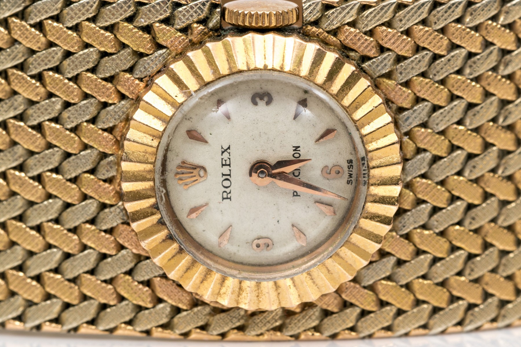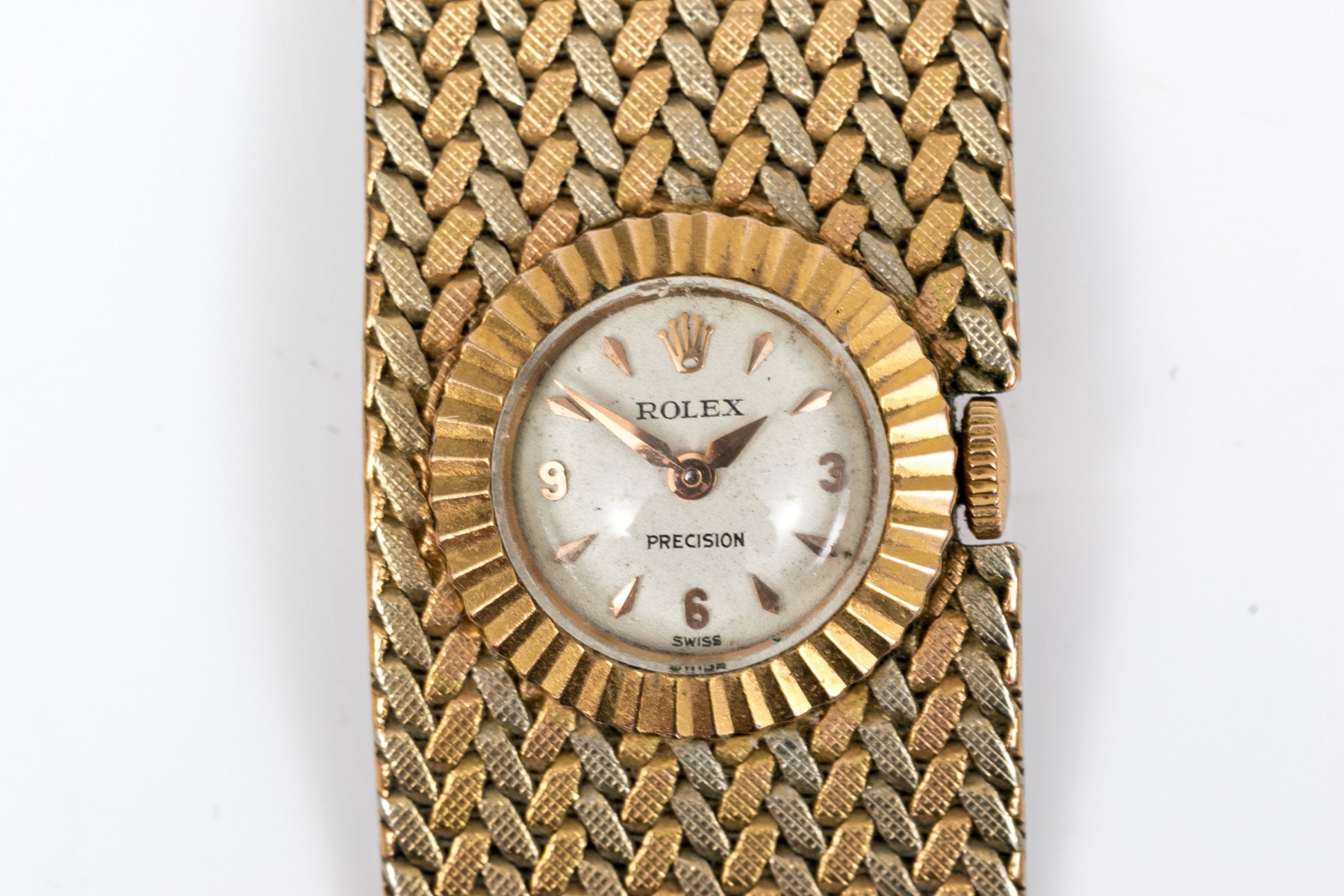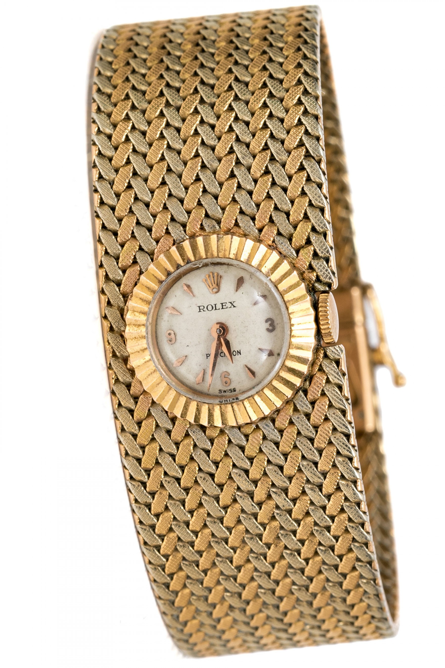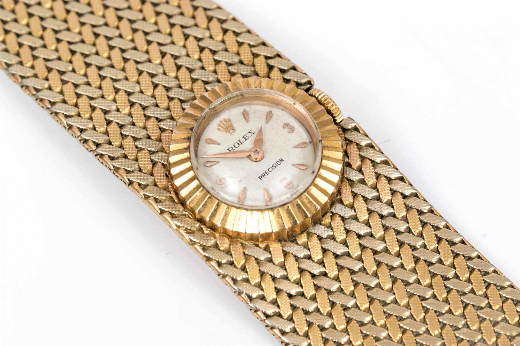 Rolex 18k gold retro vintage Precision bracelet watch. This fabulous watch has a wide, woven bracelet, inset with a round case, silvered dial with arrow markers and Arabic numerals, fluted bezel and a hand wound mechanical movement. The bracelet is finished by a hidden box style clasp and a figure eight safety clasp