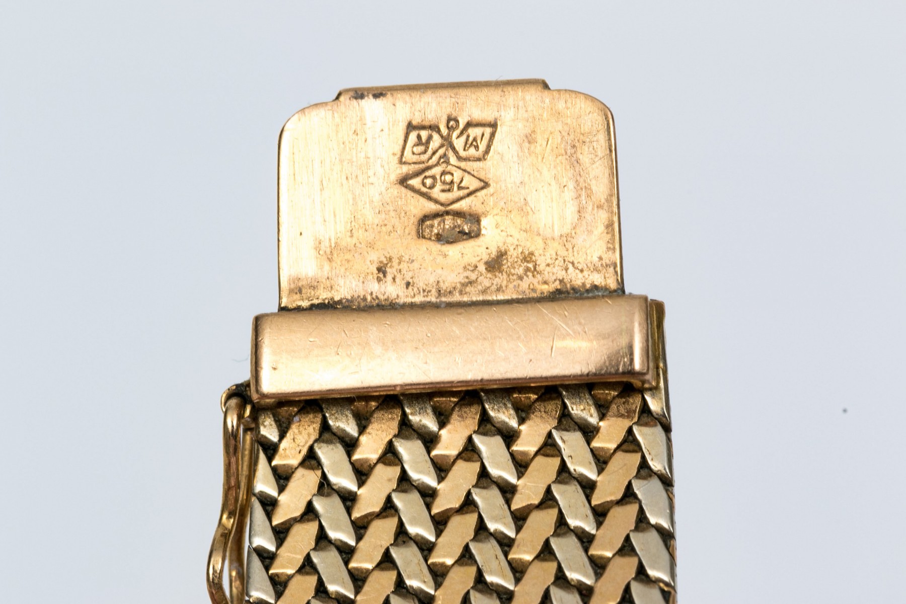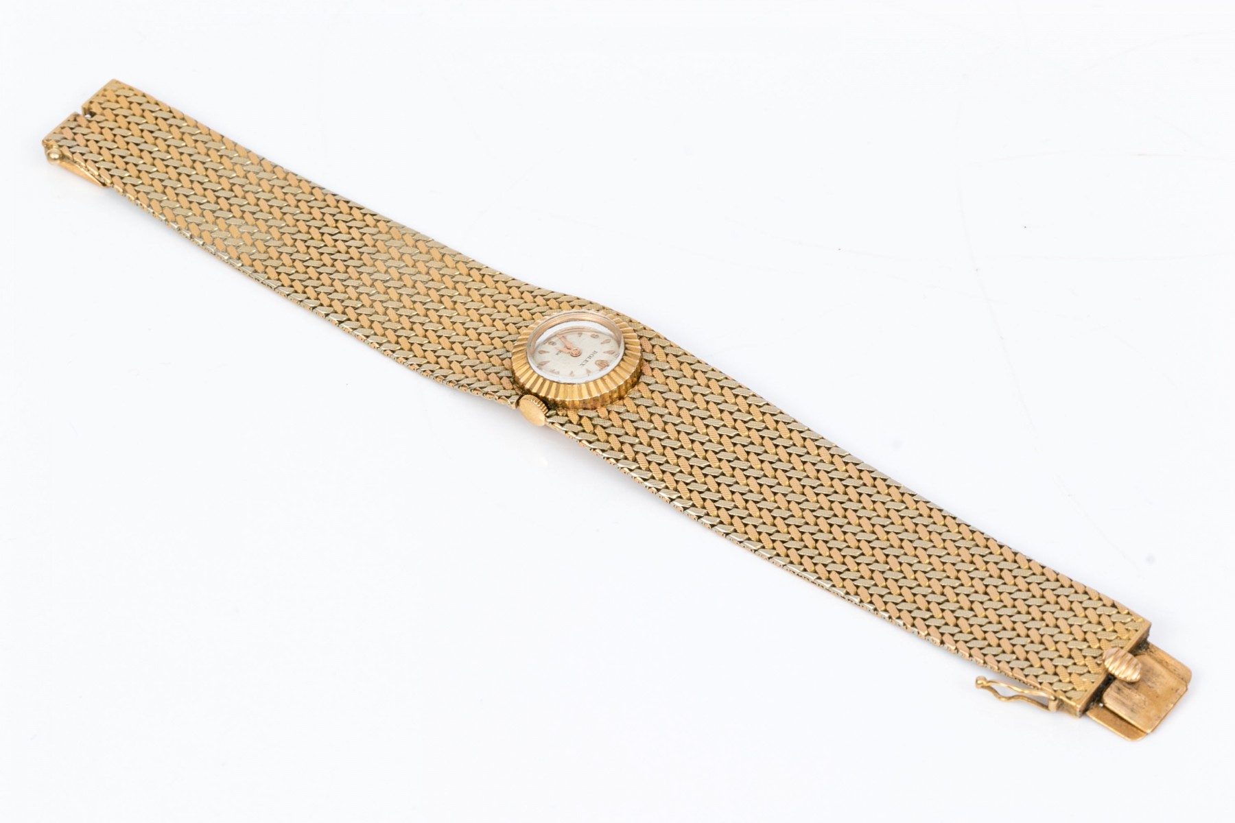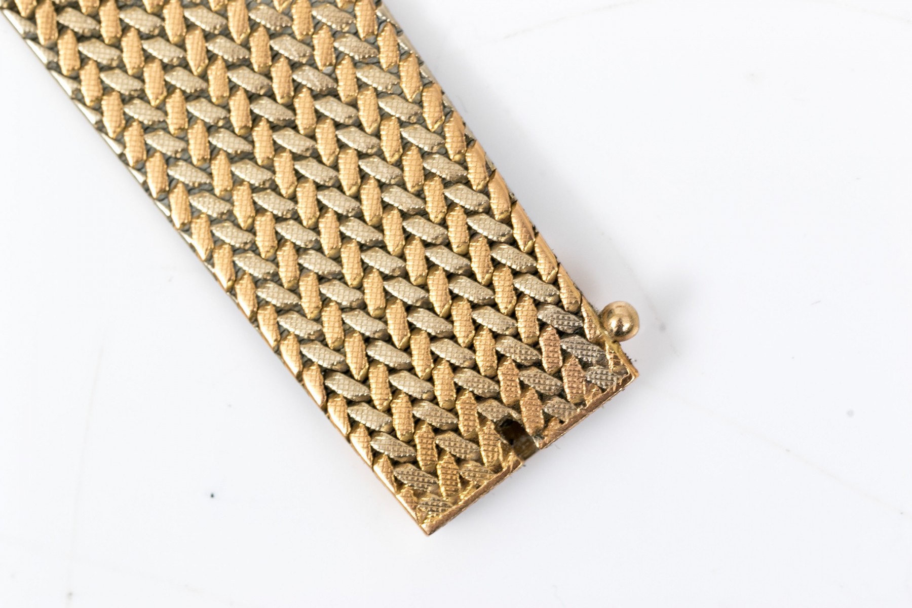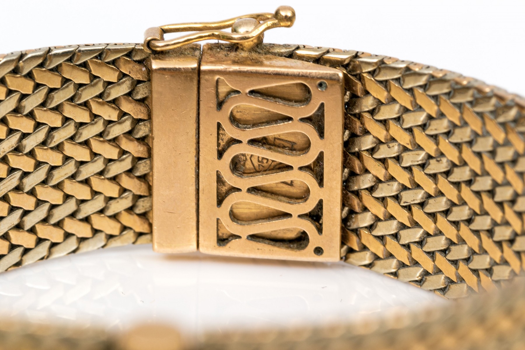 Rolex 18k gold retro vintage Precision bracelet watch. This fabulous watch has a wide, woven bracelet, inset with a round case, silvered dial with arrow markers and Arabic numerals, fluted bezel and a hand wound mechanical movement. The bracelet is finished by a hidden box style clasp and a figure eight safety clasp