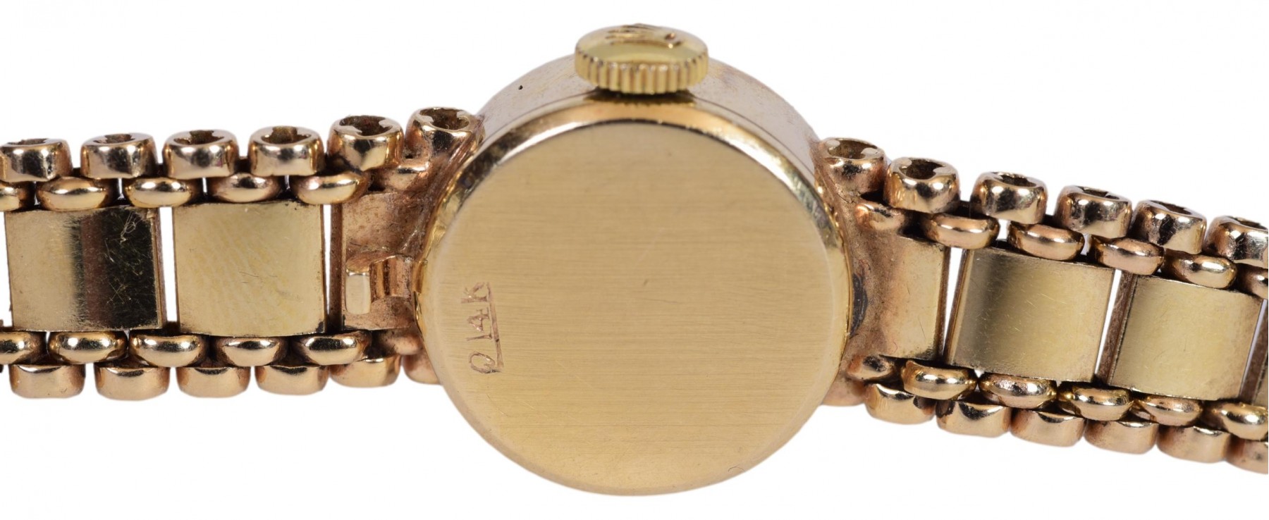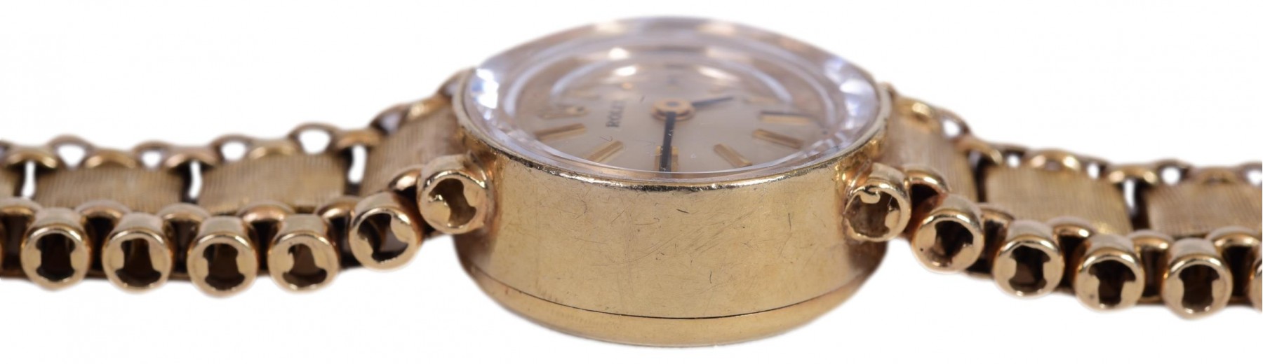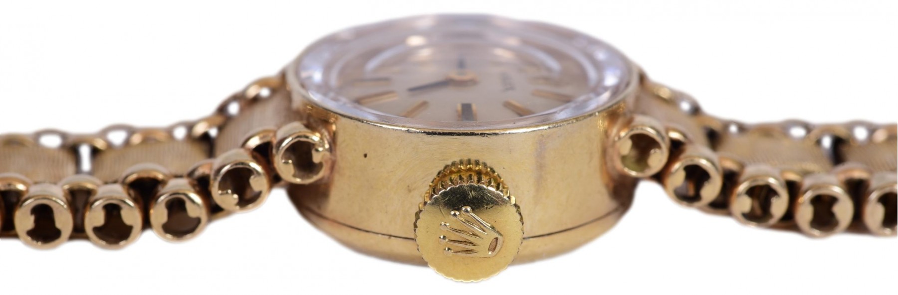 A beautiful ladies mechanical, manual wind movement dress watch by Rolex showcases a classic solid gold case and distinctive original Rolex integrated bracelet in solid 14K gold with a hand-hammered Florentine finish. Dial has easy to read black topped hands and indexes at the primary hours and is signed Rolex. Closure has three options to accommodate the size of your wrist. This bracelet is unusual and looks fabulous and unique on the wrist.