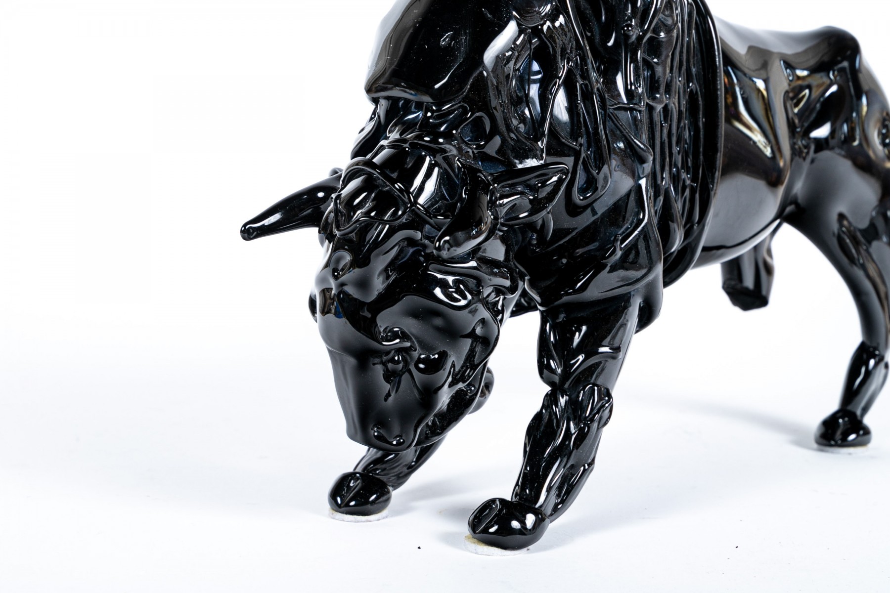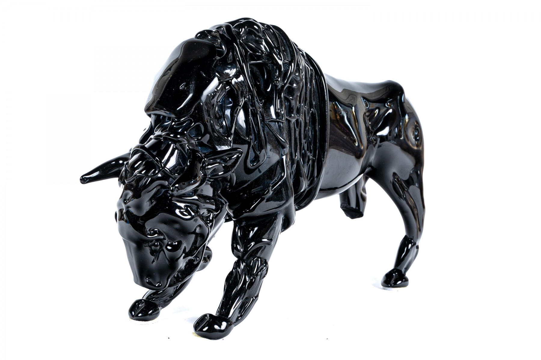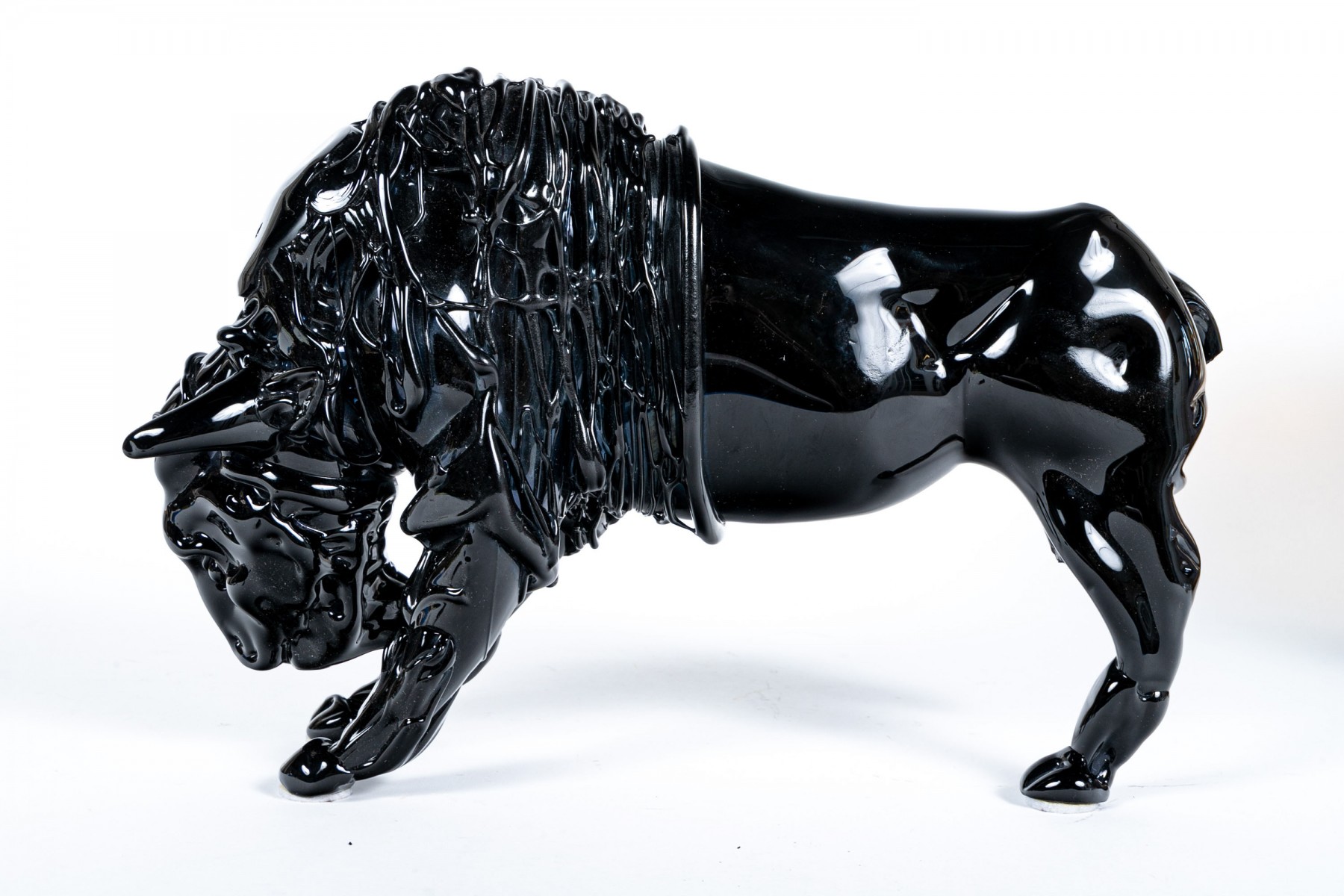 A modern work of art in deep black Murano glass, a grand-size buffalo with arched back blown and handcrafted, attributed to Romano Dona.