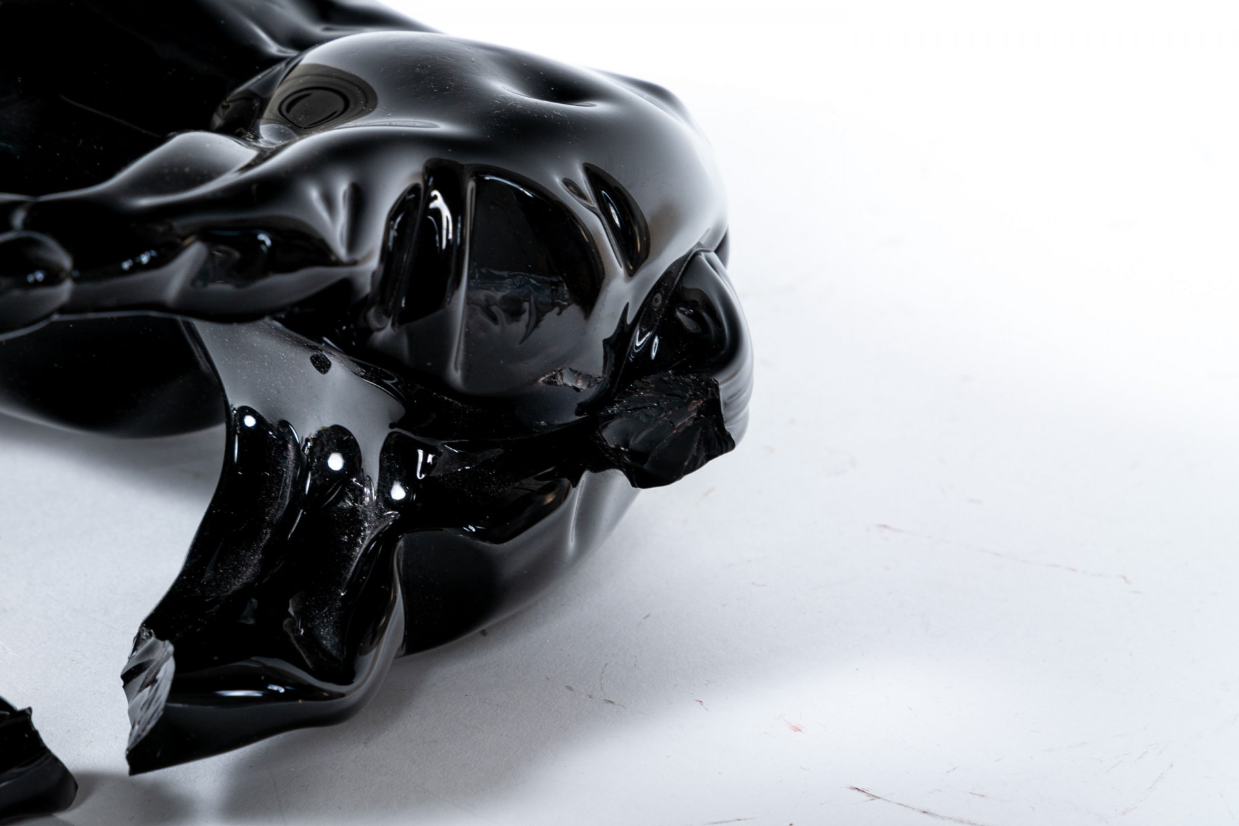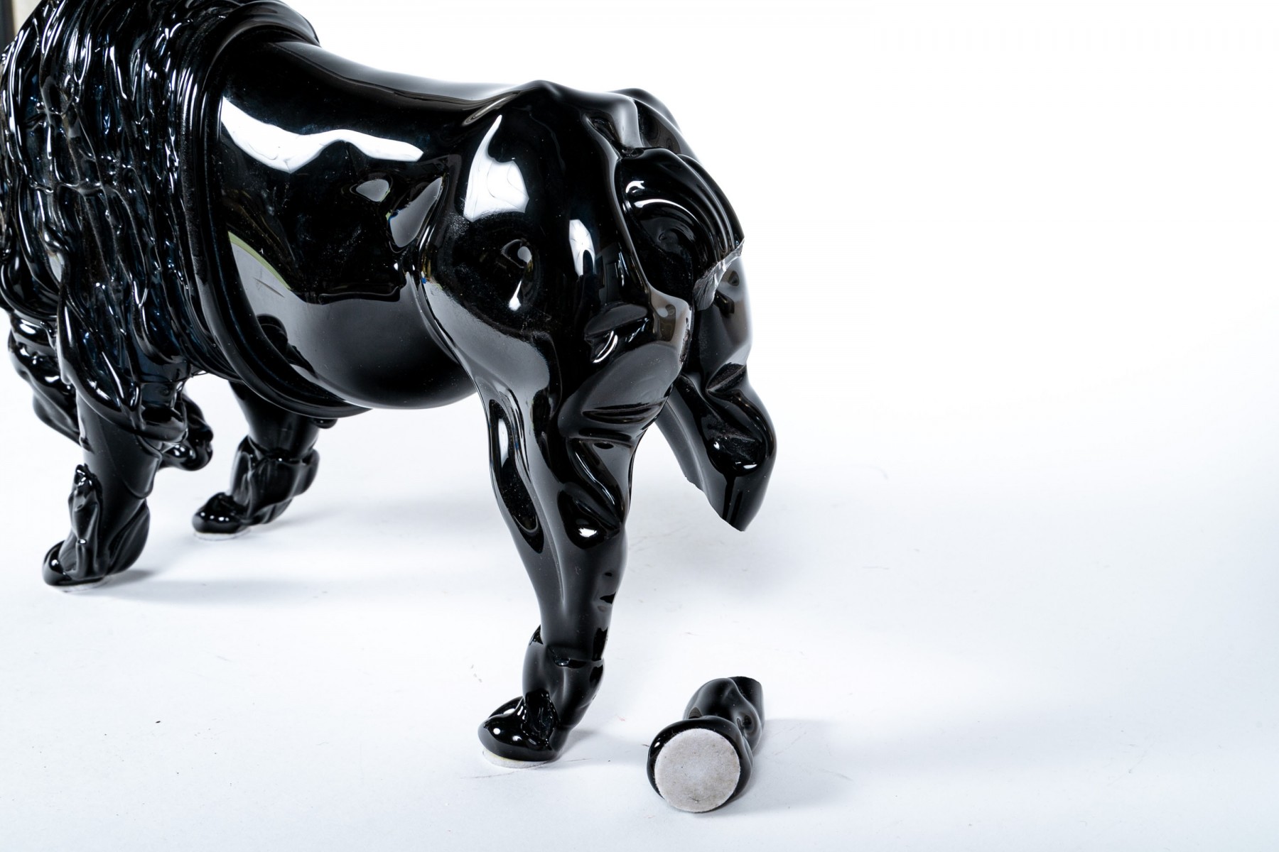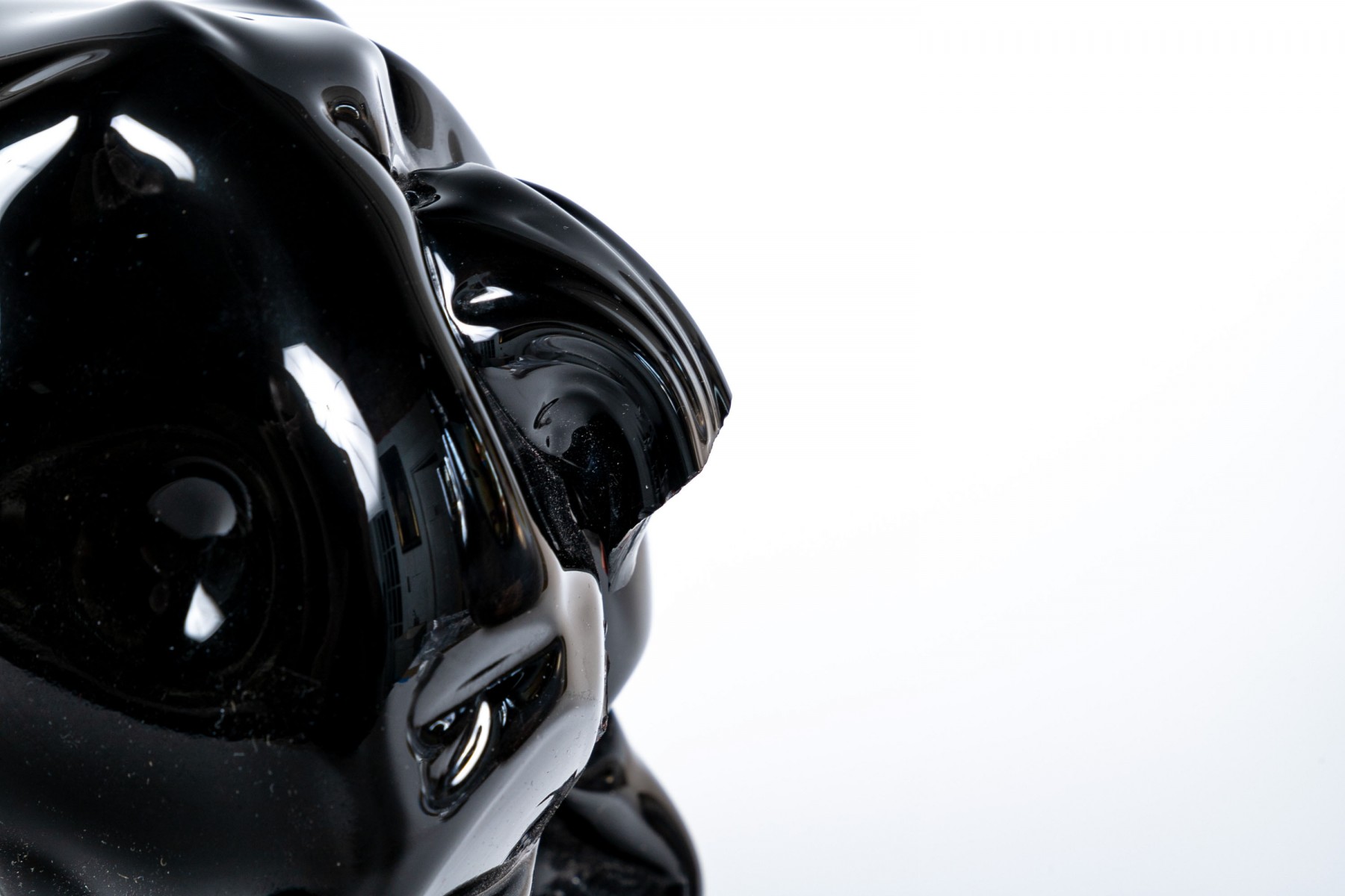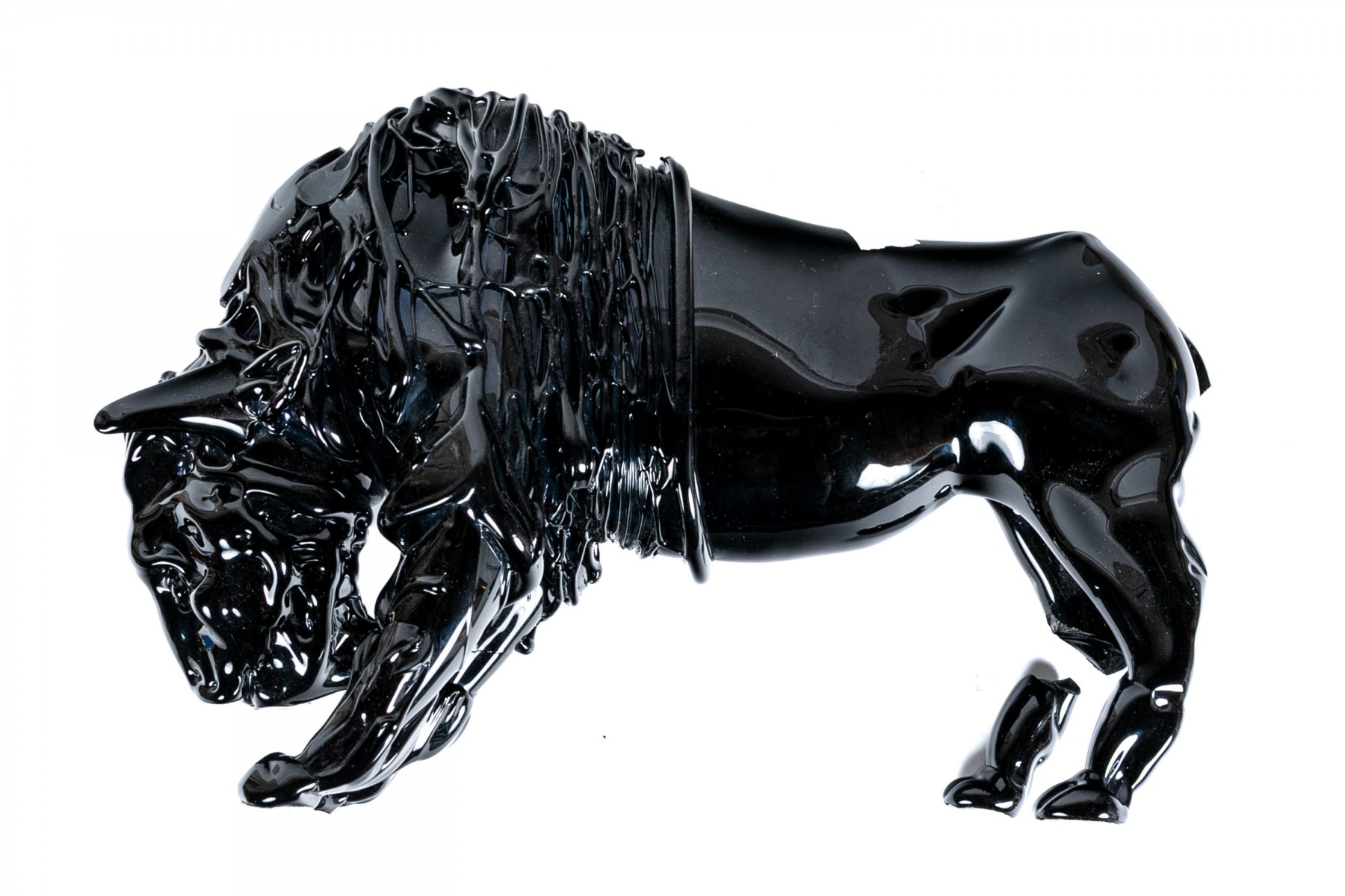 A modern work of art in deep black Murano glass, a grand-size buffalo with arched back blown and handcrafted, attributed to Romano Dona.