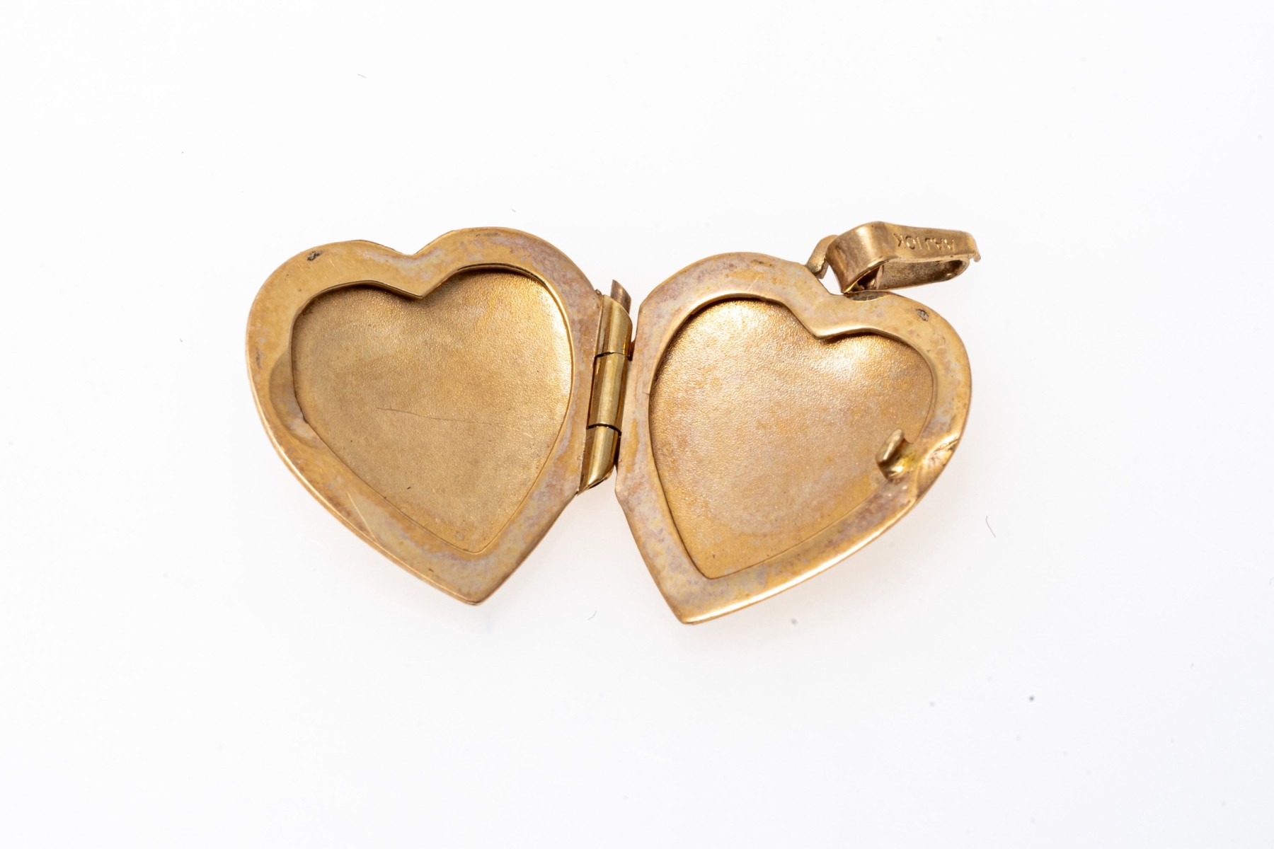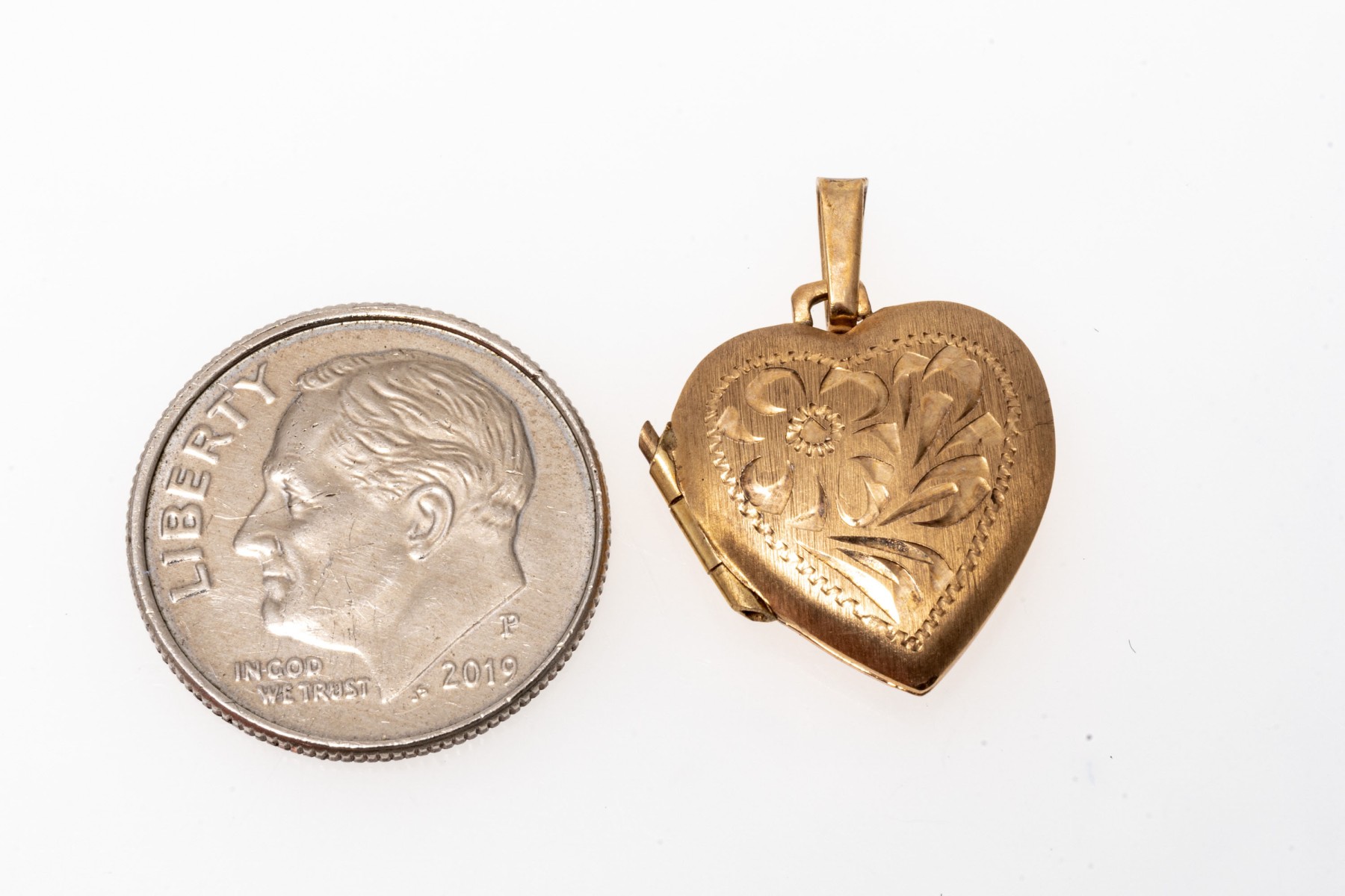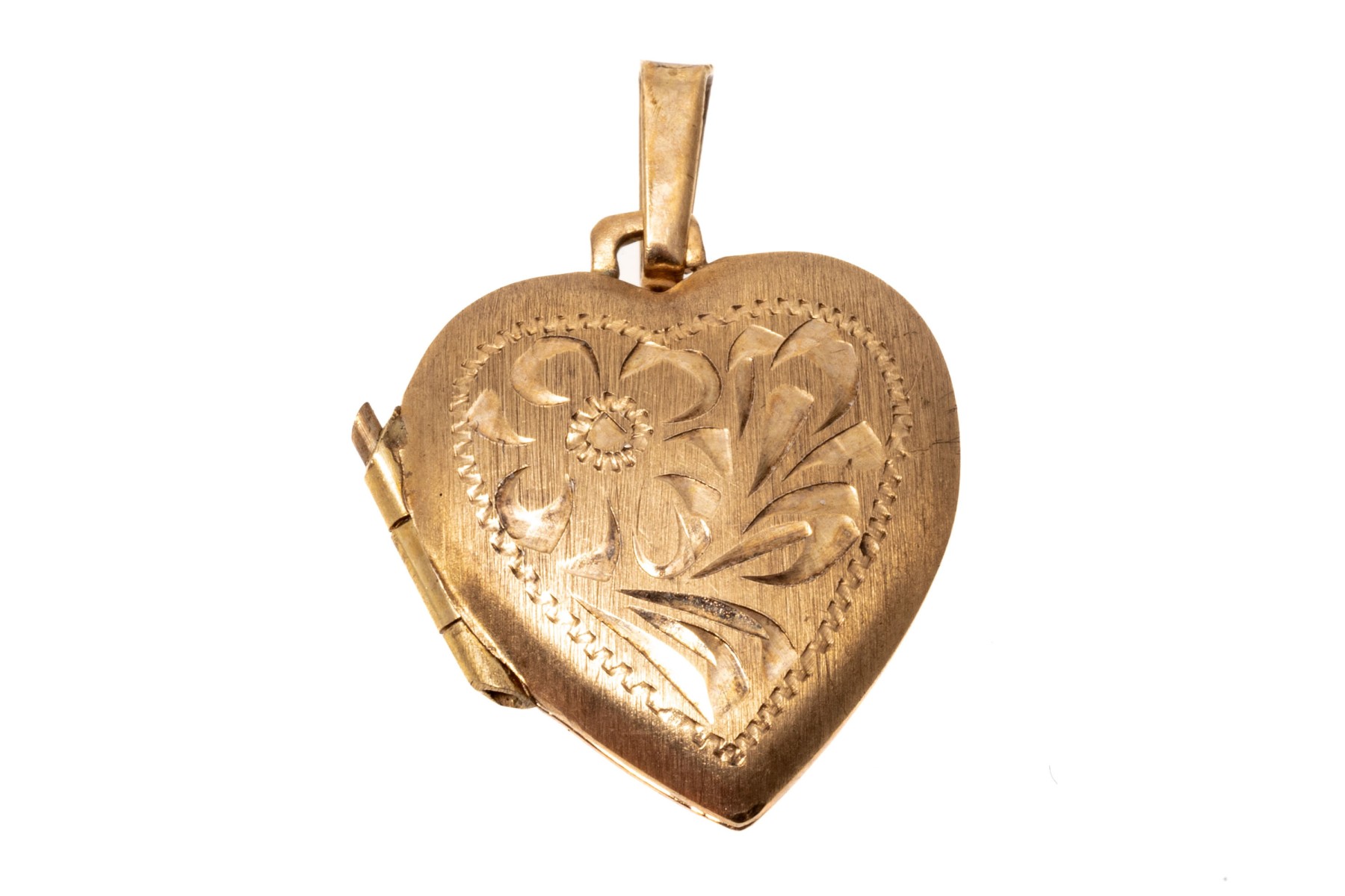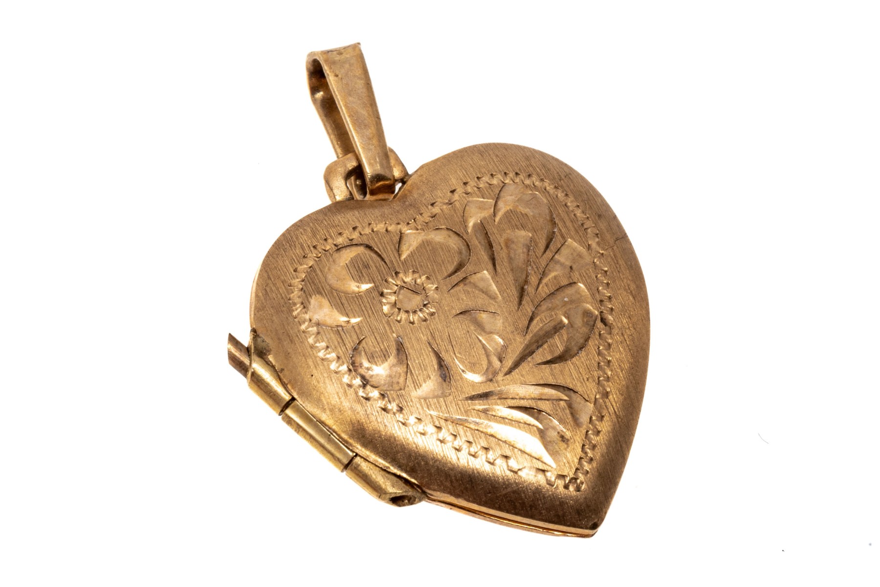 10K yellow gold locket pendant. Heart form locket with a delicate etched design over the face. Hinged opening.