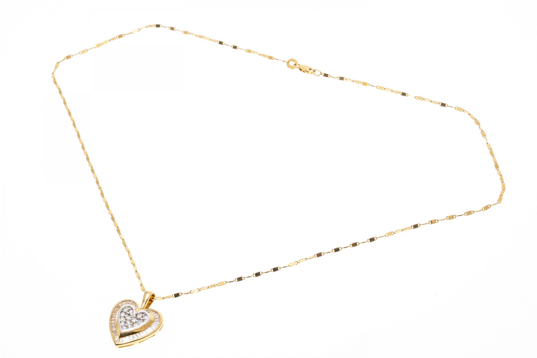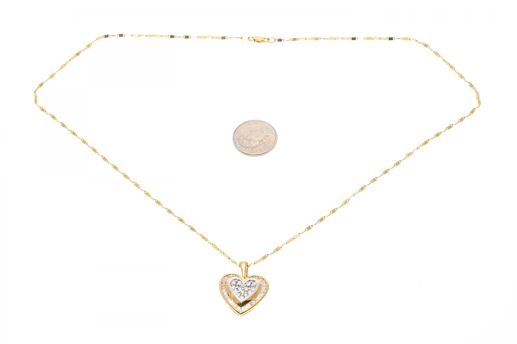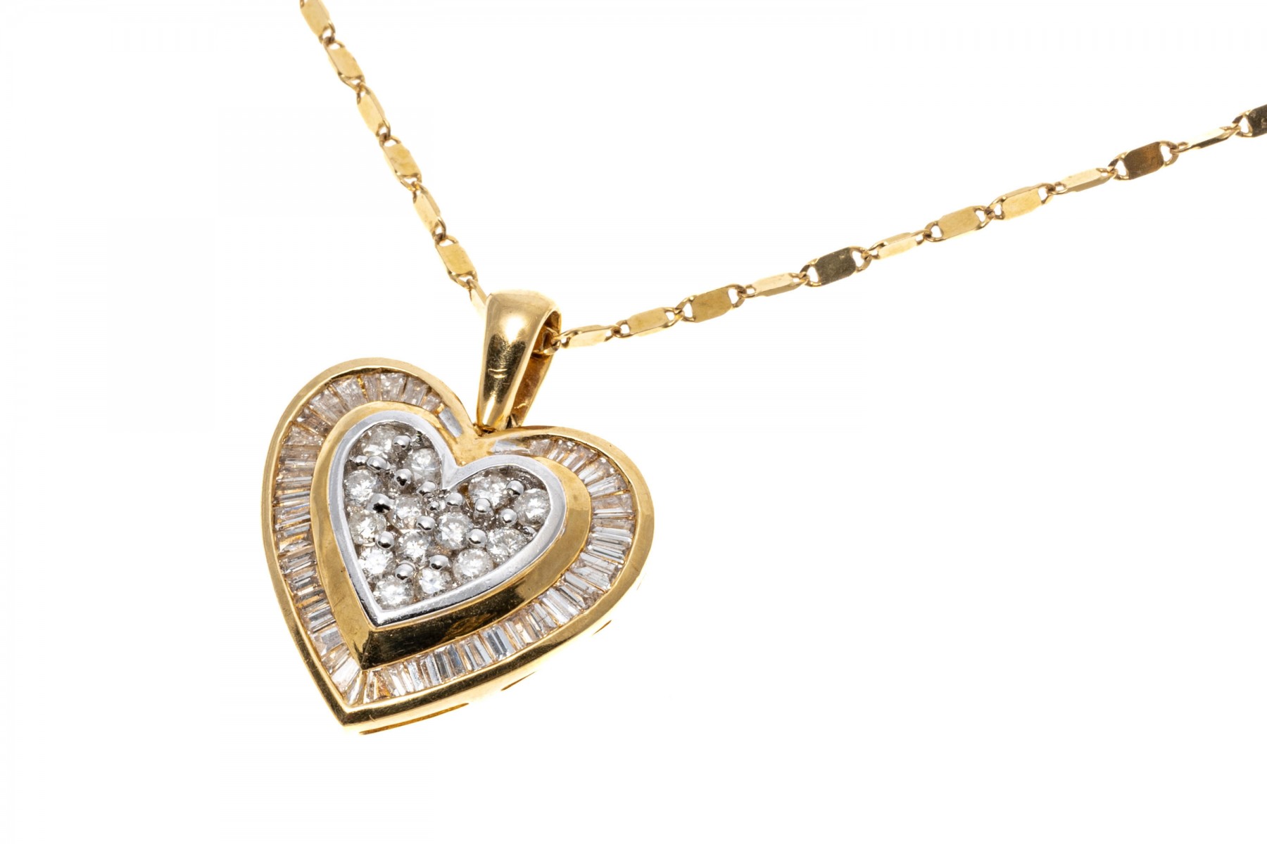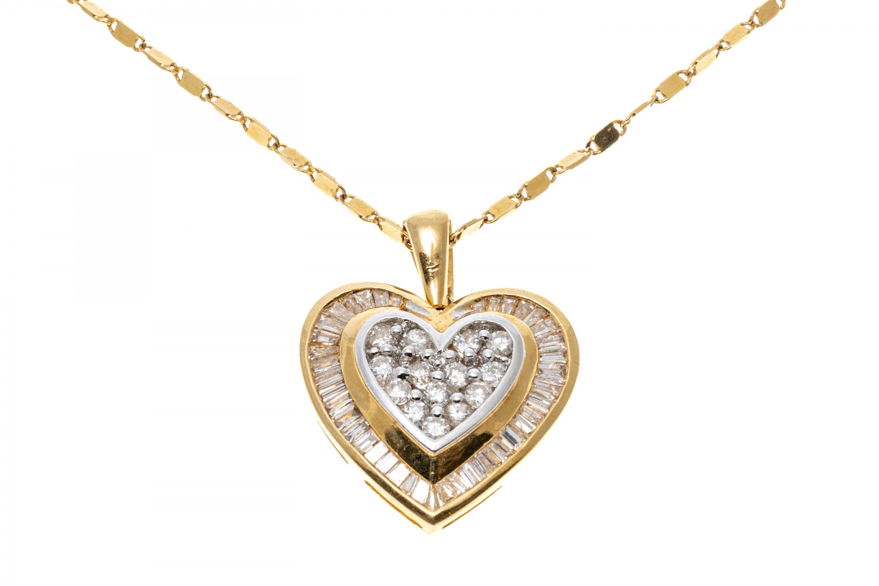 14K yellow gold necklace. Suspended from the necklace is a romantic heart pendant pave set with round cut diamond in a white gold setting. Trailing along the edge of the heart are channel set baguette cut diamonds. The diamonds are approximately 1.3 TCW. Lobster claw clasp.