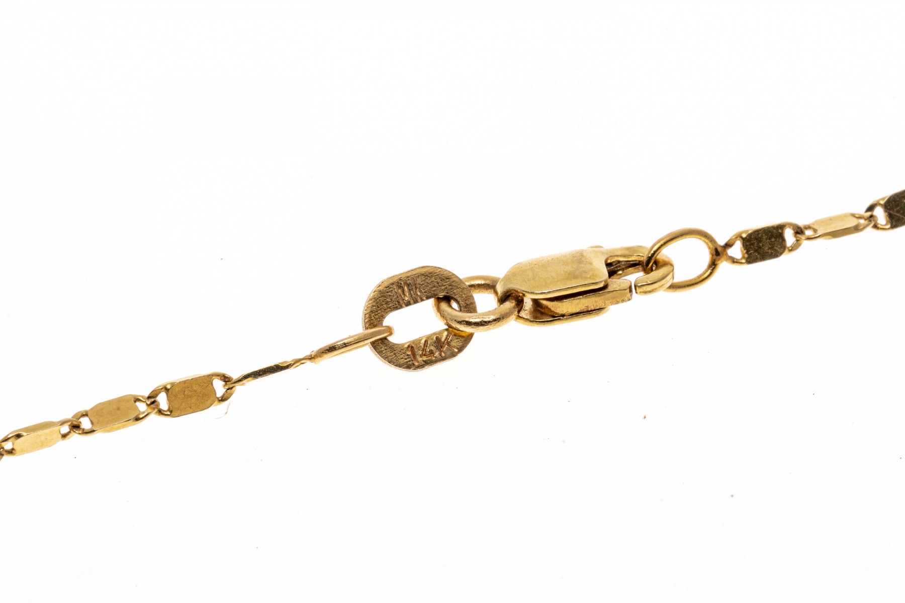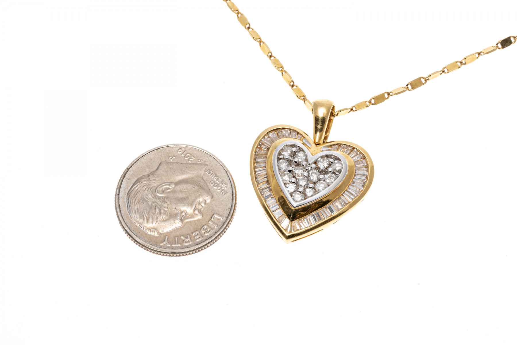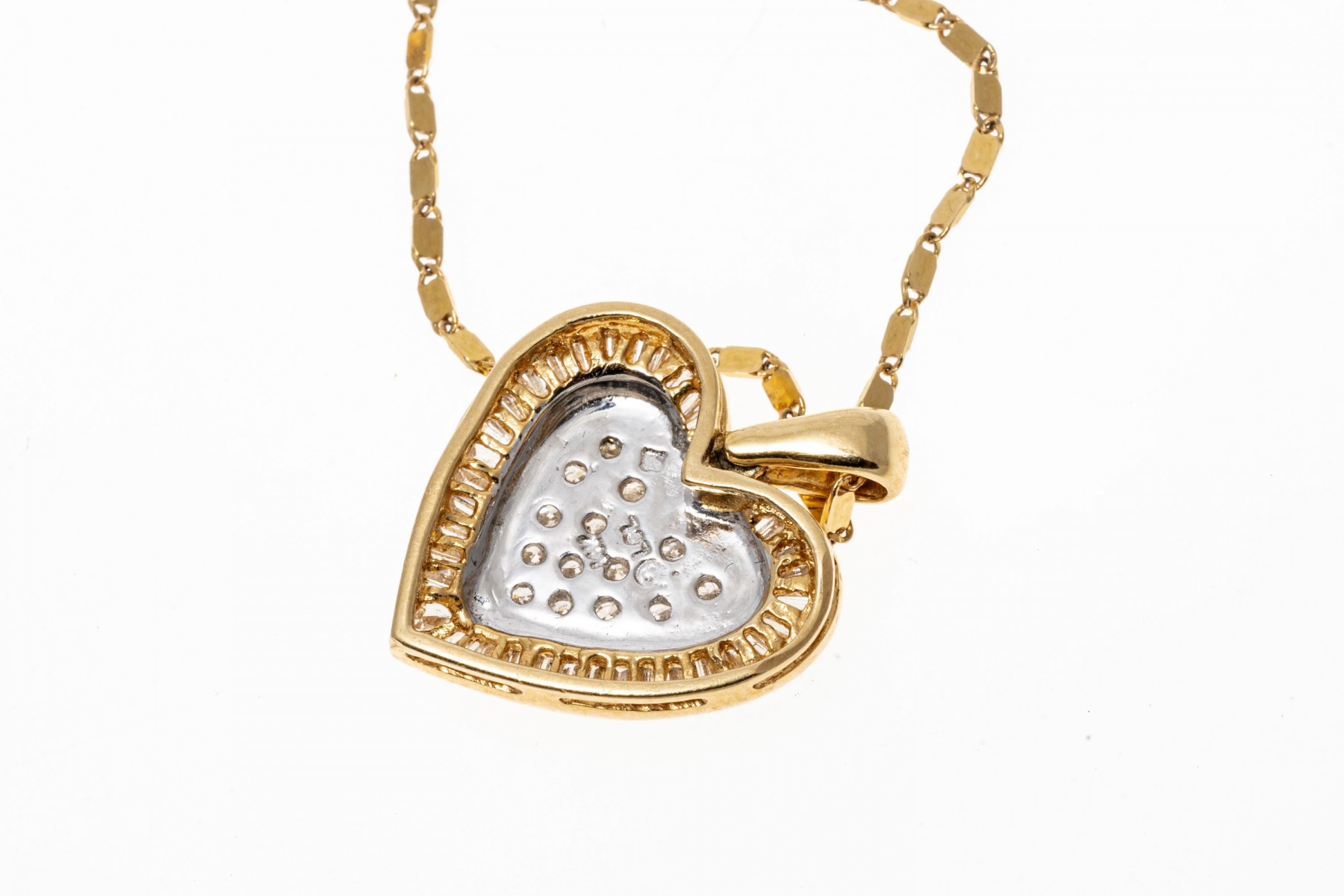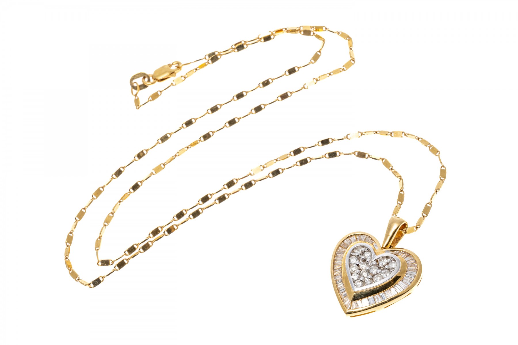 14K yellow gold necklace. Suspended from the necklace is a romantic heart pendant pave set with round cut diamond in a white gold setting. Trailing along the edge of the heart are channel set baguette cut diamonds. The diamonds are approximately 1.3 TCW. Lobster claw clasp.