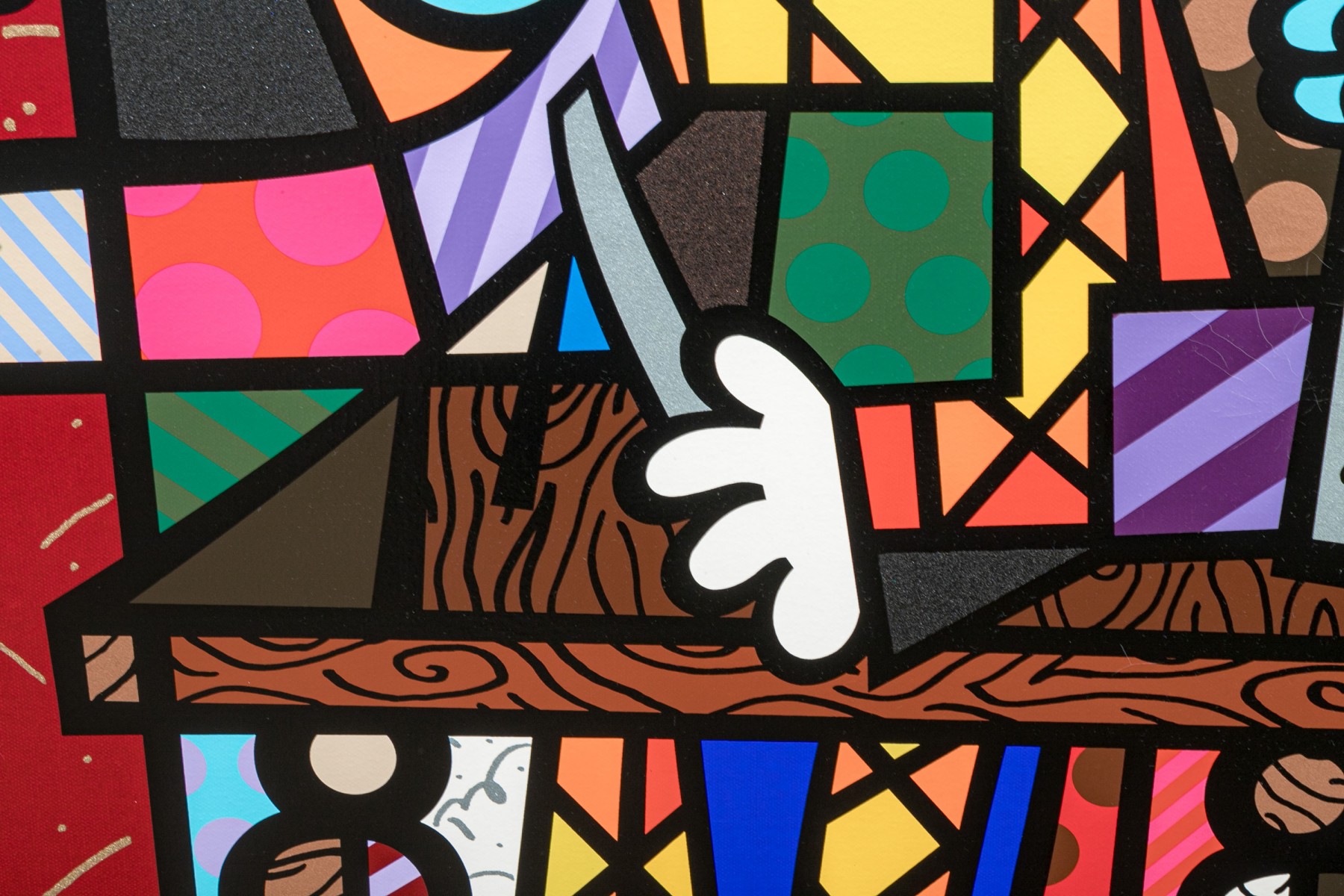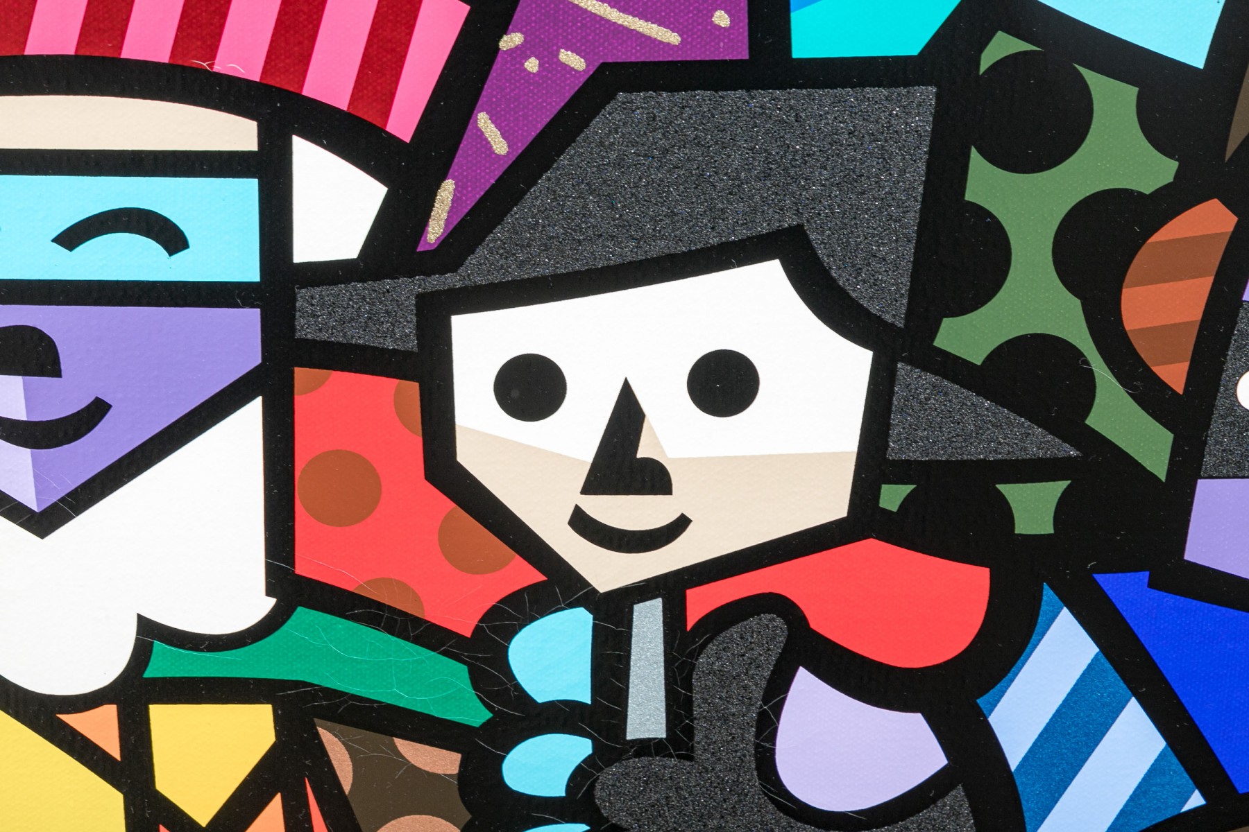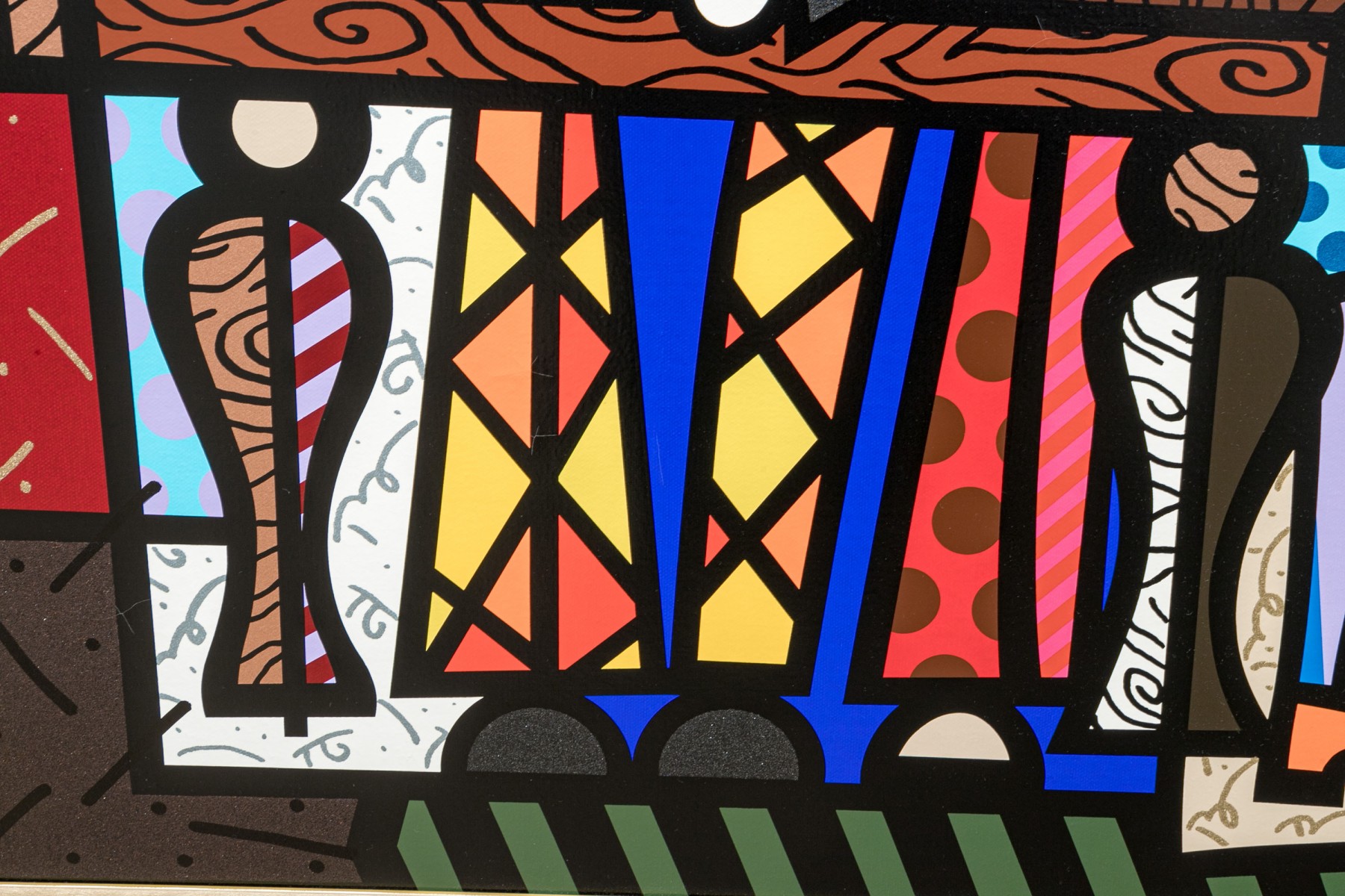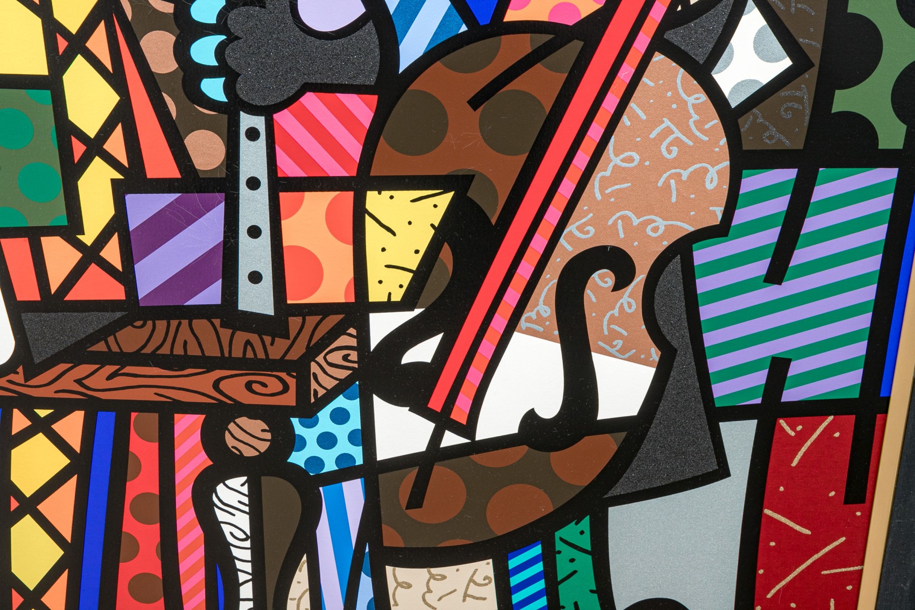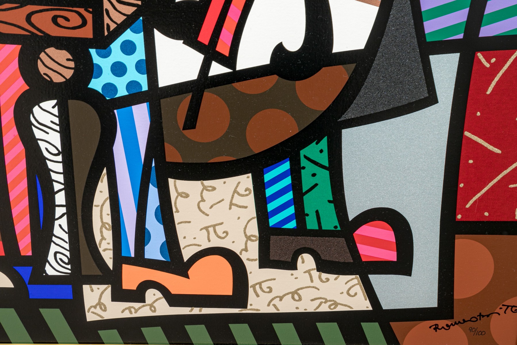 This limited edition serigraph, titled "Spanish Sensation" is a remarkable creation by the renowned Brazilian artist Romero Britto, known for his vibrant and playful art style. Britto's signature can be found on the lower right corner, with this particular piece numbered 90/100 and dated '76. It is elegantly presented within a brushed gilt frame.