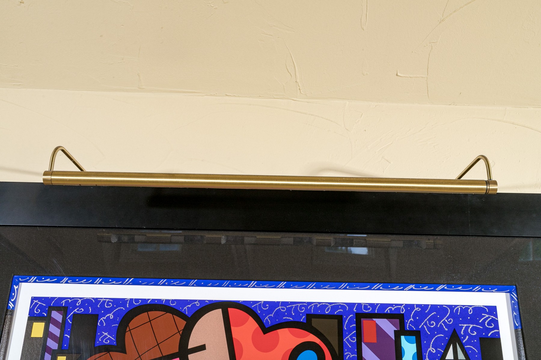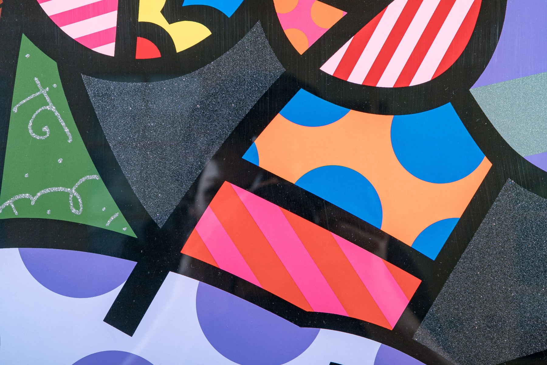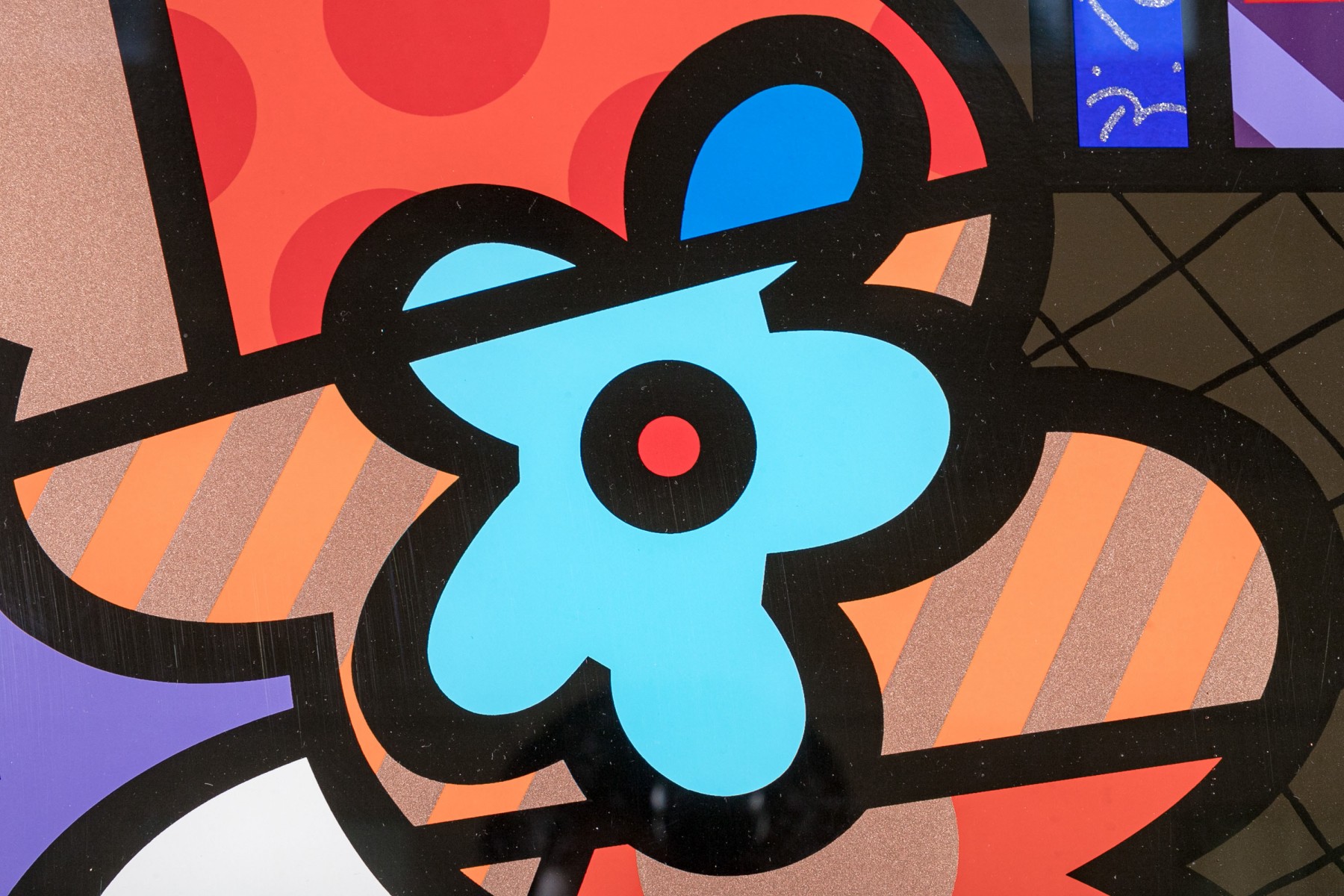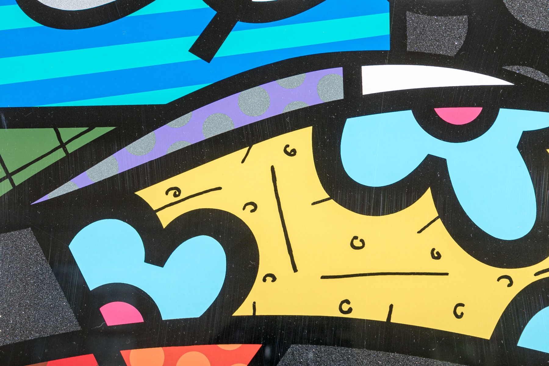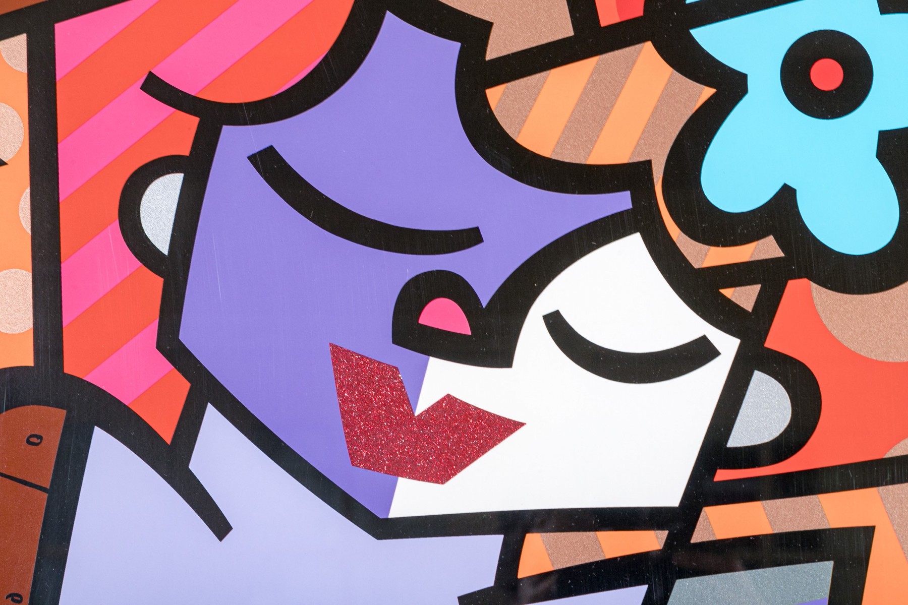 A captivating Romero Britto abstract lithograph "Downtown Girl". This limited edition piece is both signed and numbered on the lower margin as 81/150 and is elegantly framed in a black finished frame with a top light.