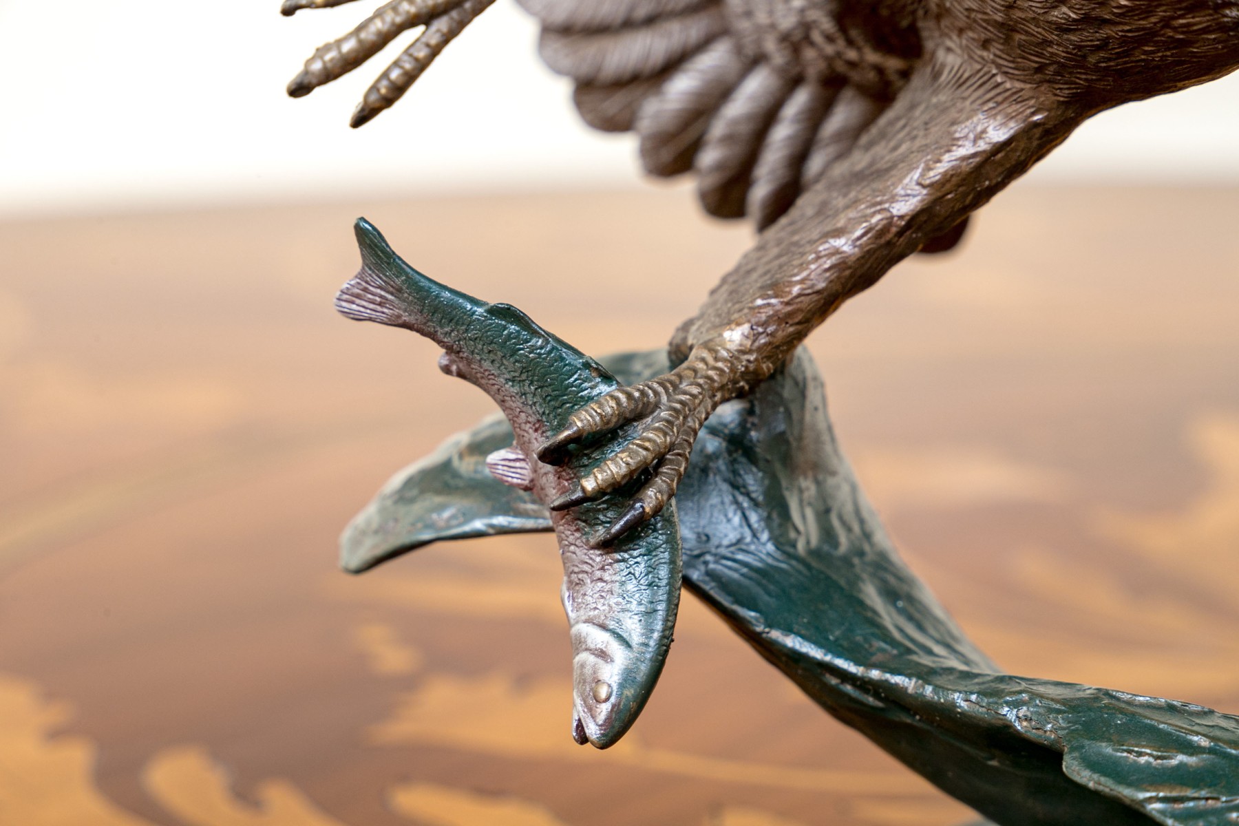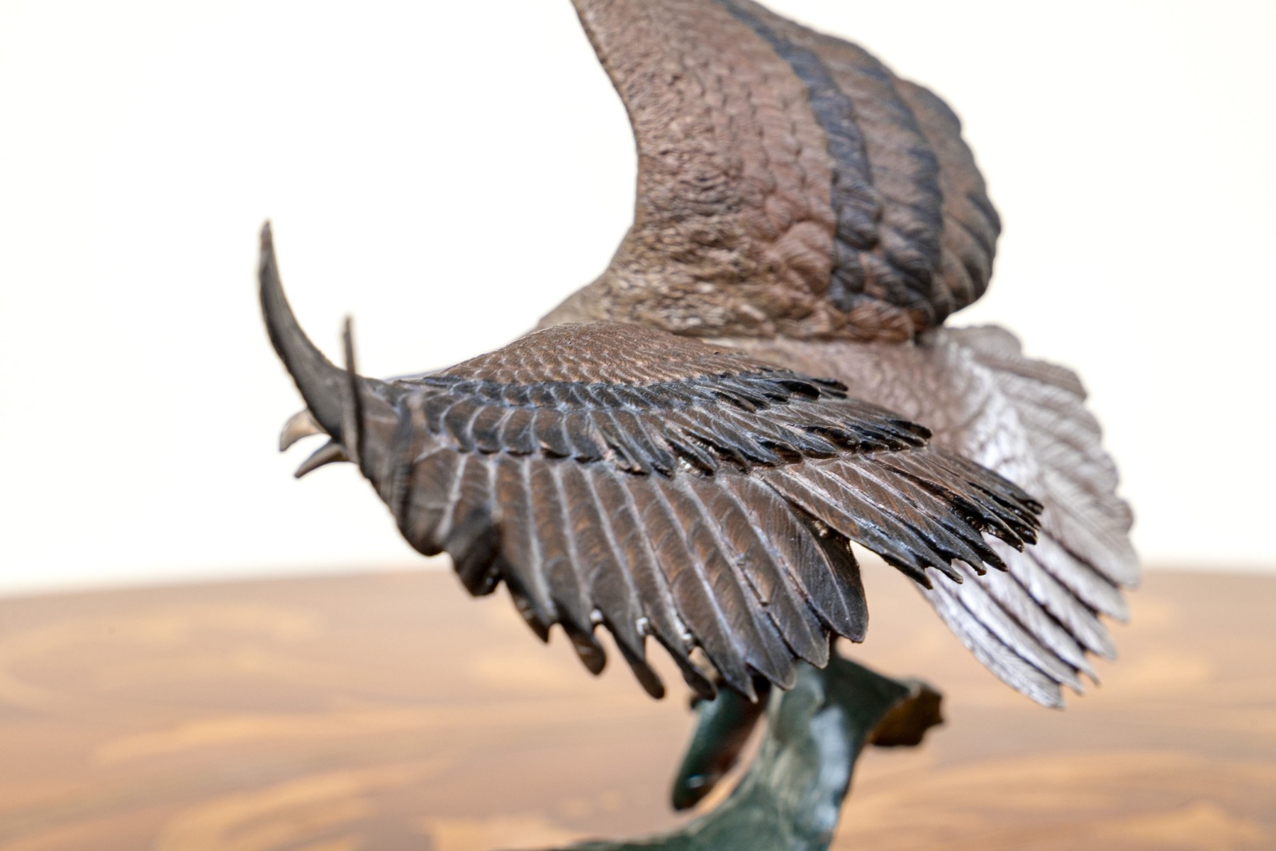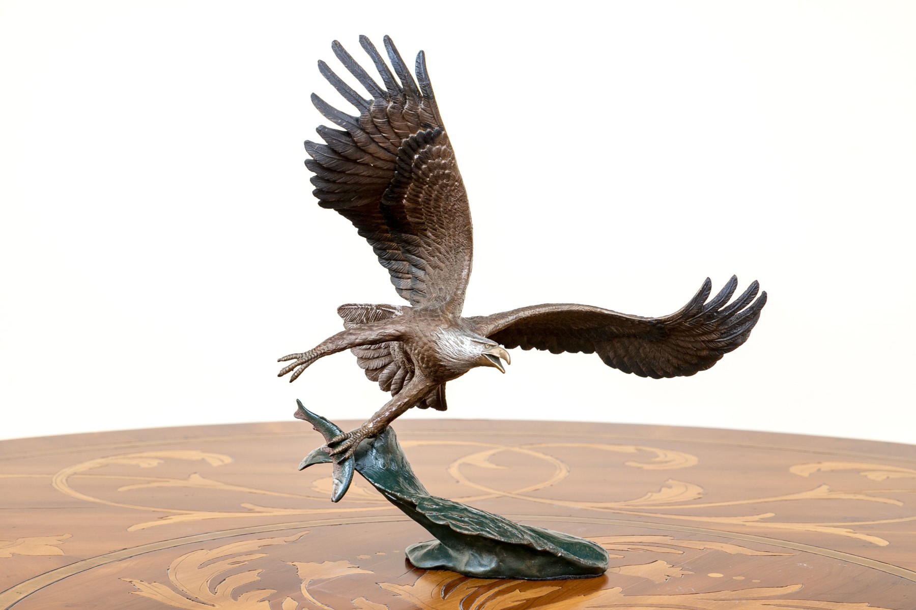 Ronald Van Ruyckevelt (British, b. 1928) For Franklin Mint “Master Of The Wilderness" bronze sculpture depicting an impressive eagle in flight carrying a fish out of a green wave. Beautifully formed and painted. Cast signature near the base.