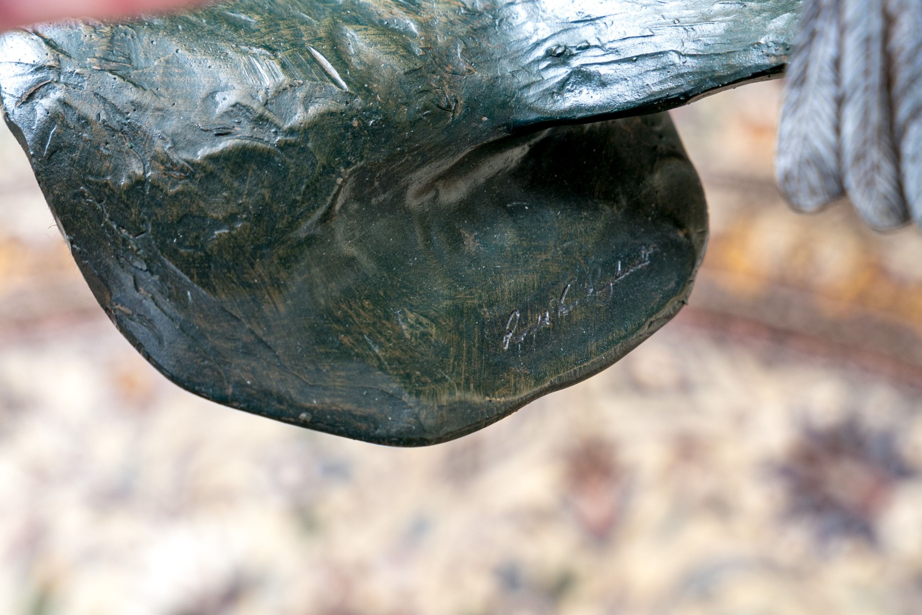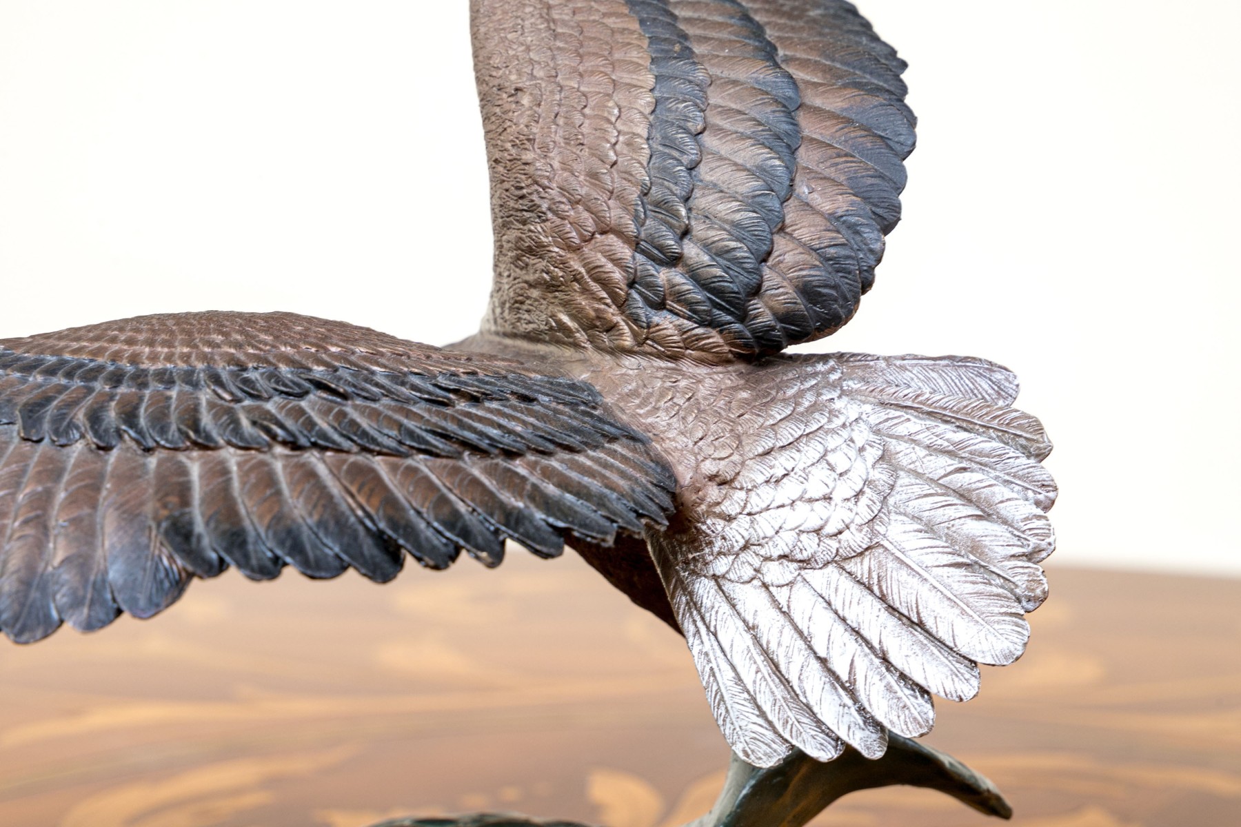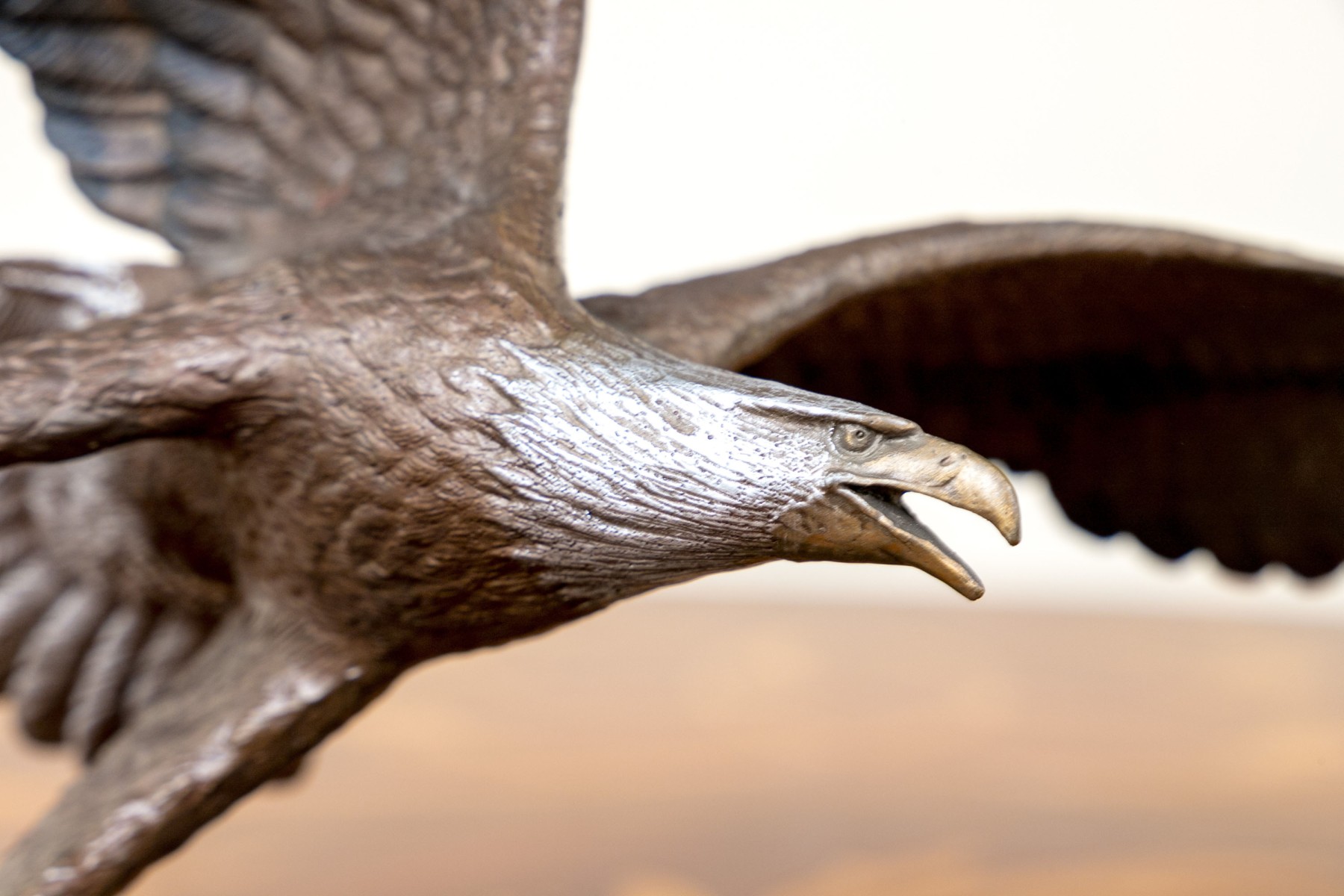 Ronald Van Ruyckevelt (British, b. 1928) For Franklin Mint “Master Of The Wilderness" bronze sculpture depicting an impressive eagle in flight carrying a fish out of a green wave. Beautifully formed and painted. Cast signature near the base.