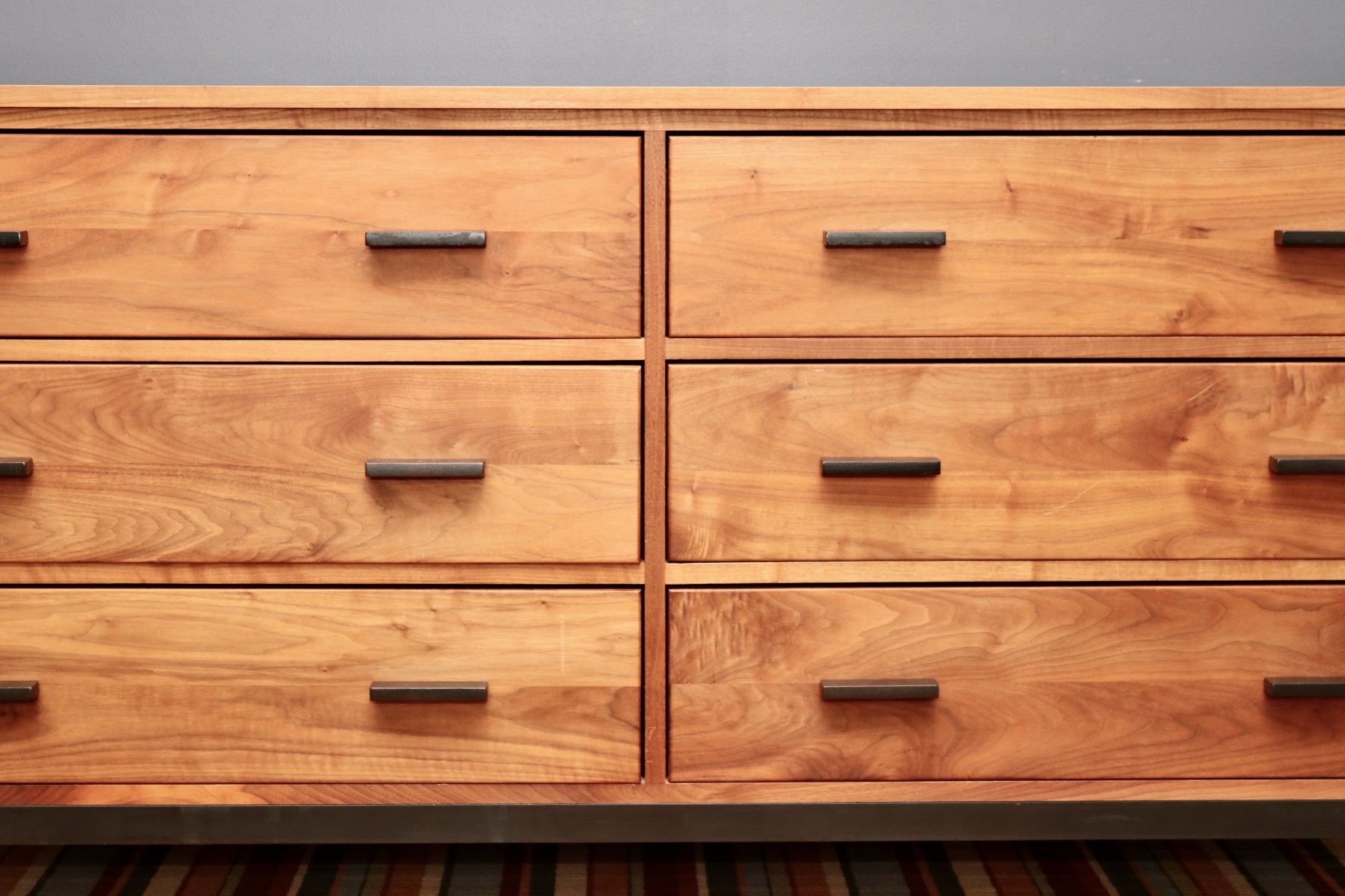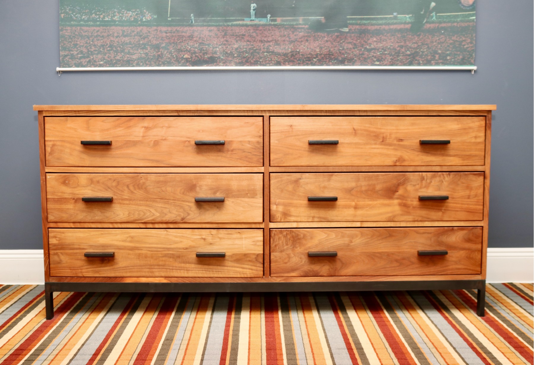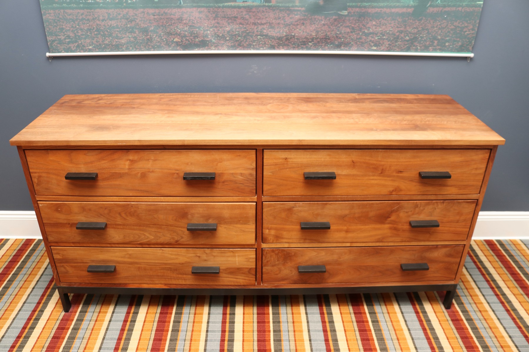 Crafted by hand in Wisconsin, this Room & Board dresser showcases modern design with warm natural cherry wood and a blackened steel base. Its clean, minimalist silhouette is enhanced by six spacious drawers. The rich wood grain adds warmth and organic beauty, while the industrial steel elements lend a subtle edge. This piece works seamlessly in both contemporary and transitional interiors.
