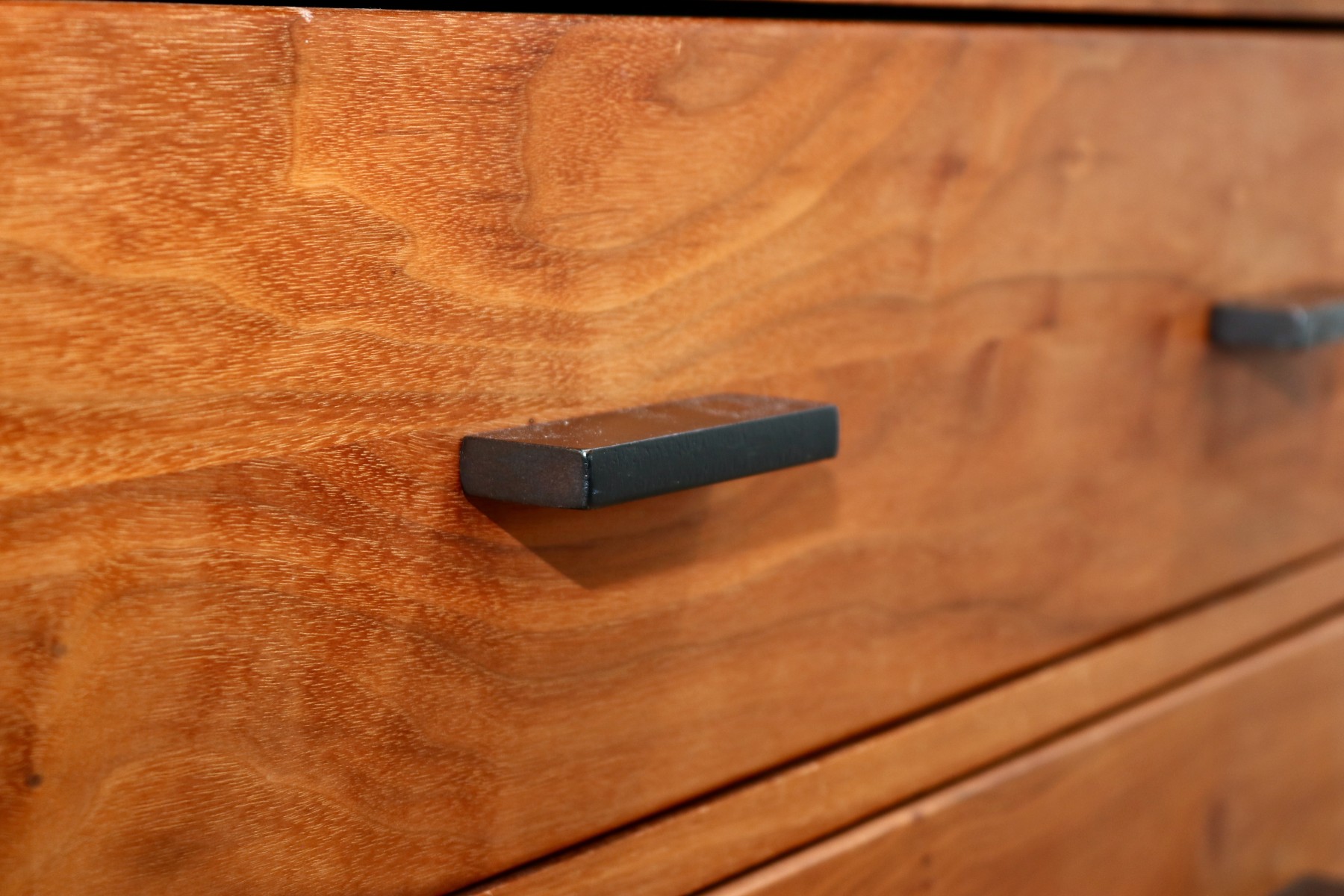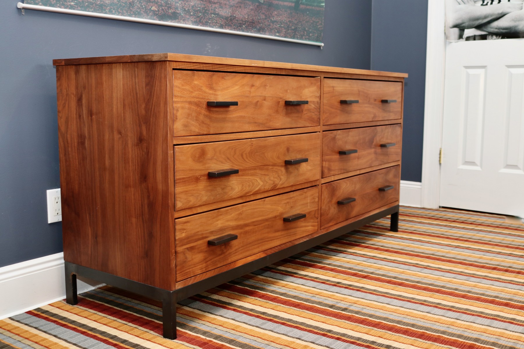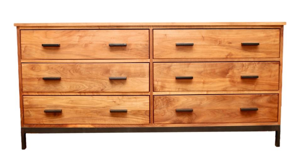 Crafted by hand in Wisconsin, this Room & Board dresser showcases modern design with warm natural cherry wood and a blackened steel base. Its clean, minimalist silhouette is enhanced by six spacious drawers. The rich wood grain adds warmth and organic beauty, while the industrial steel elements lend a subtle edge. This piece works seamlessly in both contemporary and transitional interiors.