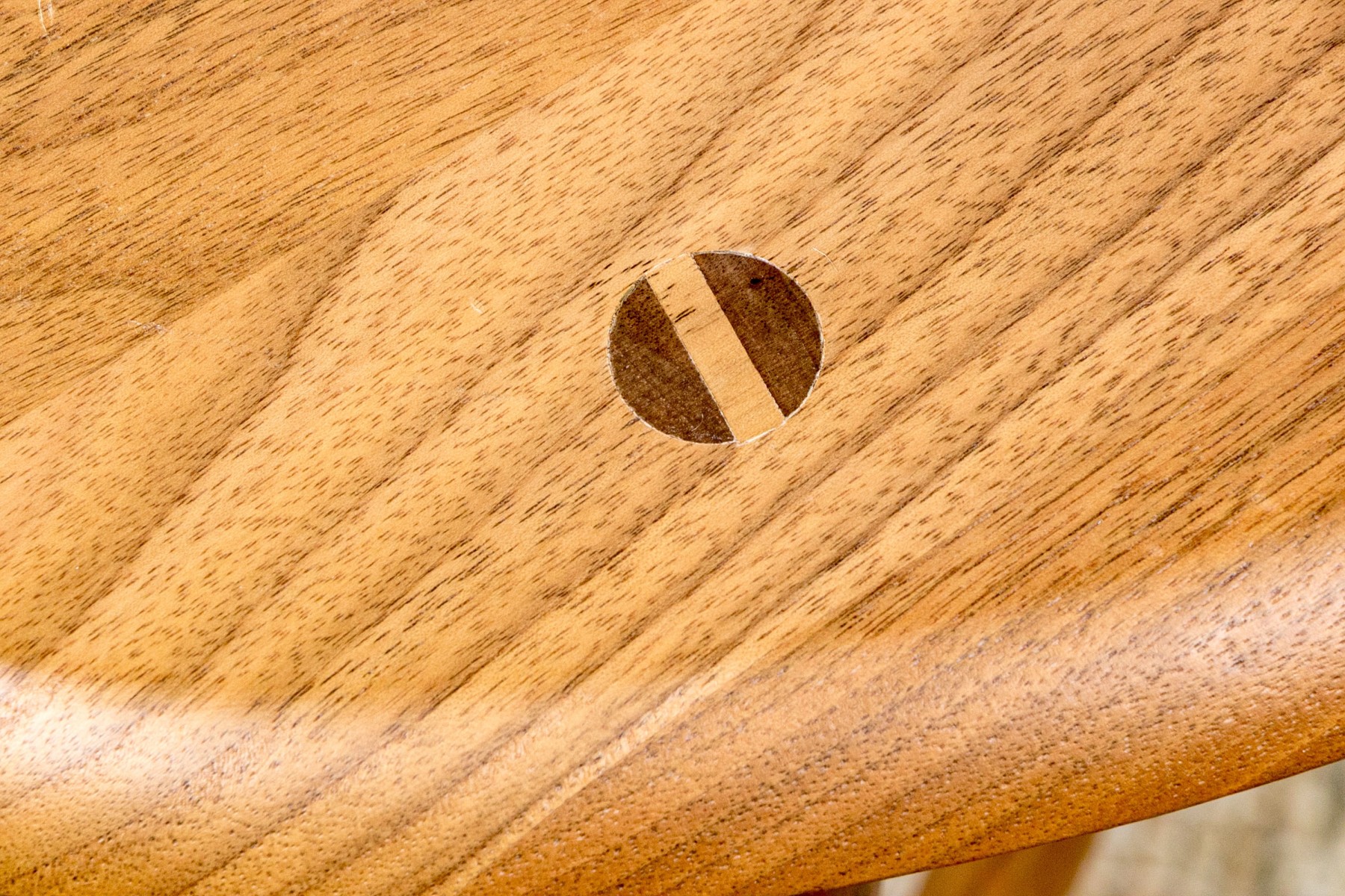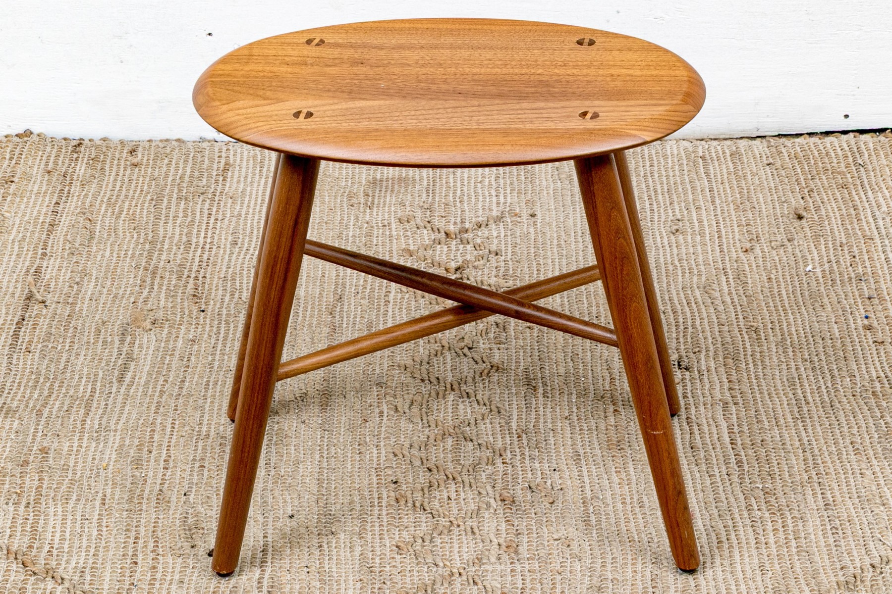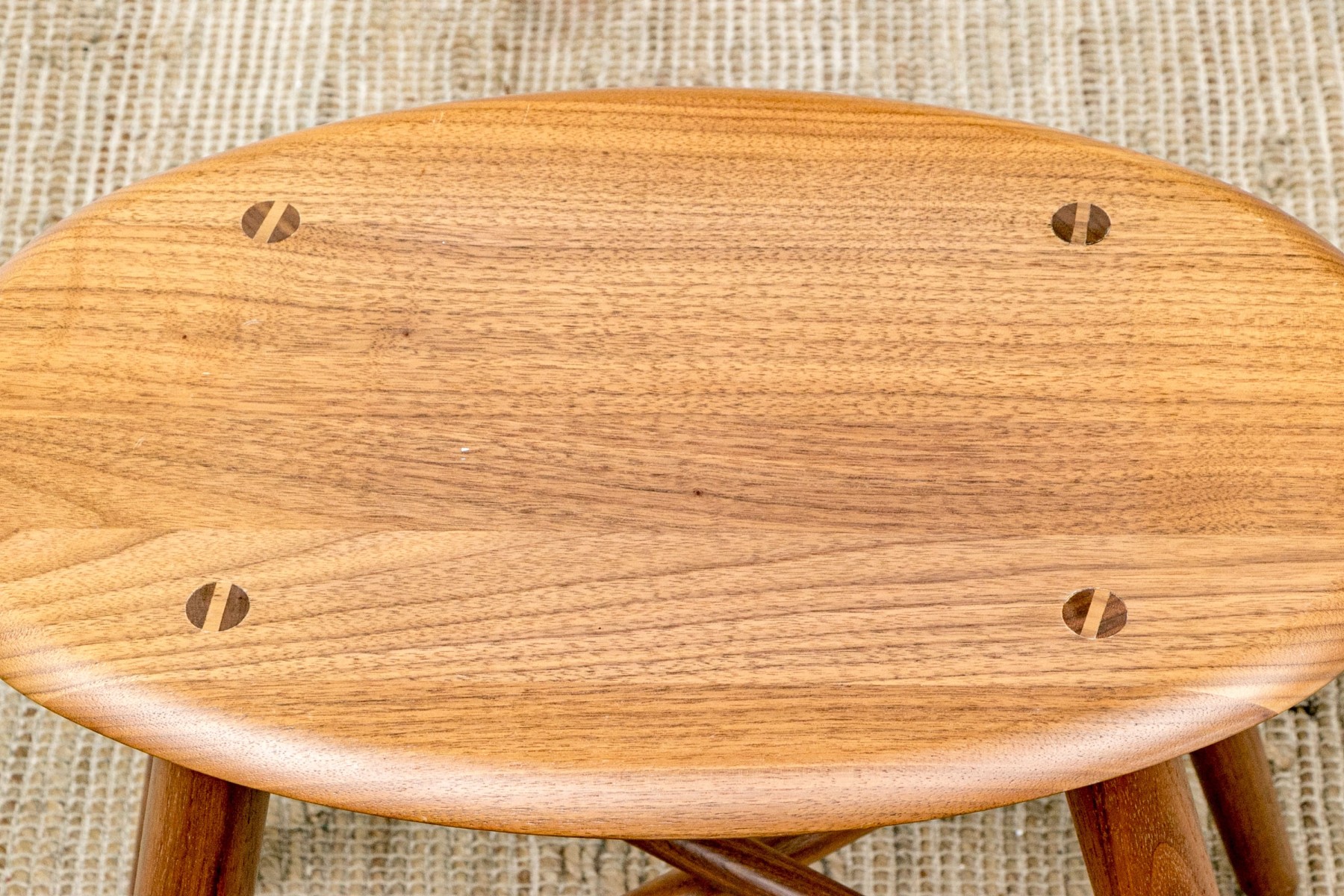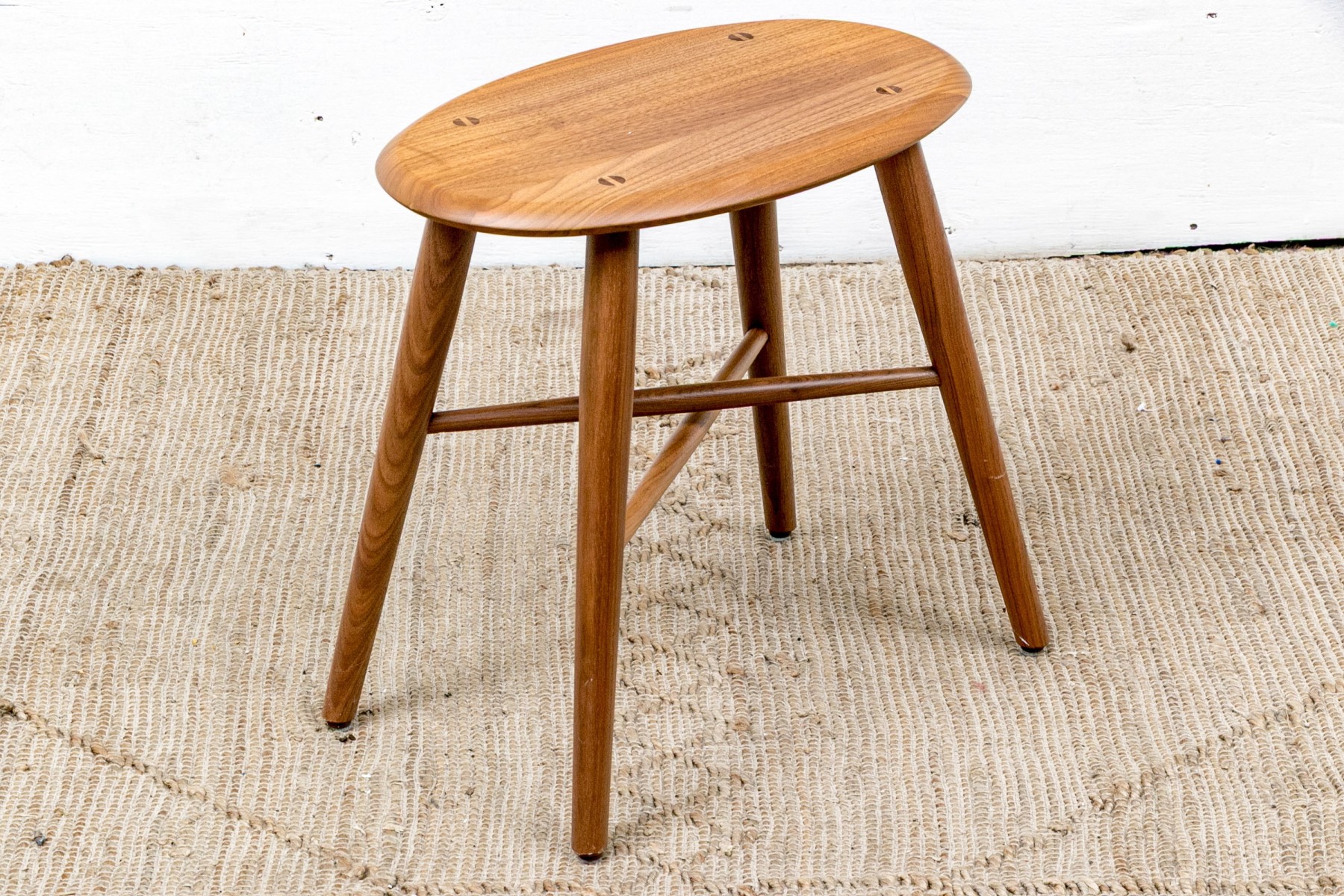The oval stool finely constructed with dowels on the seat. The four cylindrical tapering and splayed legs with a staggered X stretcher. With felt on the bottoms of the feet.