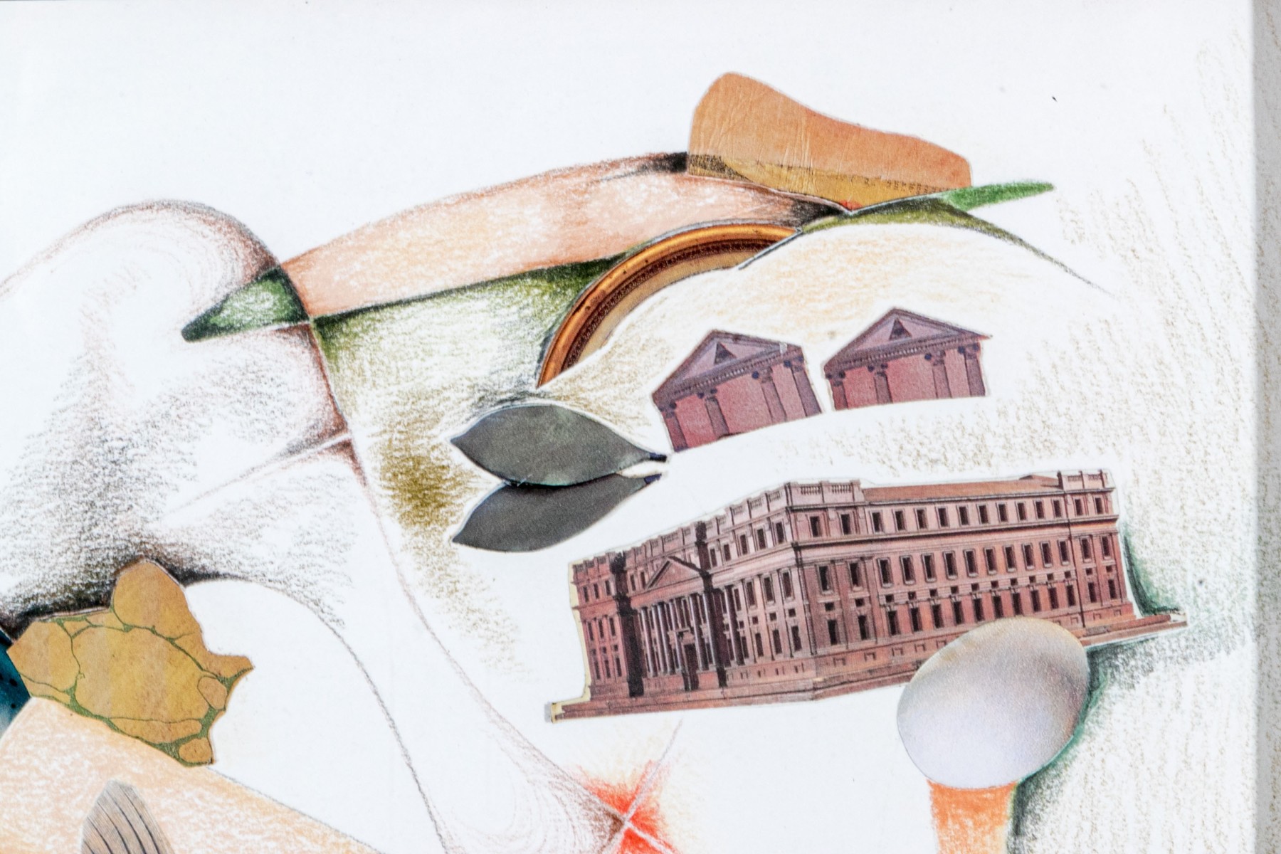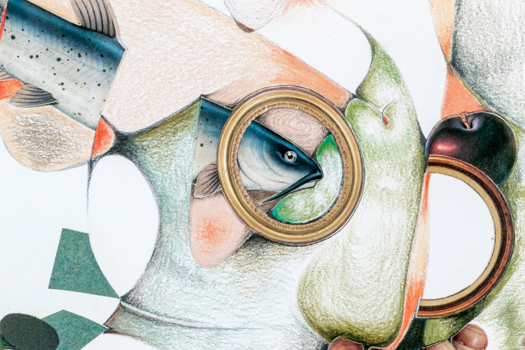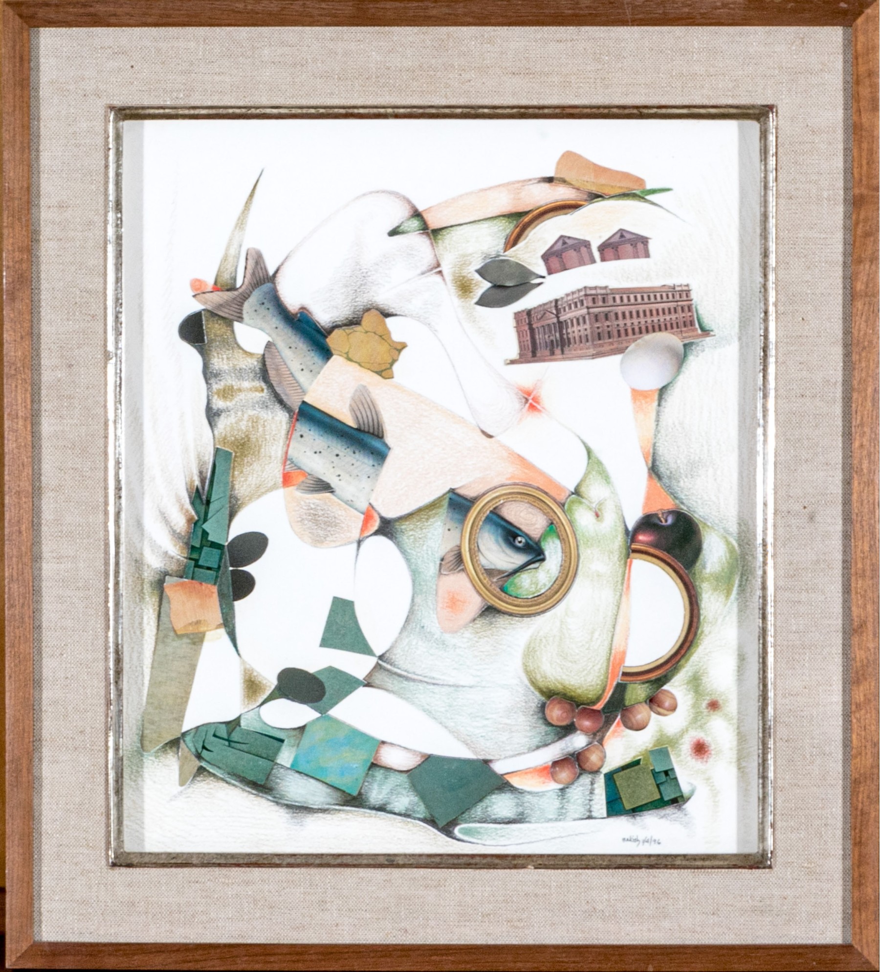 Rosette Bakish (American, 1931-2008) "Good Catch" mixed media on paper depicting a collage of architectural elements, fish, and fruit along abstract, organic colored pencil forms in soft green, blue, and ochre against a white ground. Signed lower right. Labeled on the verso.
