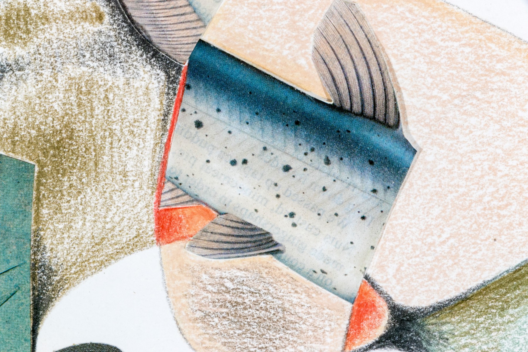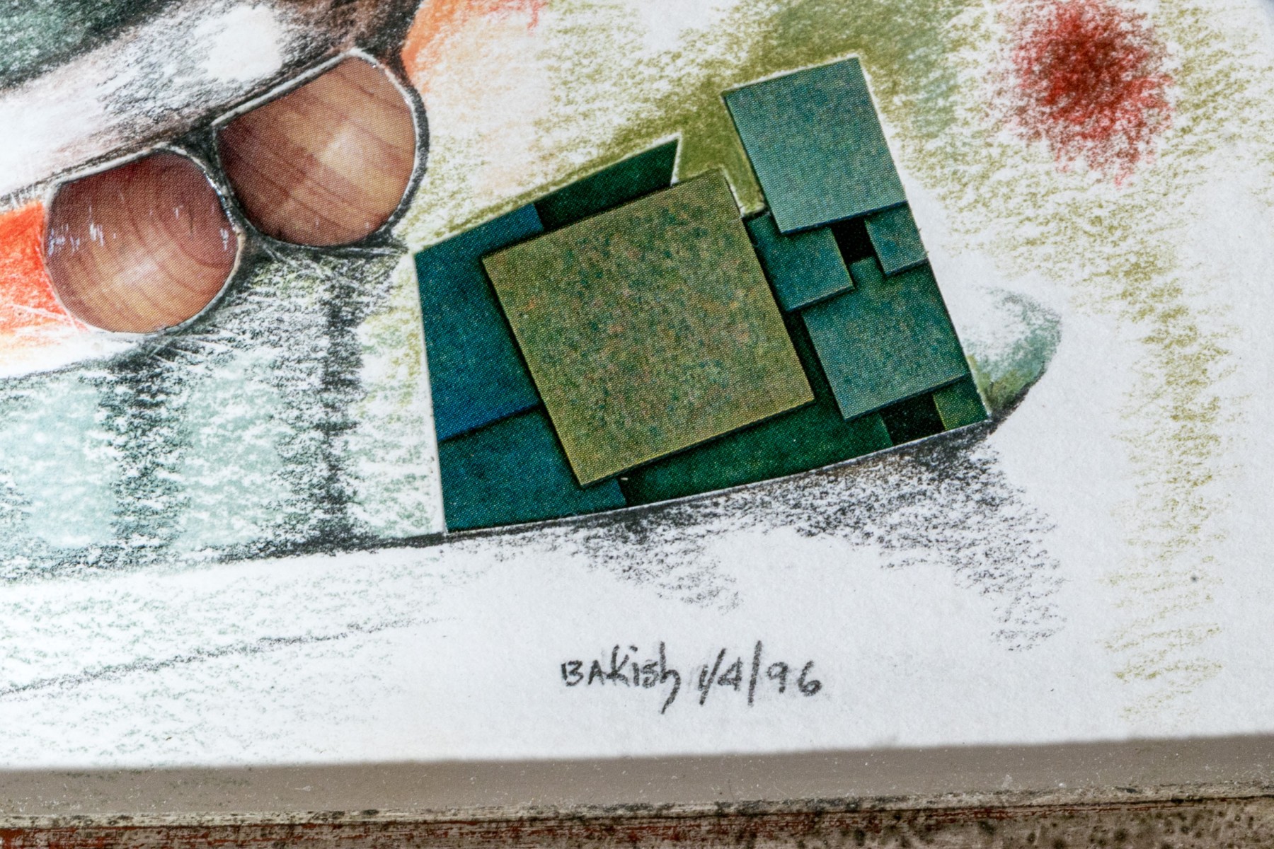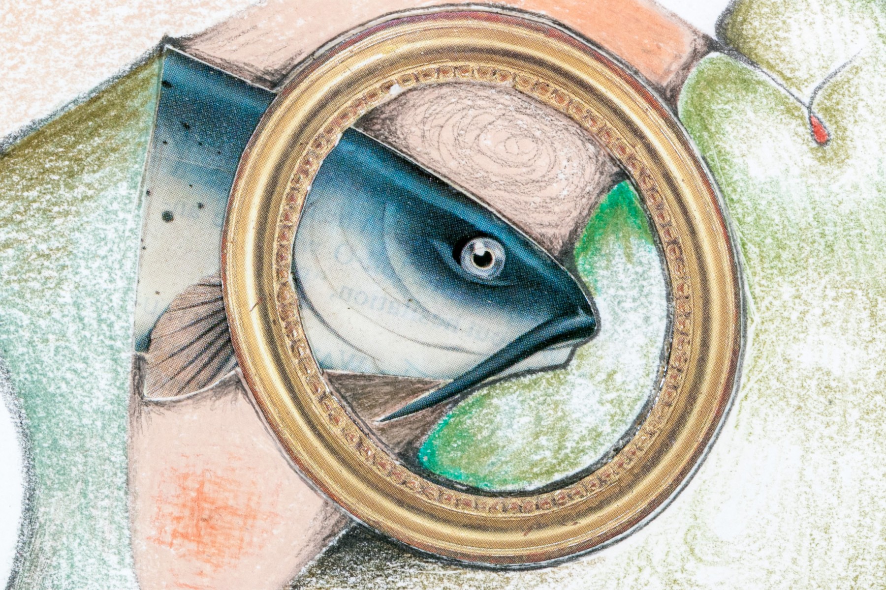 Rosette Bakish (American, 1931-2008) "Good Catch" mixed media on paper depicting a collage of architectural elements, fish, and fruit along abstract, organic colored pencil forms in soft green, blue, and ochre against a white ground. Signed lower right. Labeled on the verso.