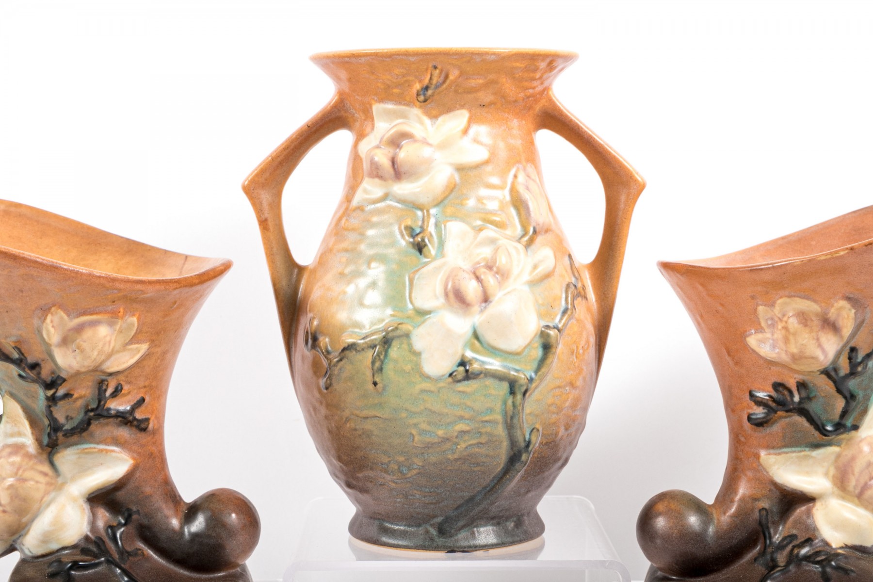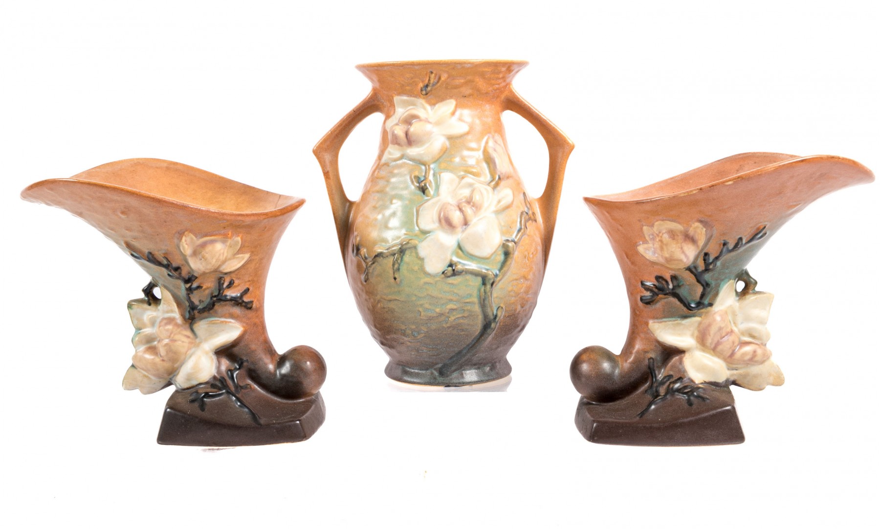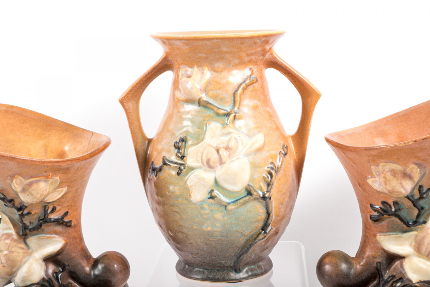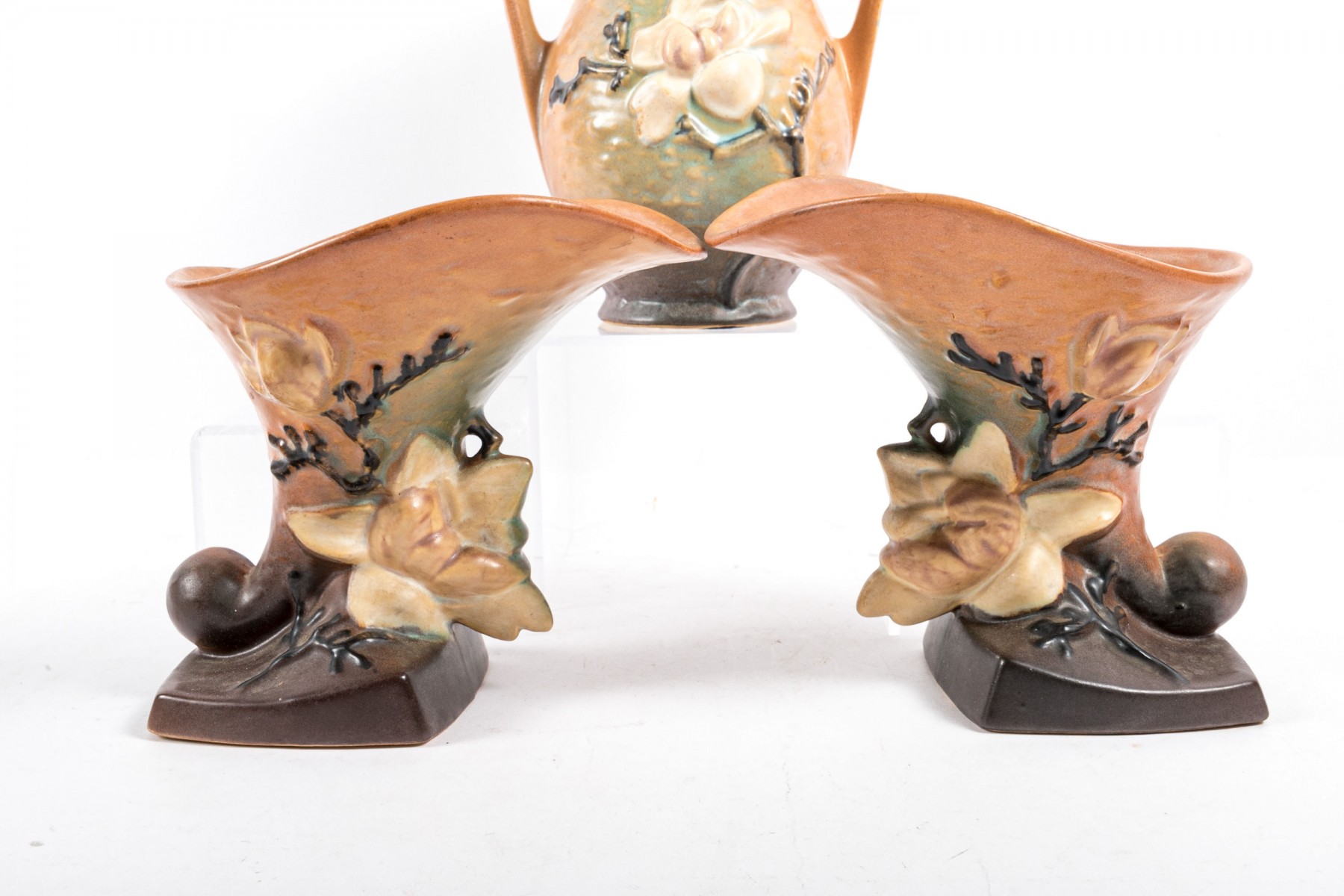 Garniture trio of Roseville Pottery ceramic vases including a matching pair of 184 cornucopias with cream magnolia designs, and a 90 vase with magnolia relief and angular handles.