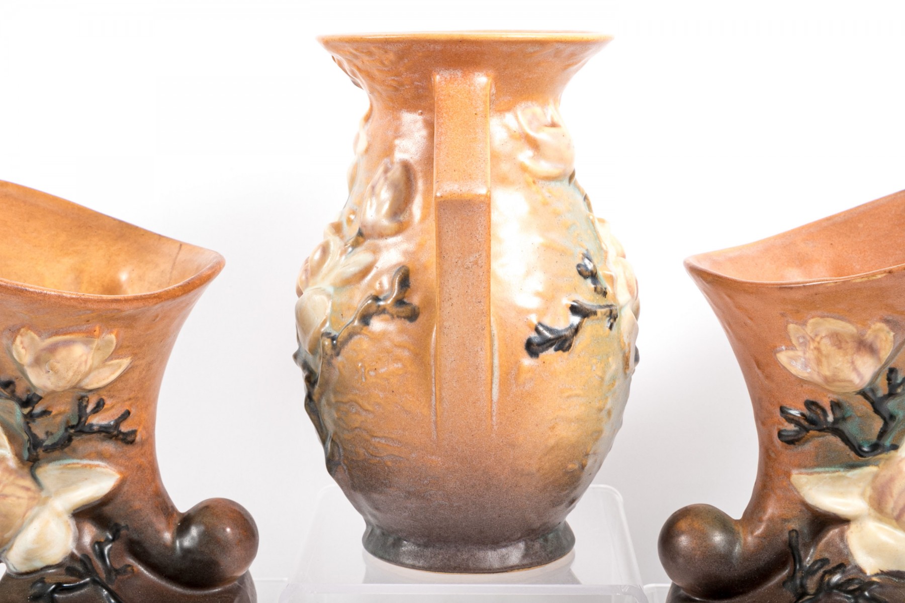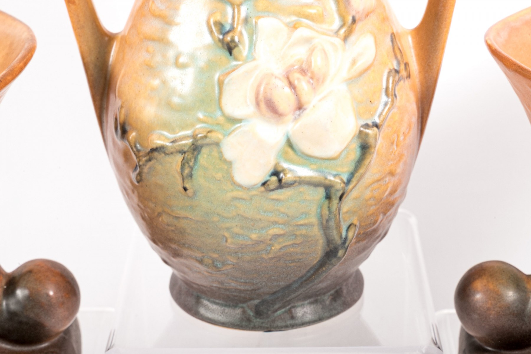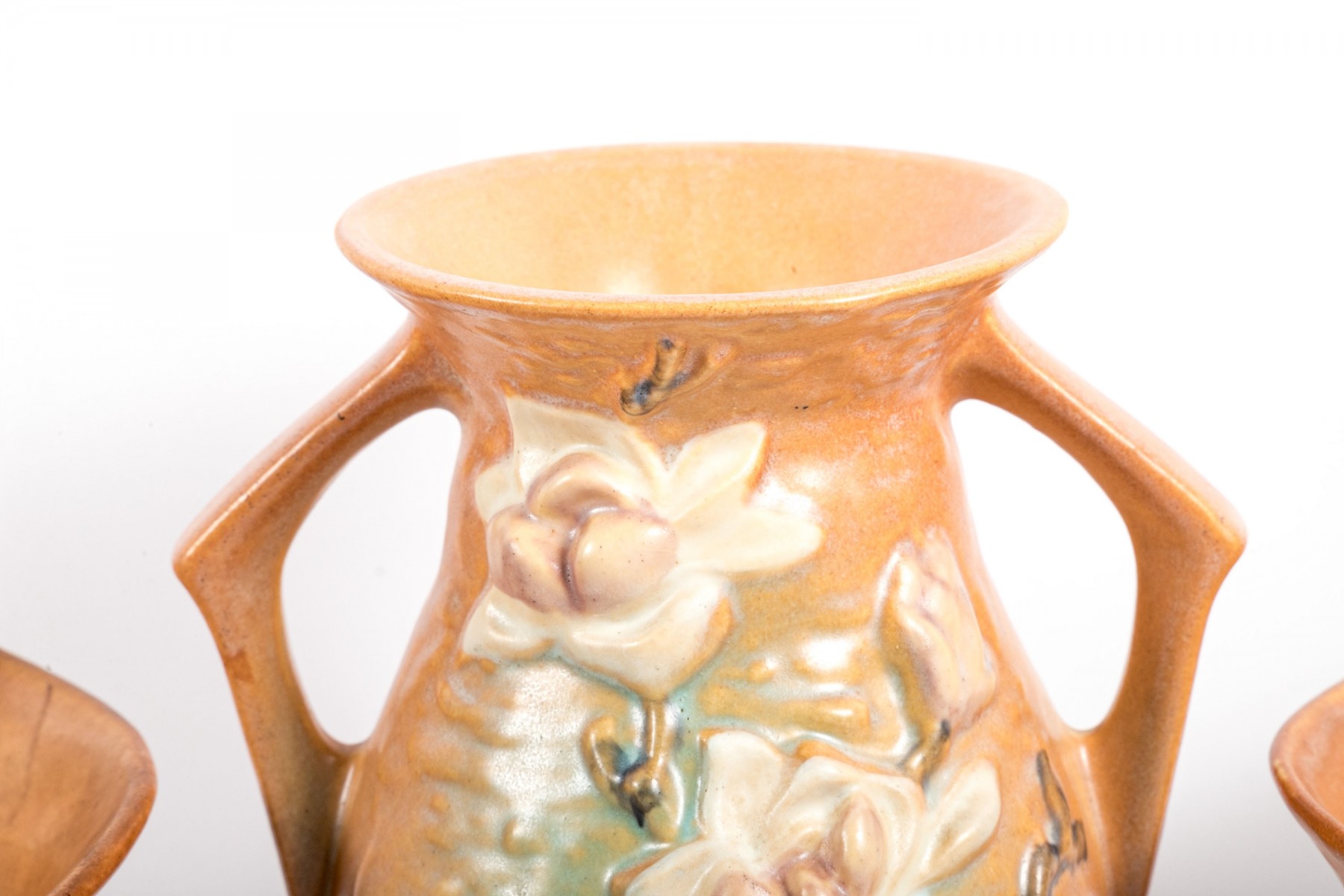 Garniture trio of Roseville Pottery ceramic vases including a matching pair of 184 cornucopias with cream magnolia designs, and a 90 vase with magnolia relief and angular handles.
