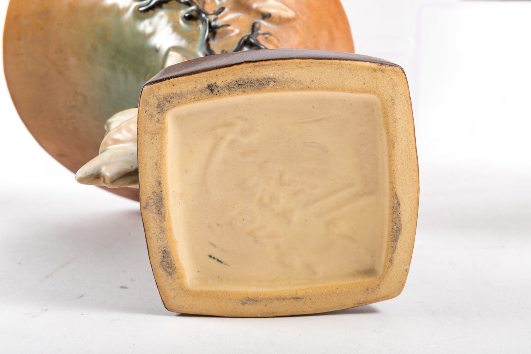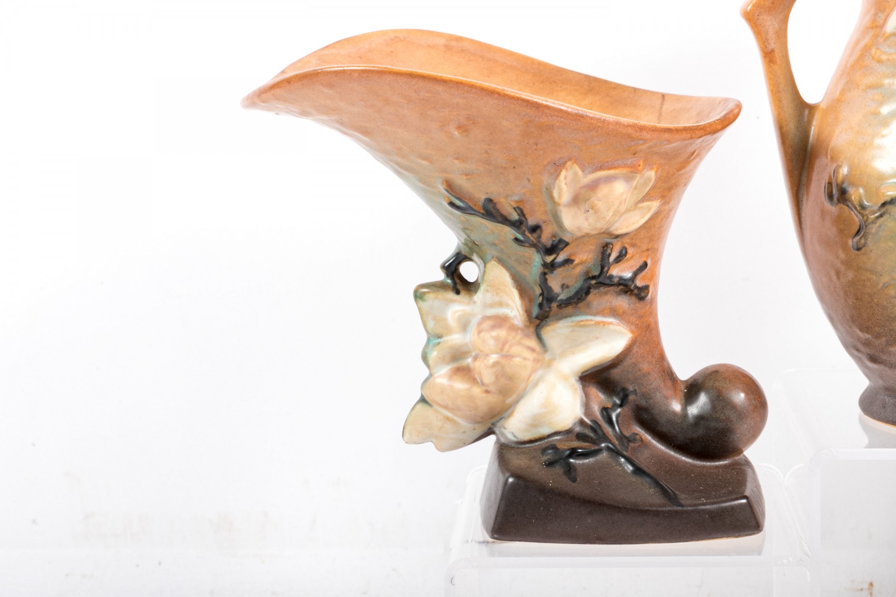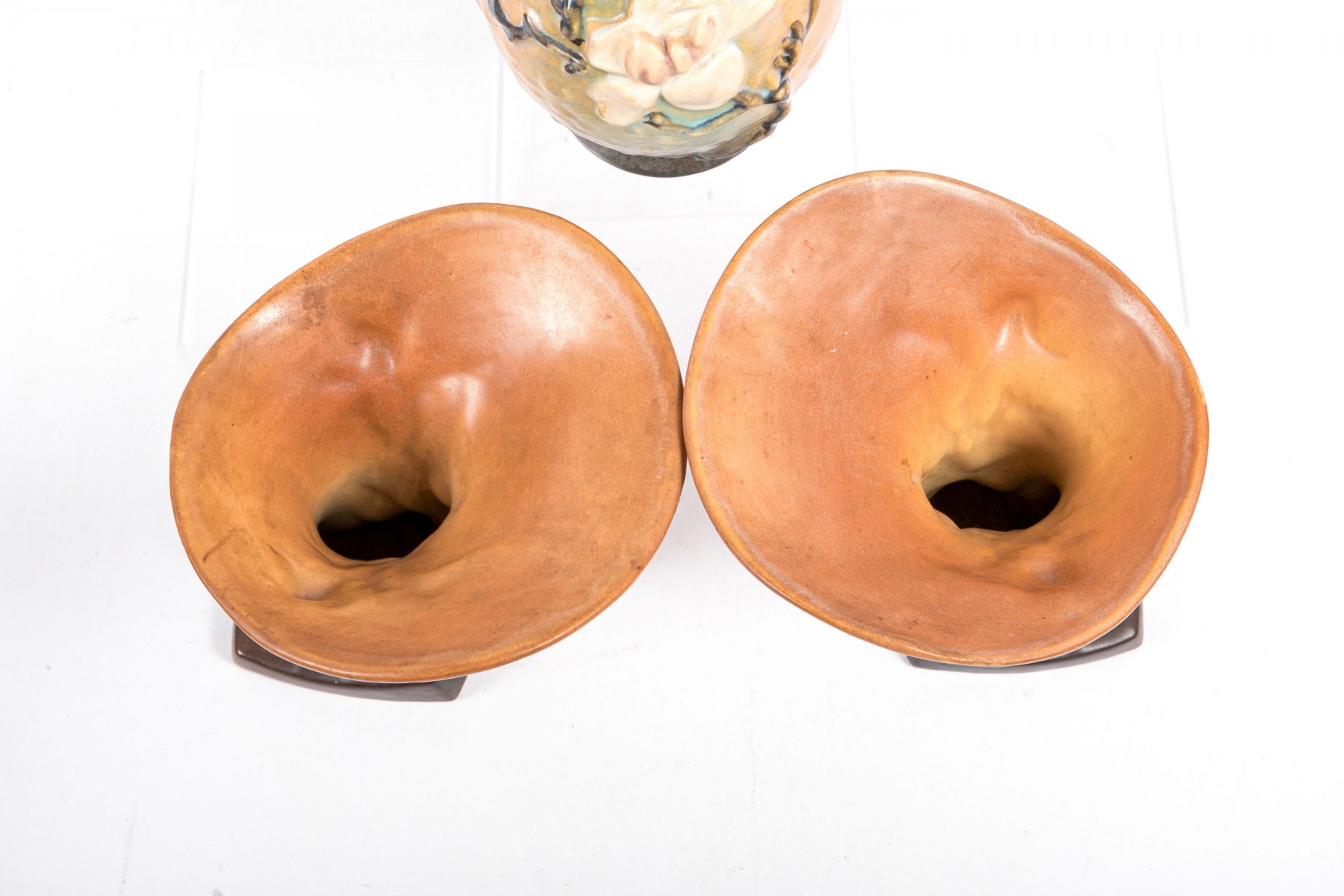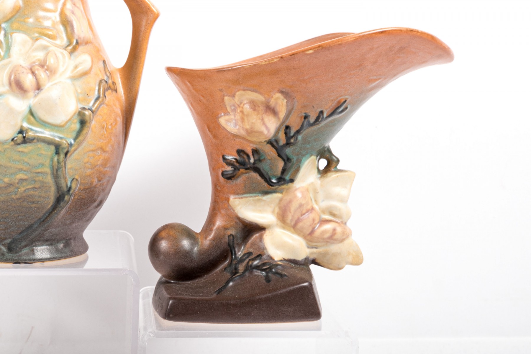 Garniture trio of Roseville Pottery ceramic vases including a matching pair of 184 cornucopias with cream magnolia designs, and a 90 vase with magnolia relief and angular handles.
