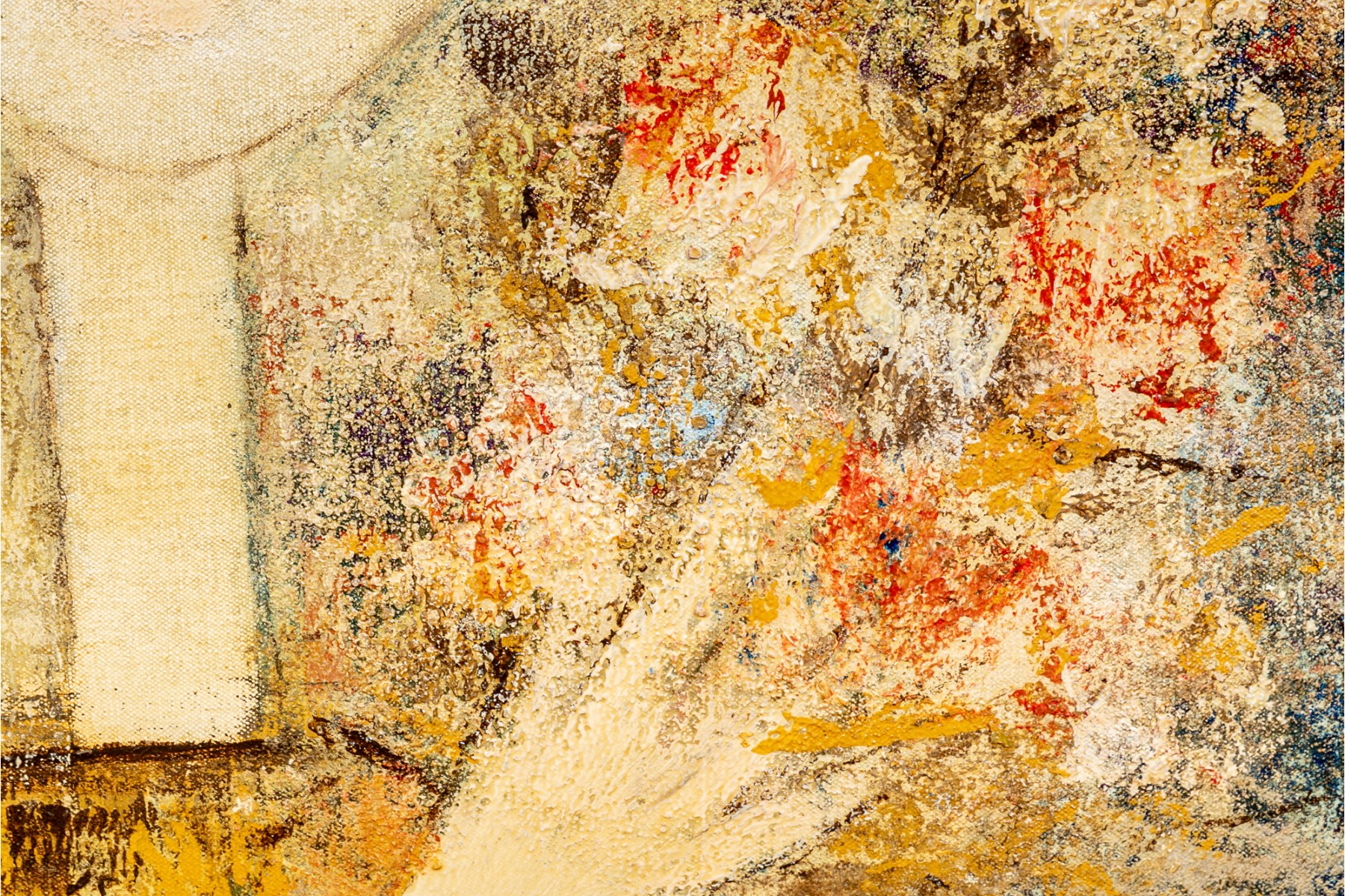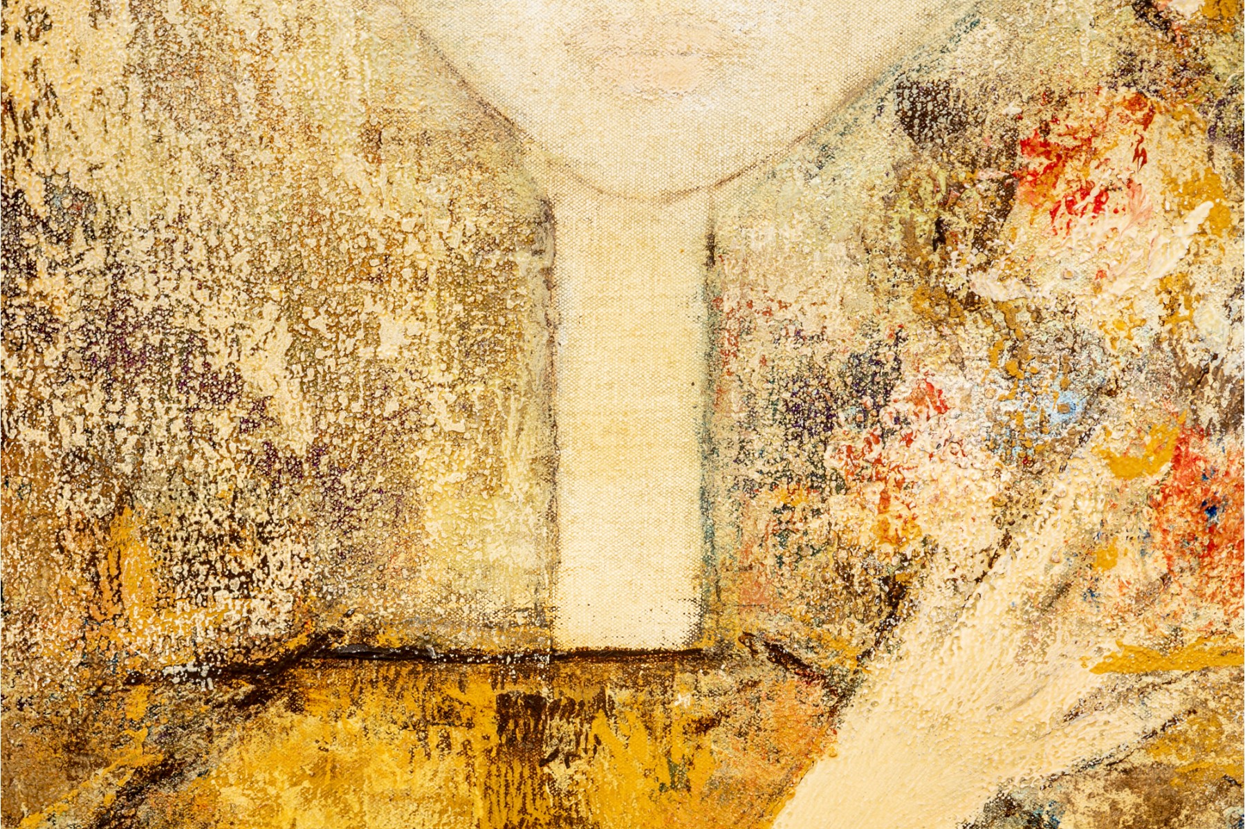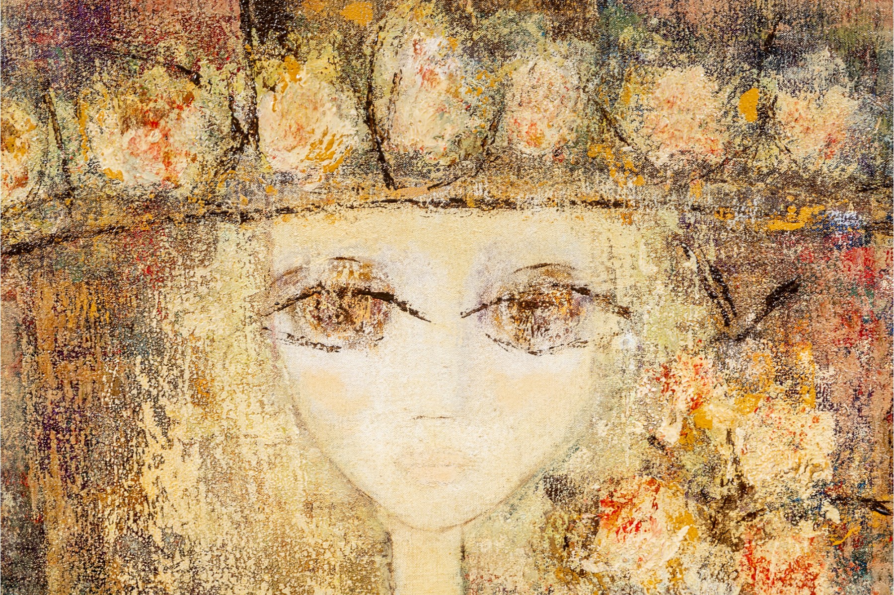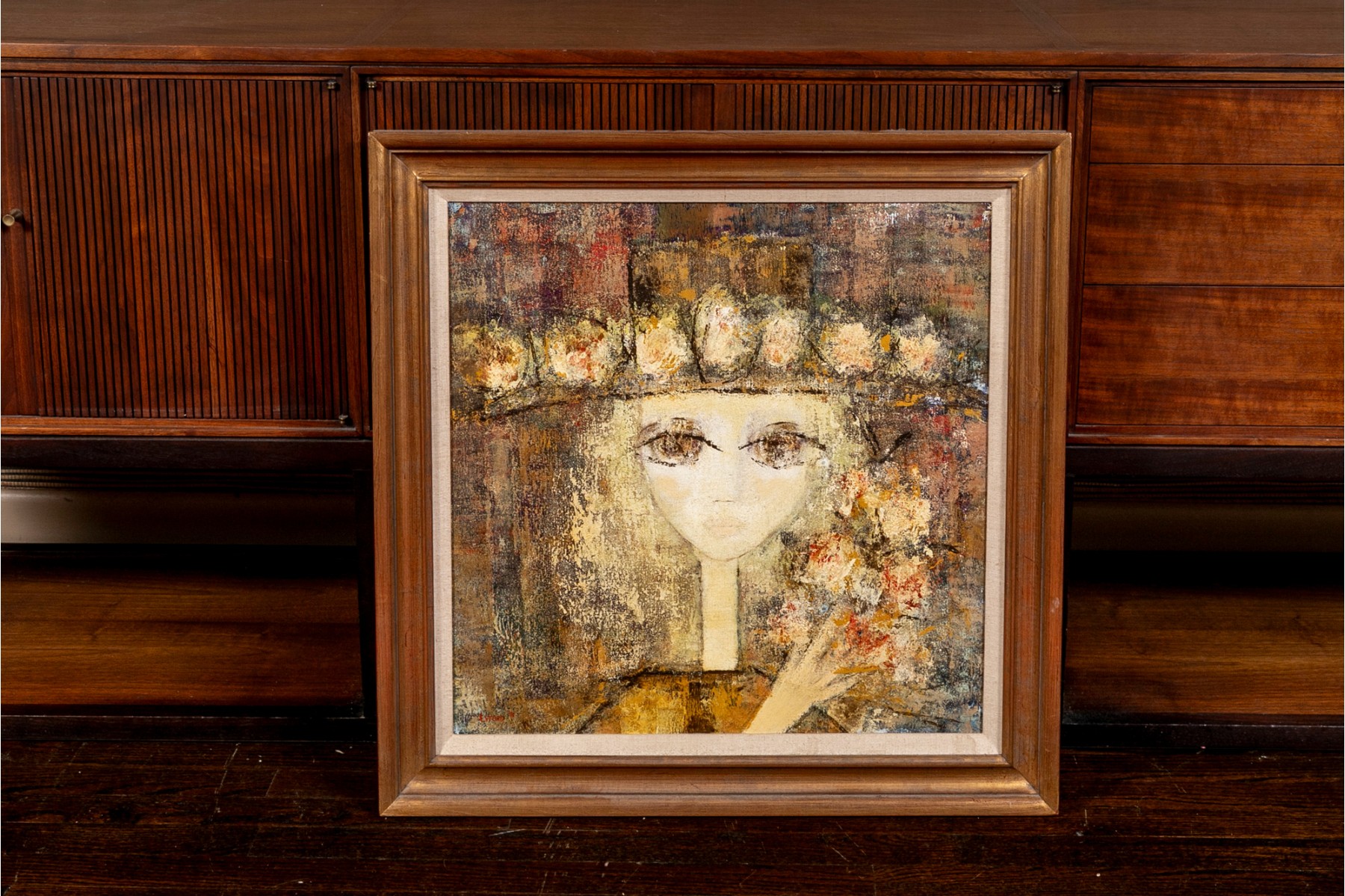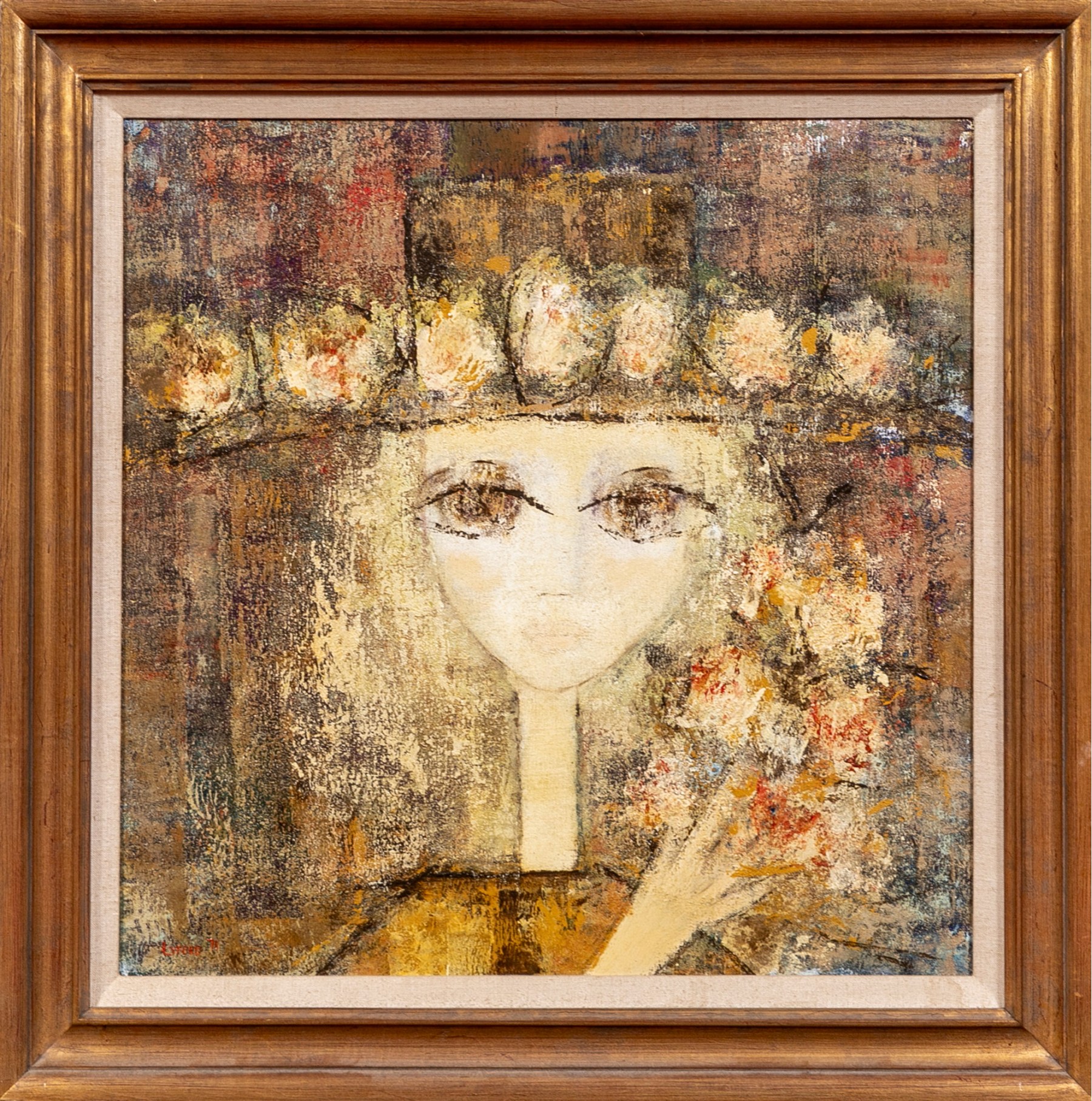 Oil on canvas depicting a woman with prominent eyes wearing a hat decorated with flowers and holding flowers as well.