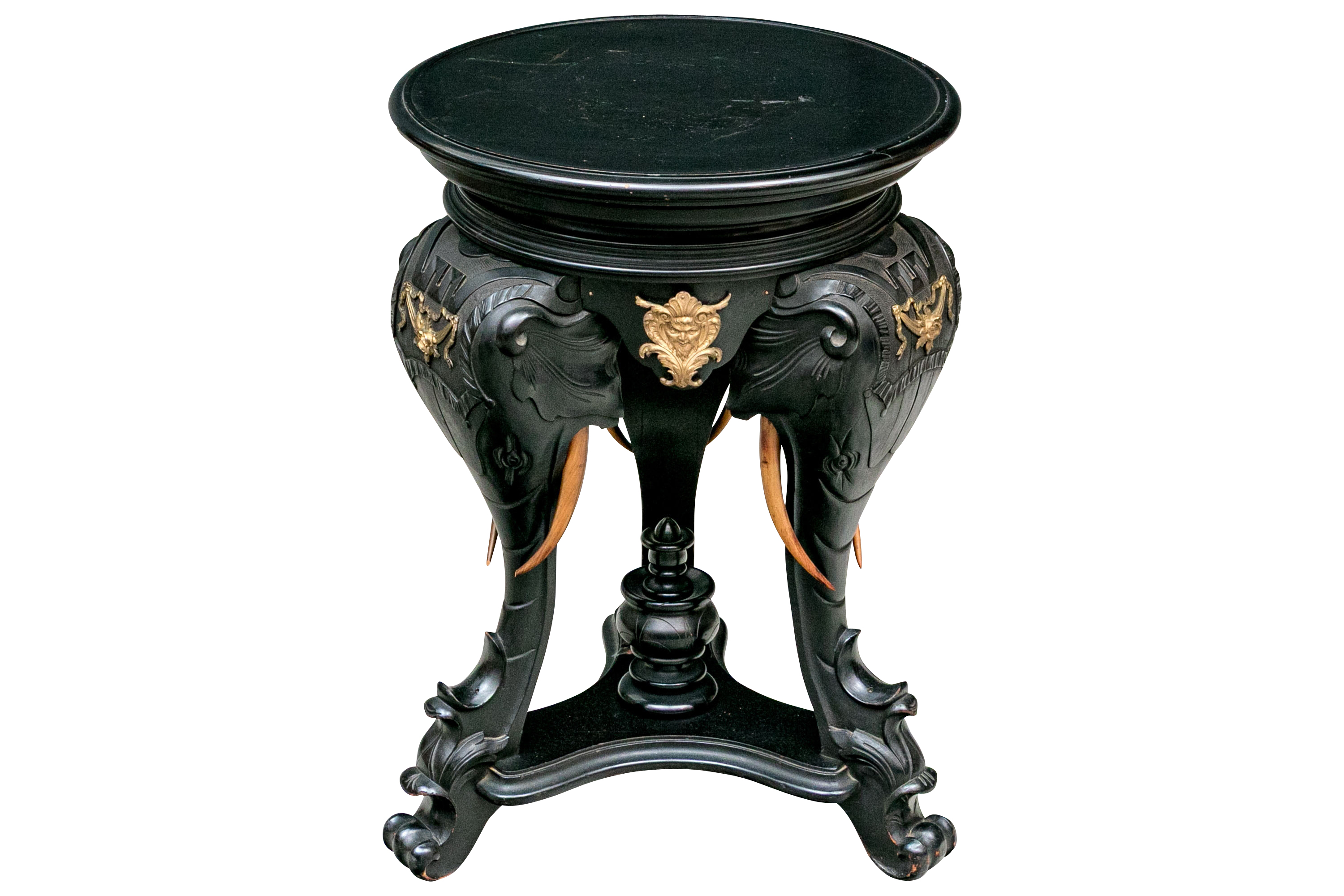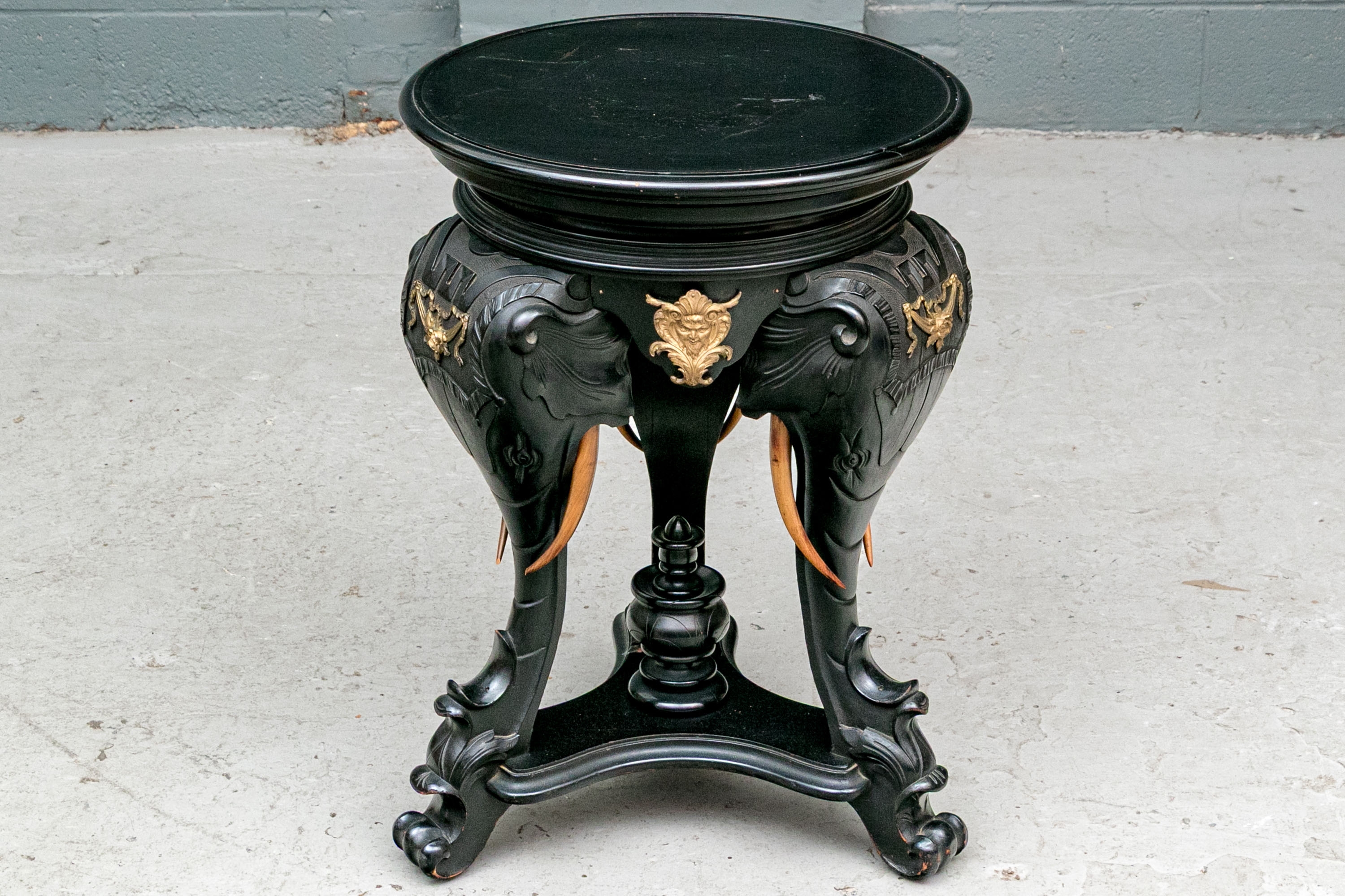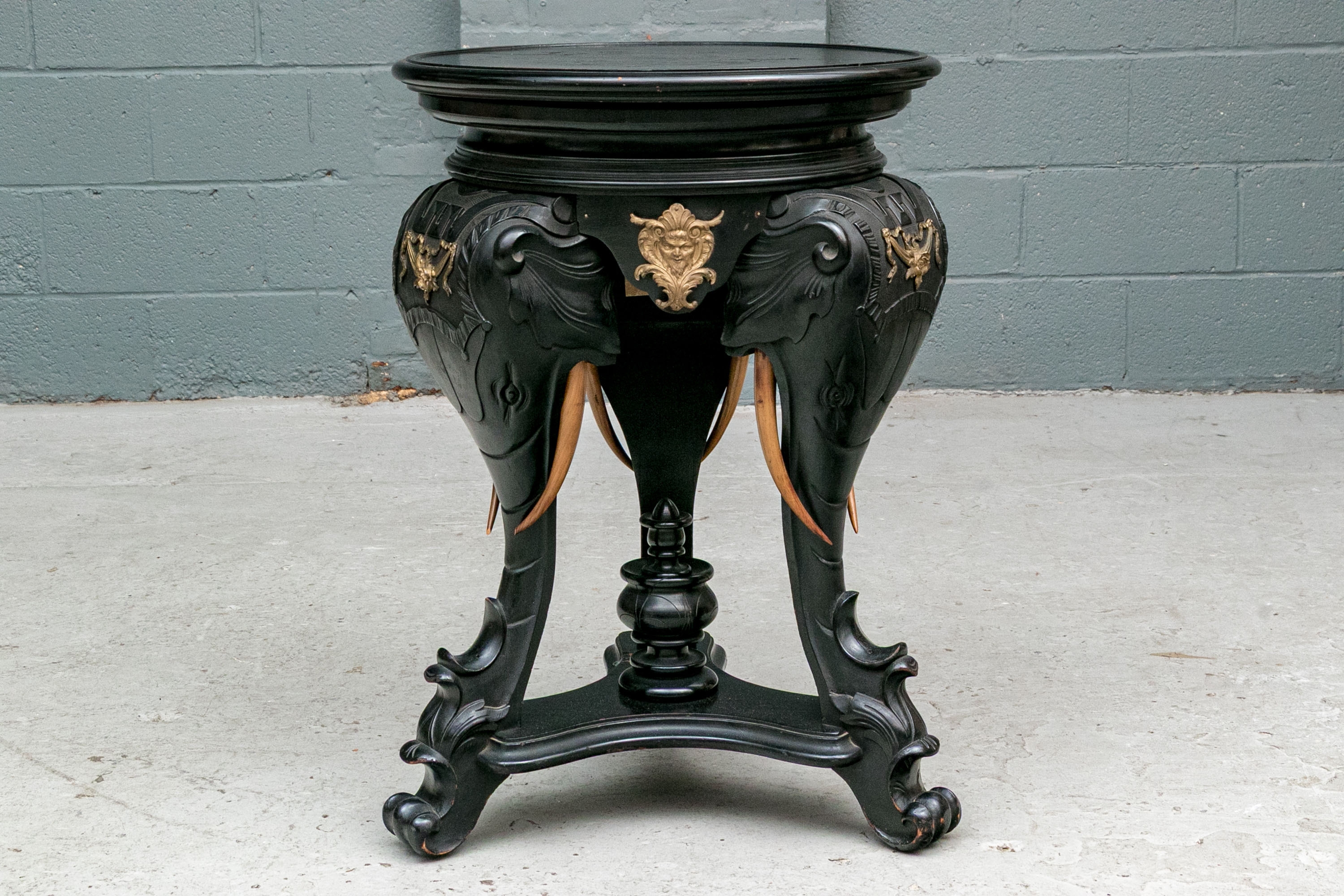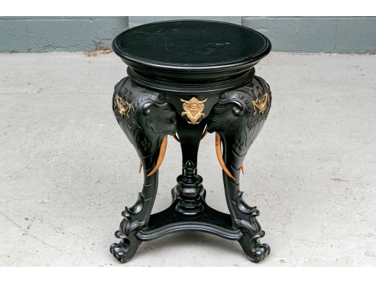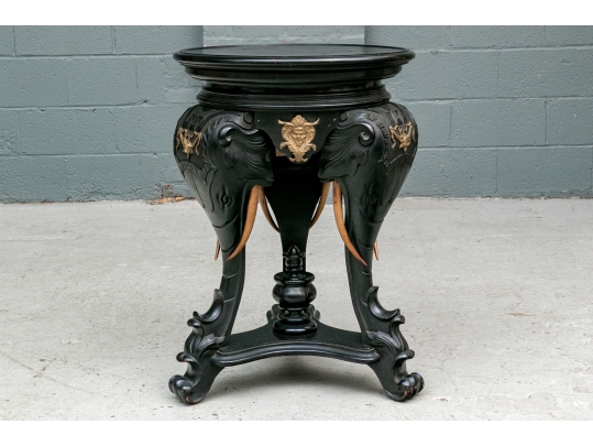 An ebonized side table or pedestal comprised of three well carved elephant heads with decorative bronze mounts. The elephants heads with contrasting carved wood tusks. The elephant heads alternate with bronze classical or mythological figural masks on the apron, possibly a satyr or a bacchic mask. The stand is raised up on a triangular plinth with a bold central final.
