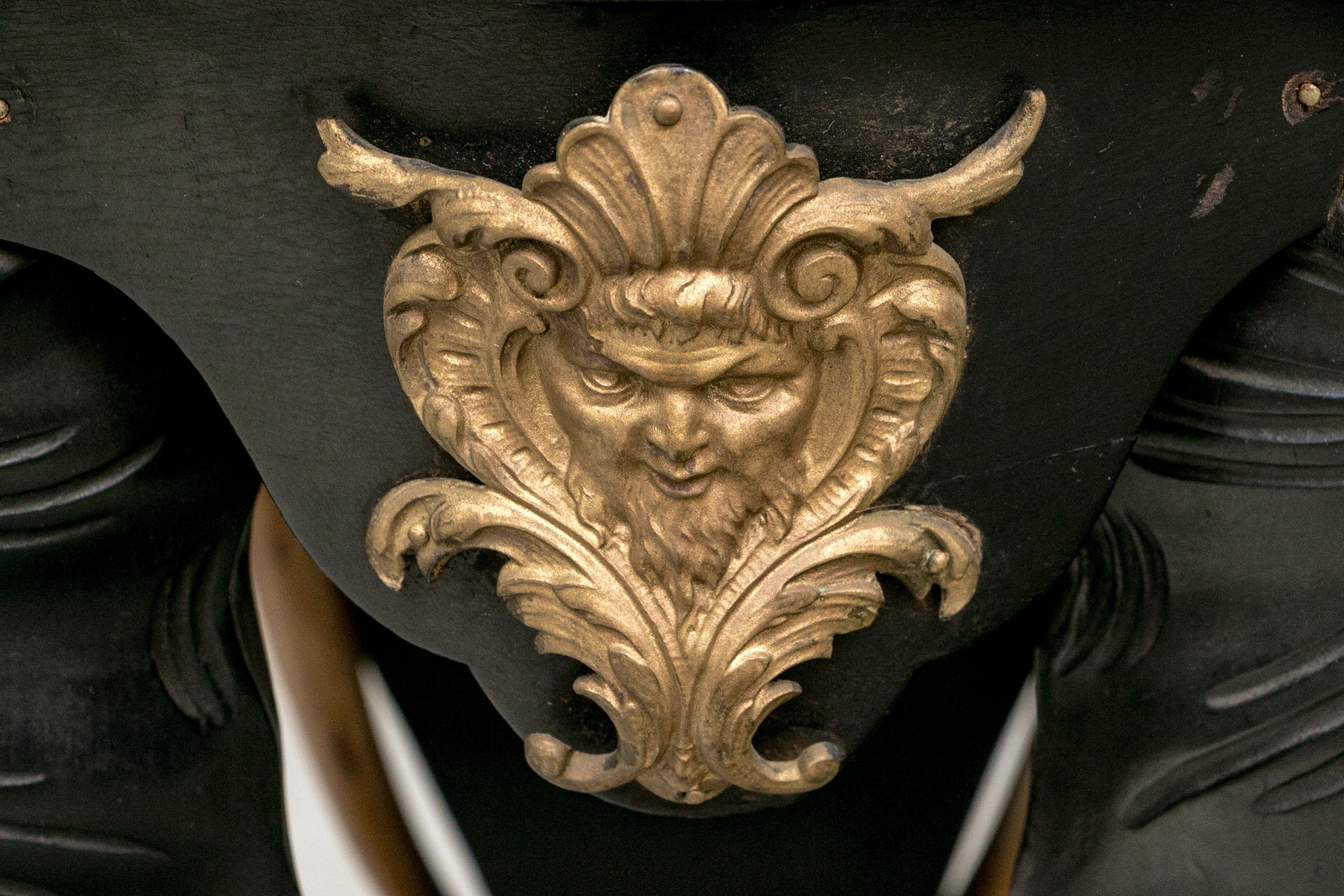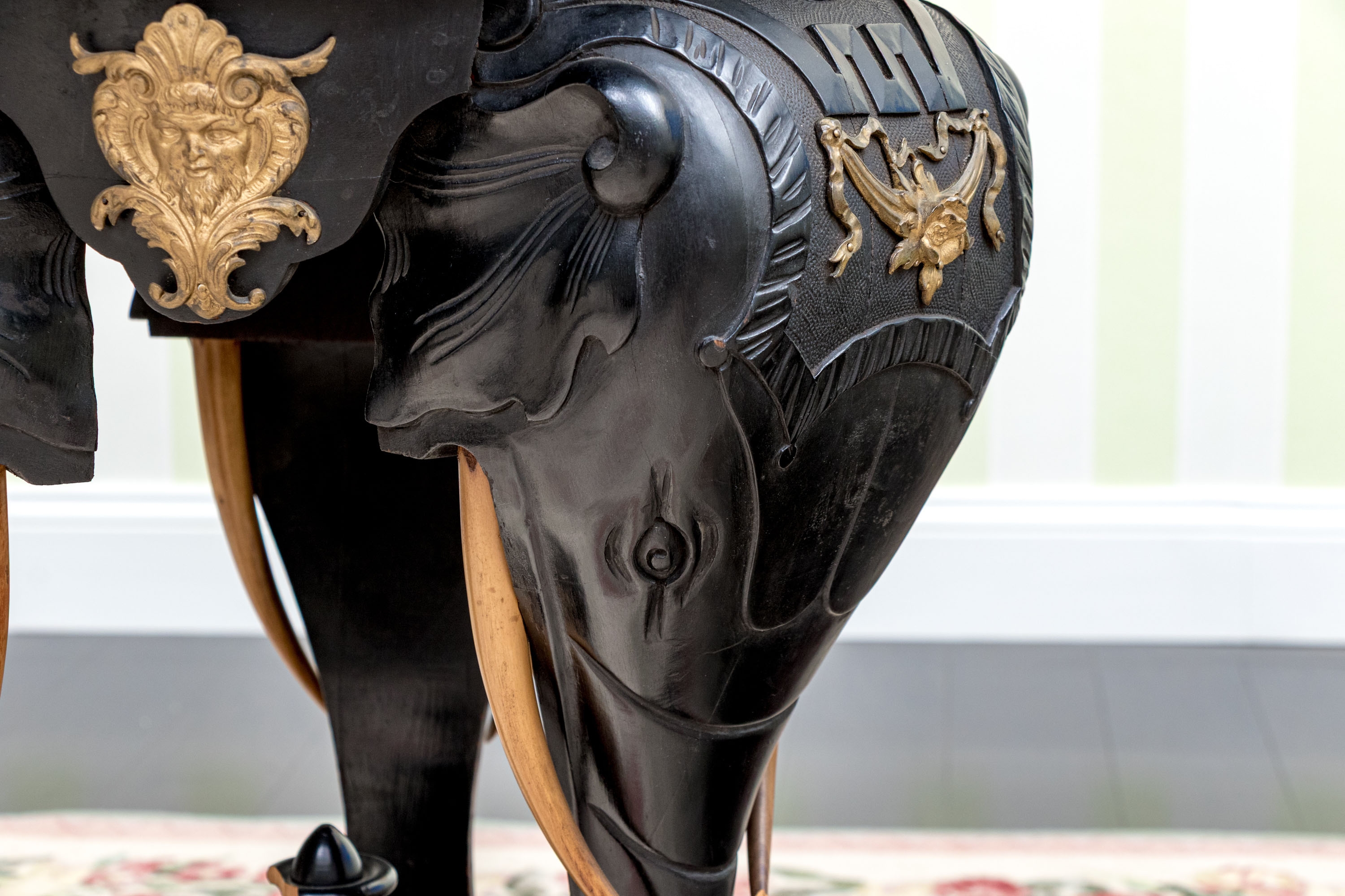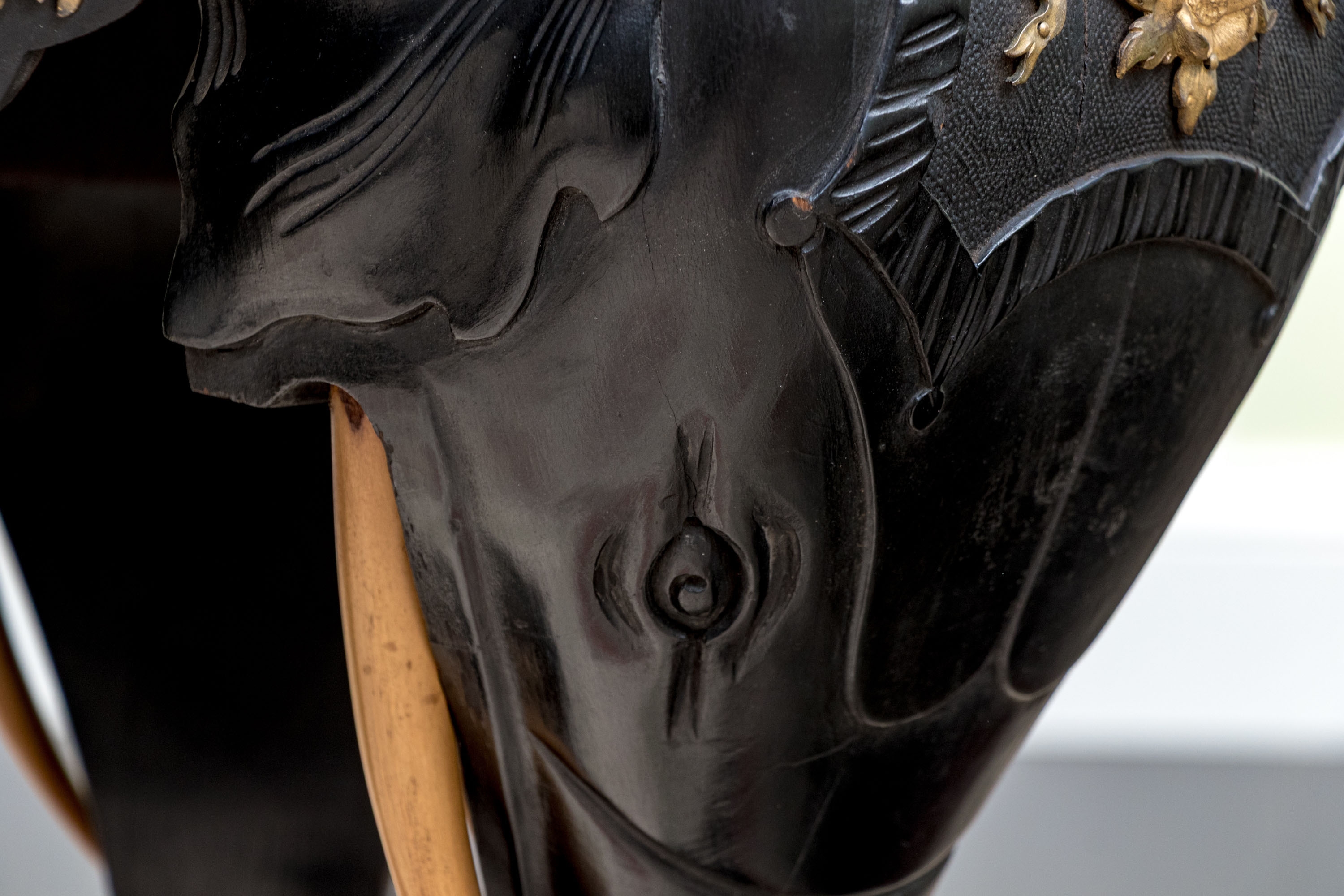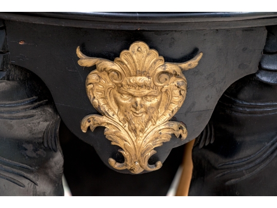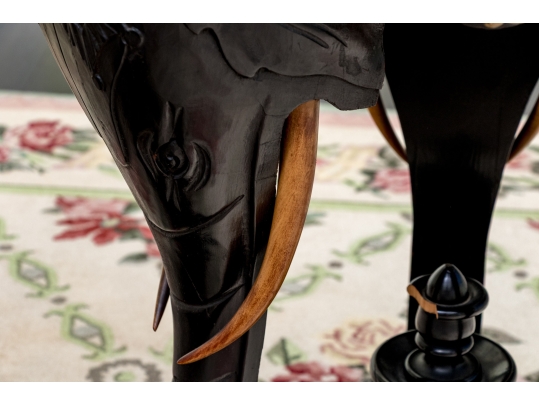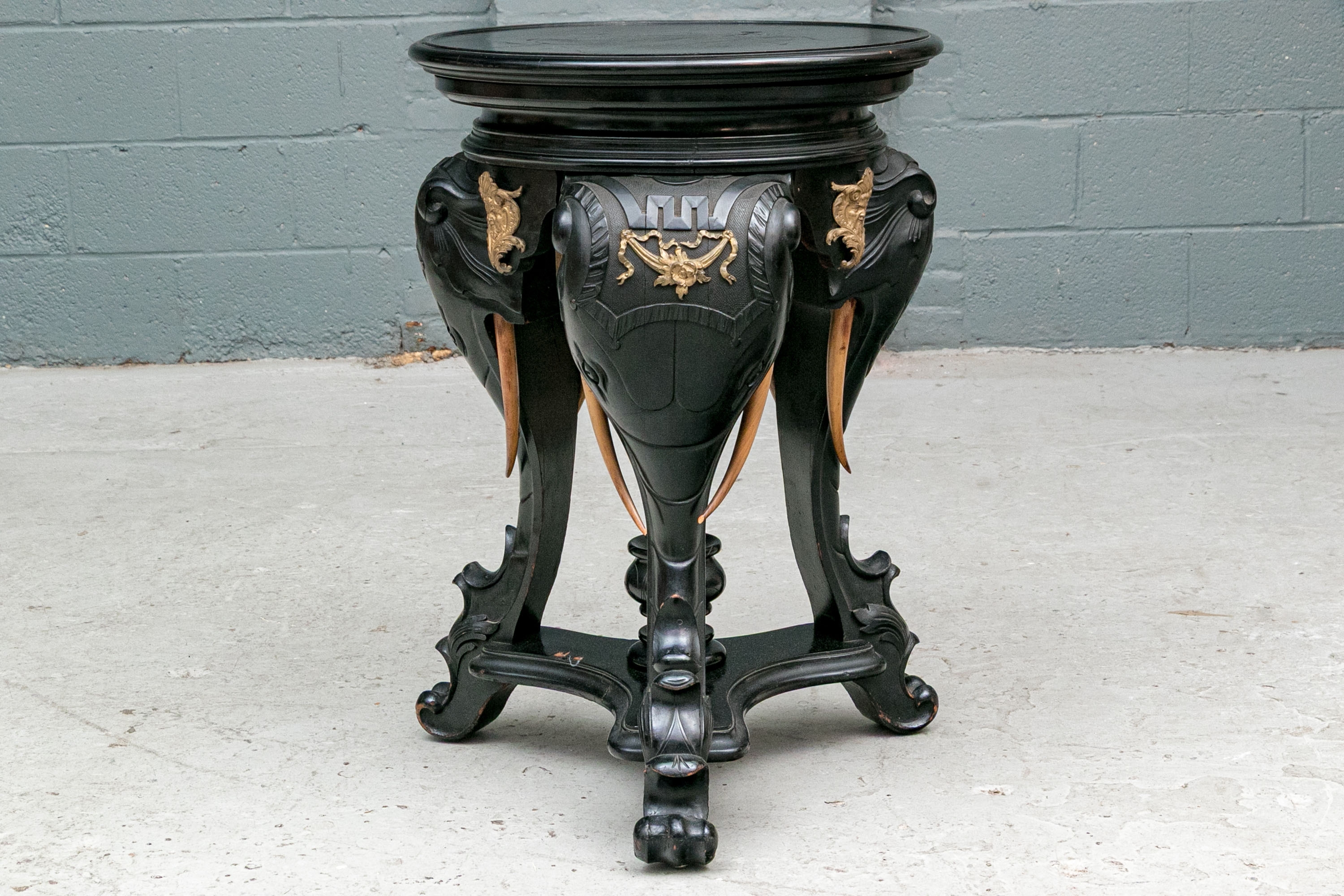 An ebonized side table or pedestal comprised of three well carved elephant heads with decorative bronze mounts. The elephants heads with contrasting carved wood tusks. The elephant heads alternate with bronze classical or mythological figural masks on the apron, possibly a satyr or a bacchic mask. The stand is raised up on a triangular plinth with a bold central final.