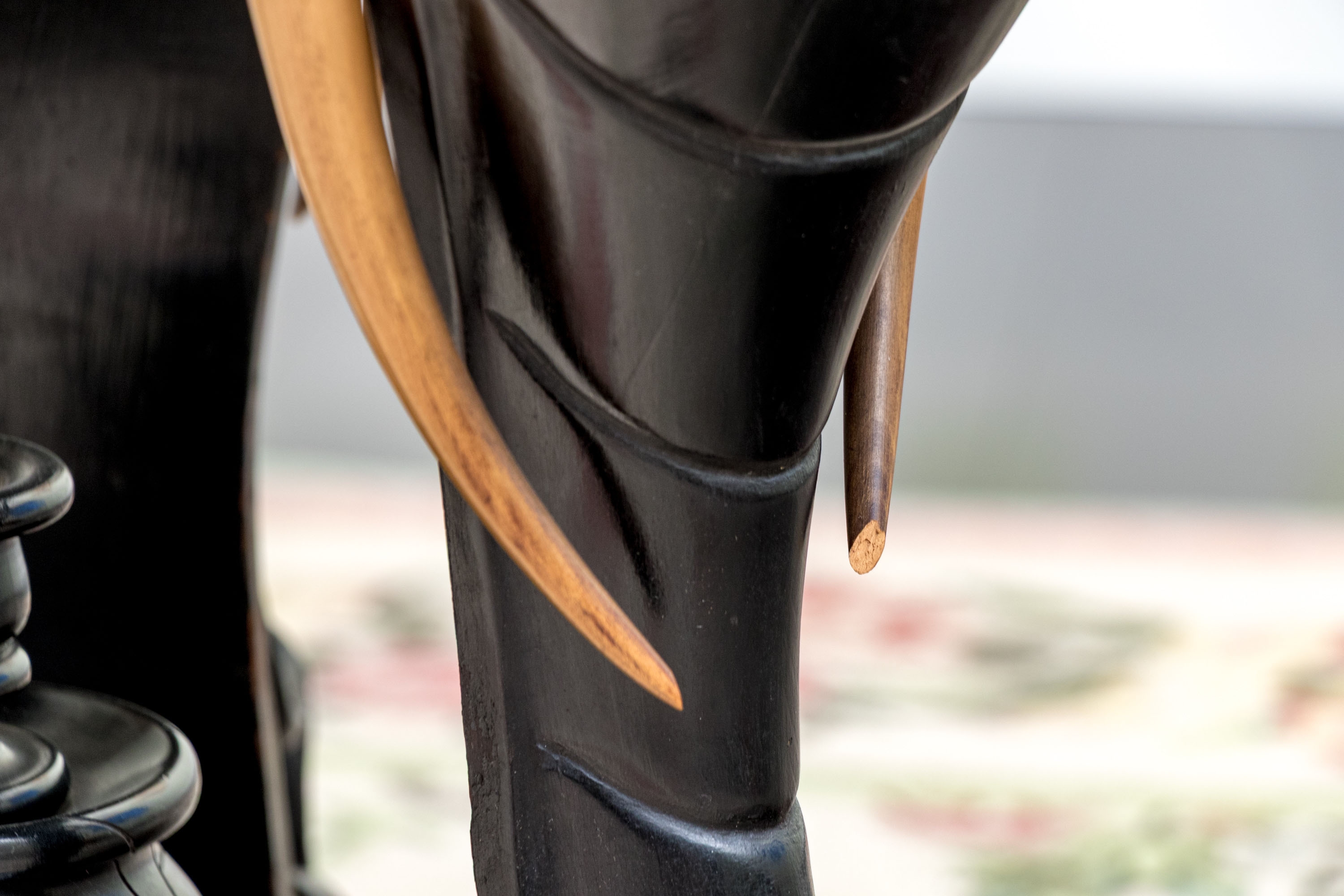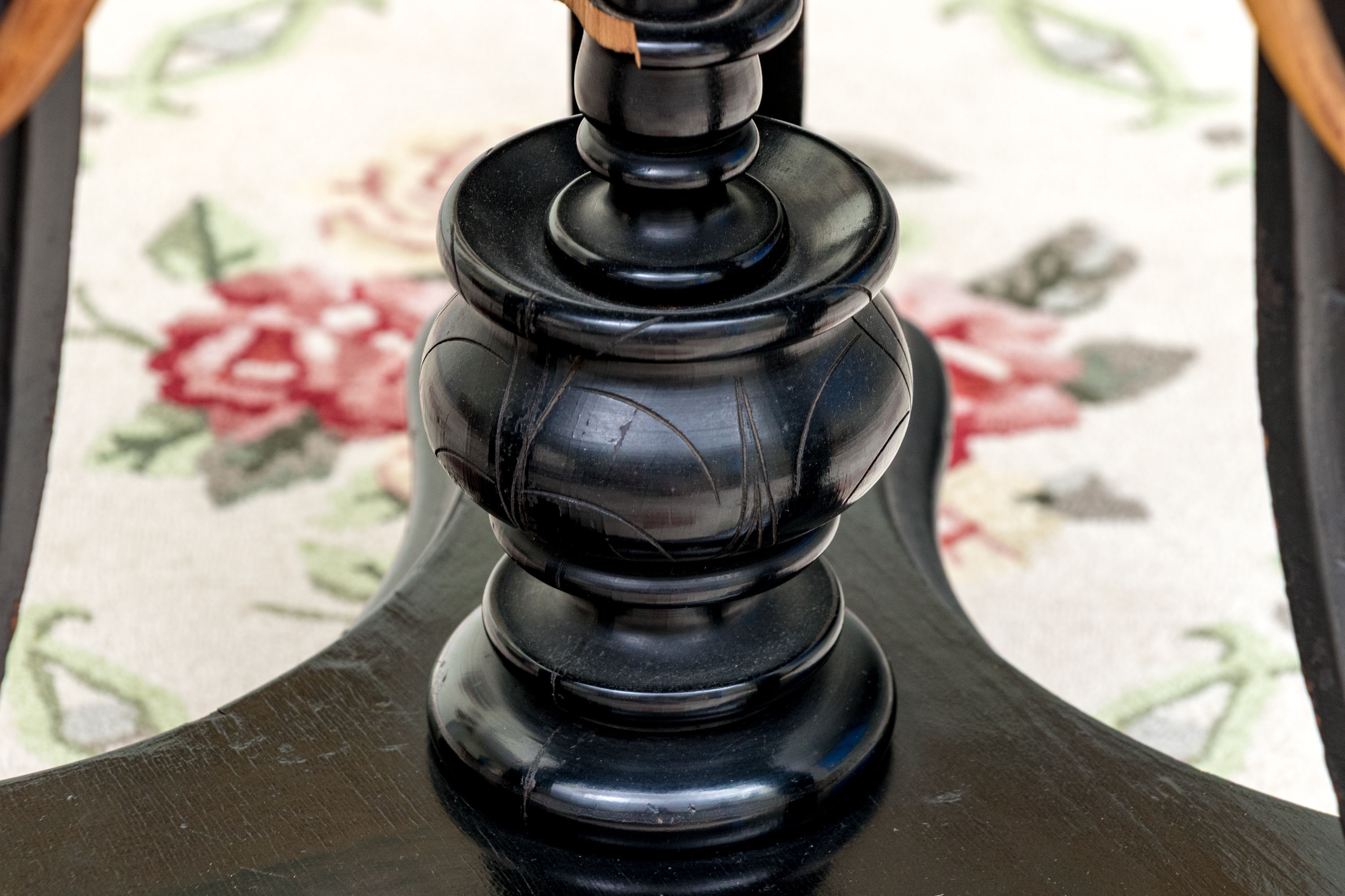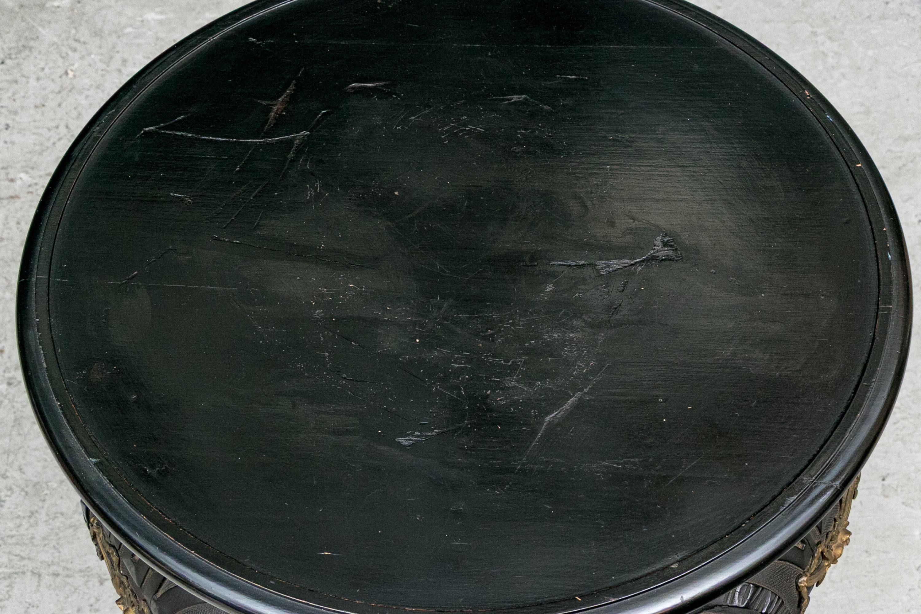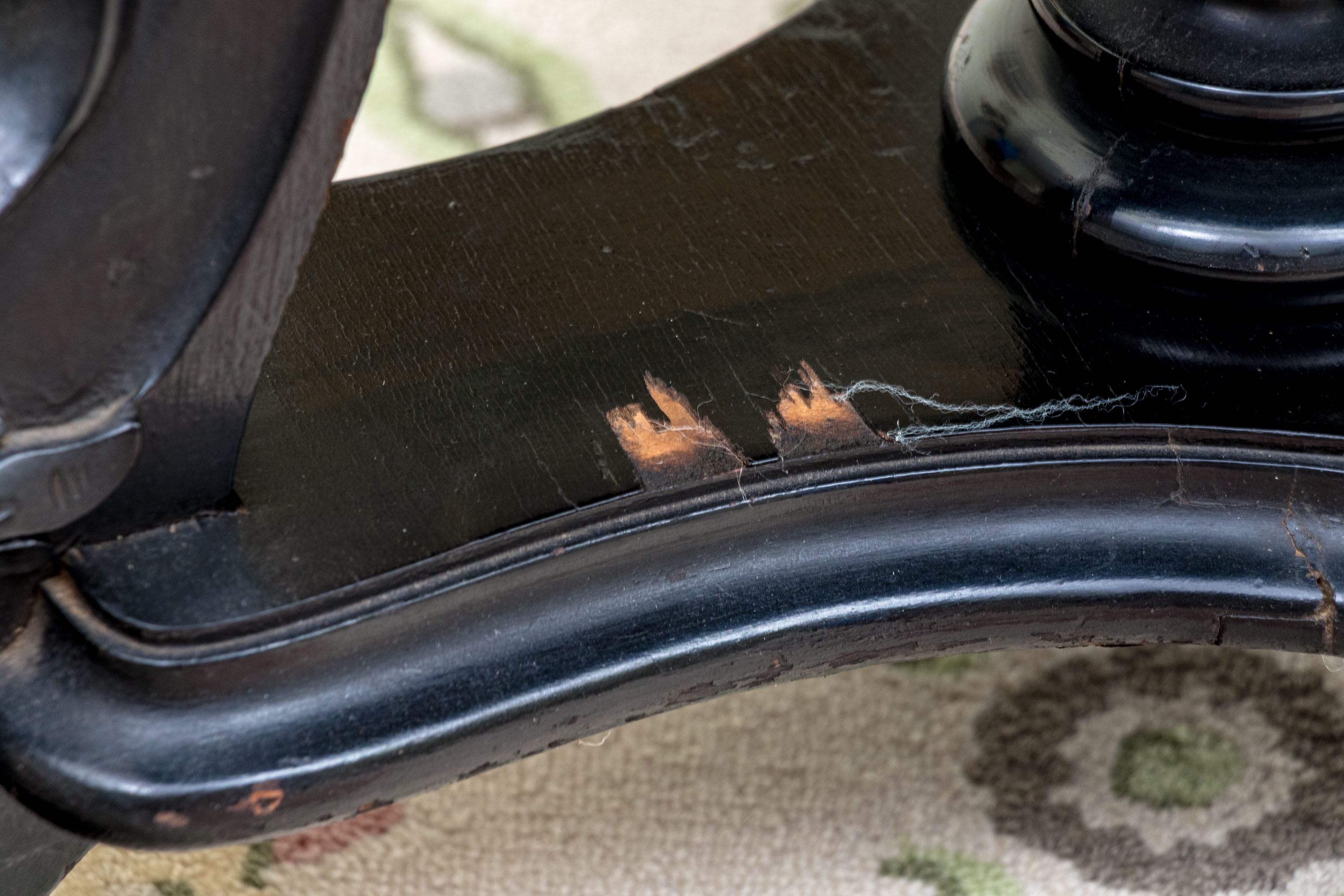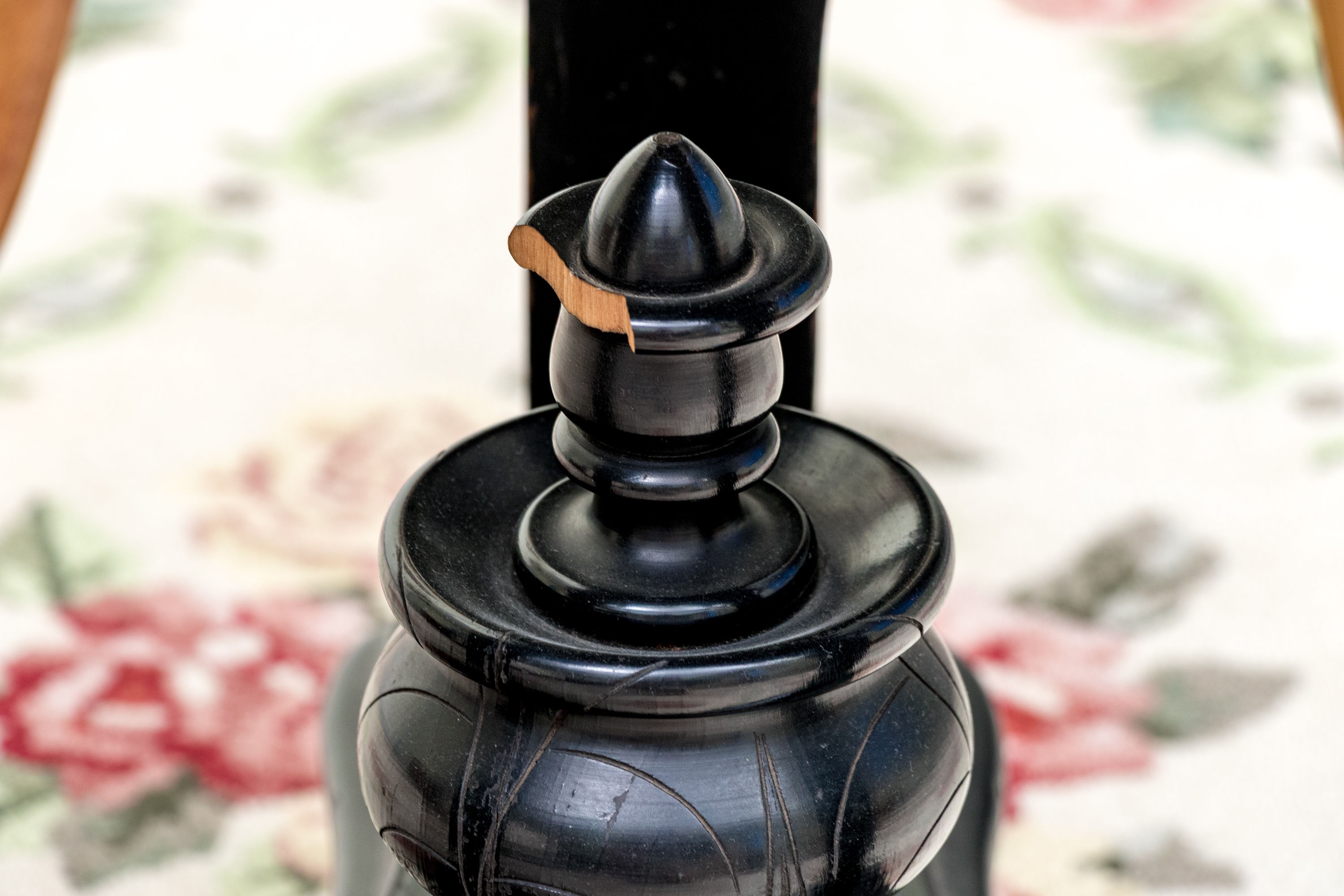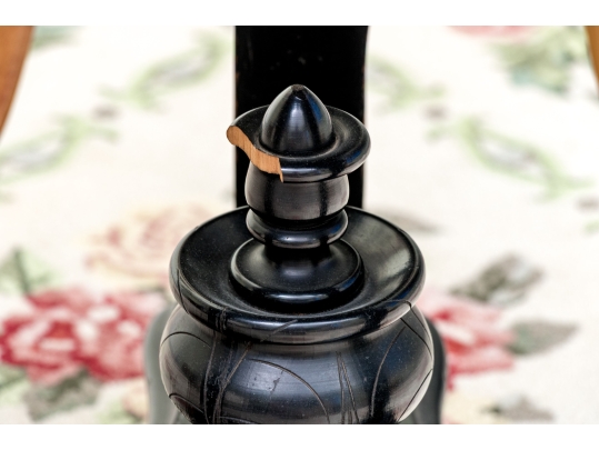 Condition: Please see detail photos. Various signs of age and use include chip to finial, chips to both tusks of one elephant (see photo); top with deep scratches and wear with over-painting to top, veneer losses to the base, wear and nicks consistent with age and use.