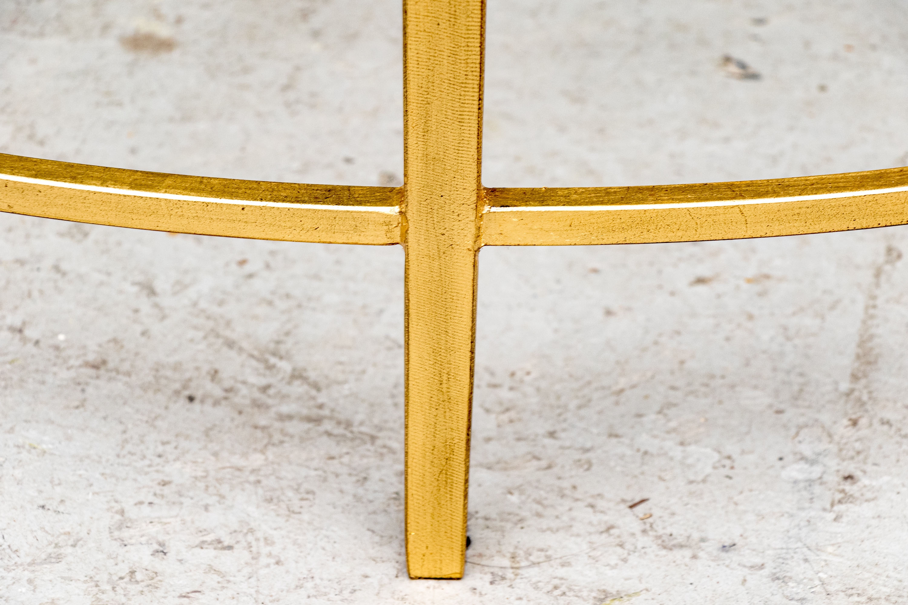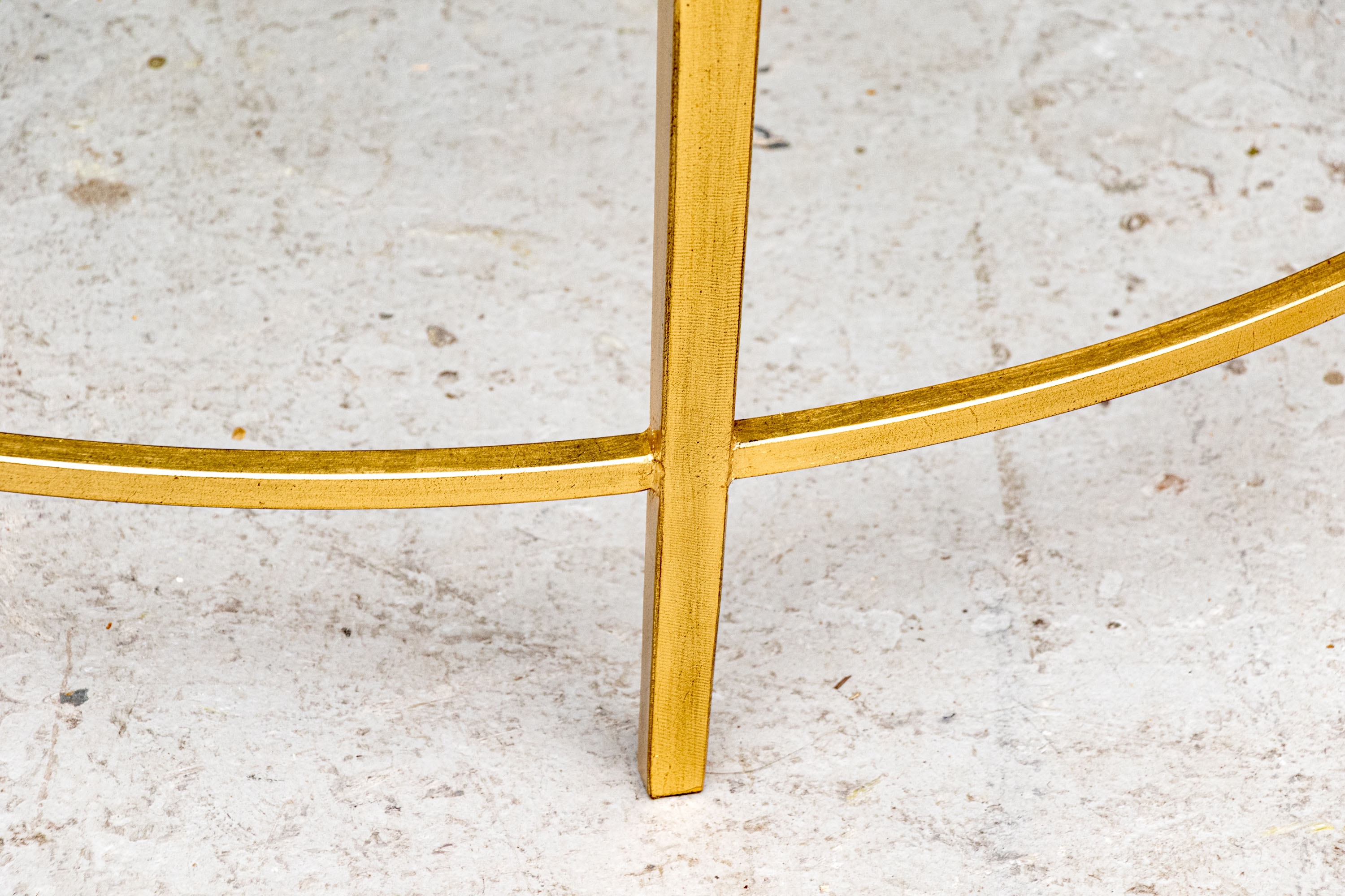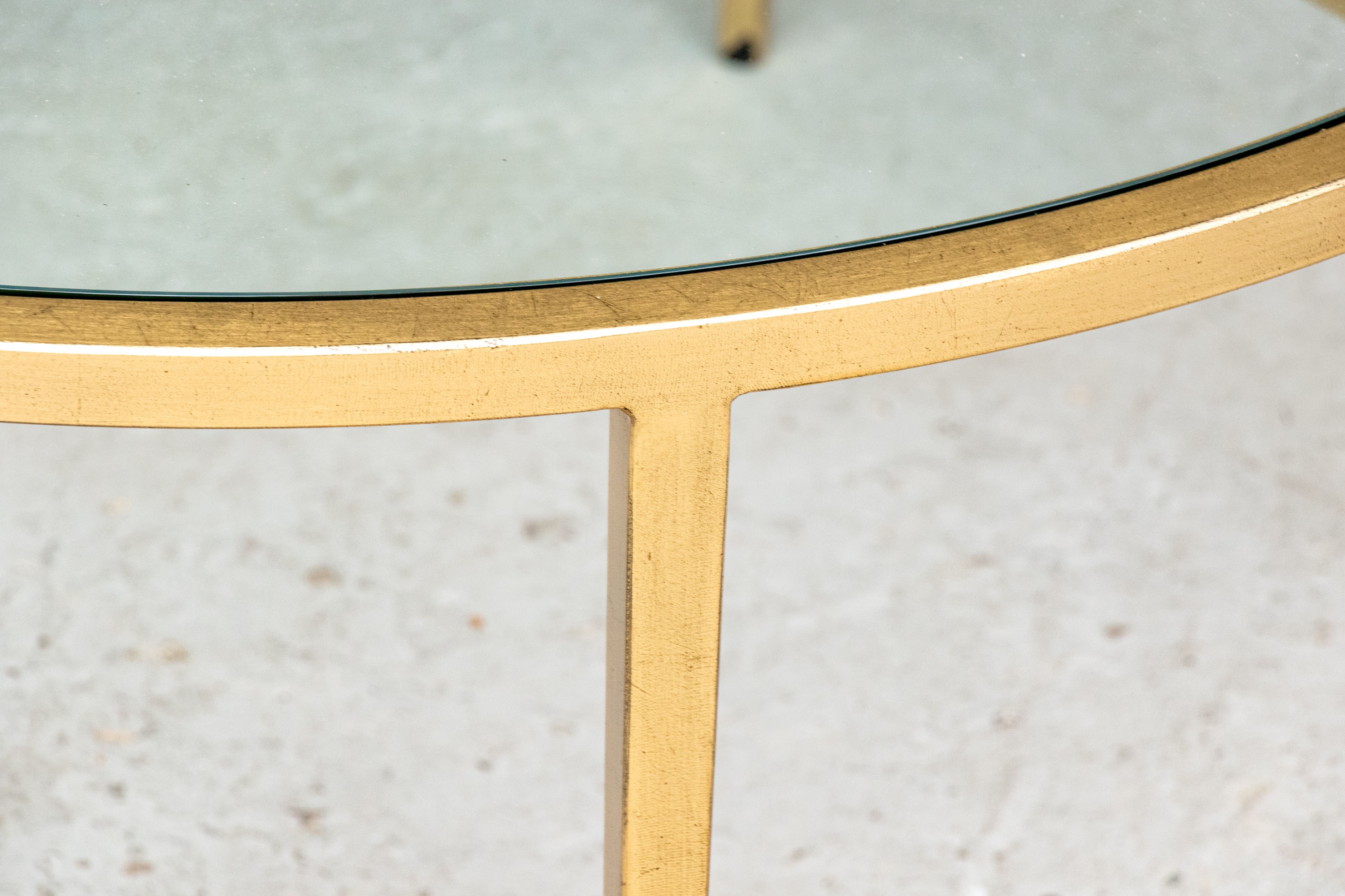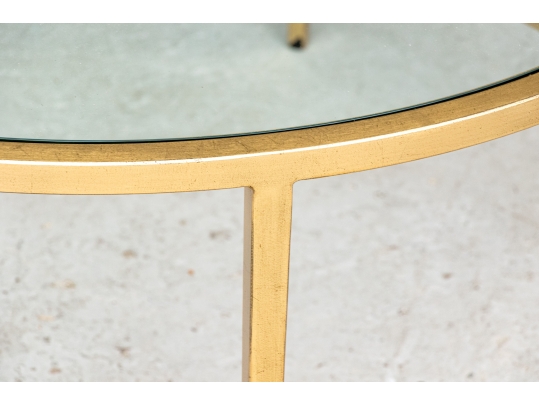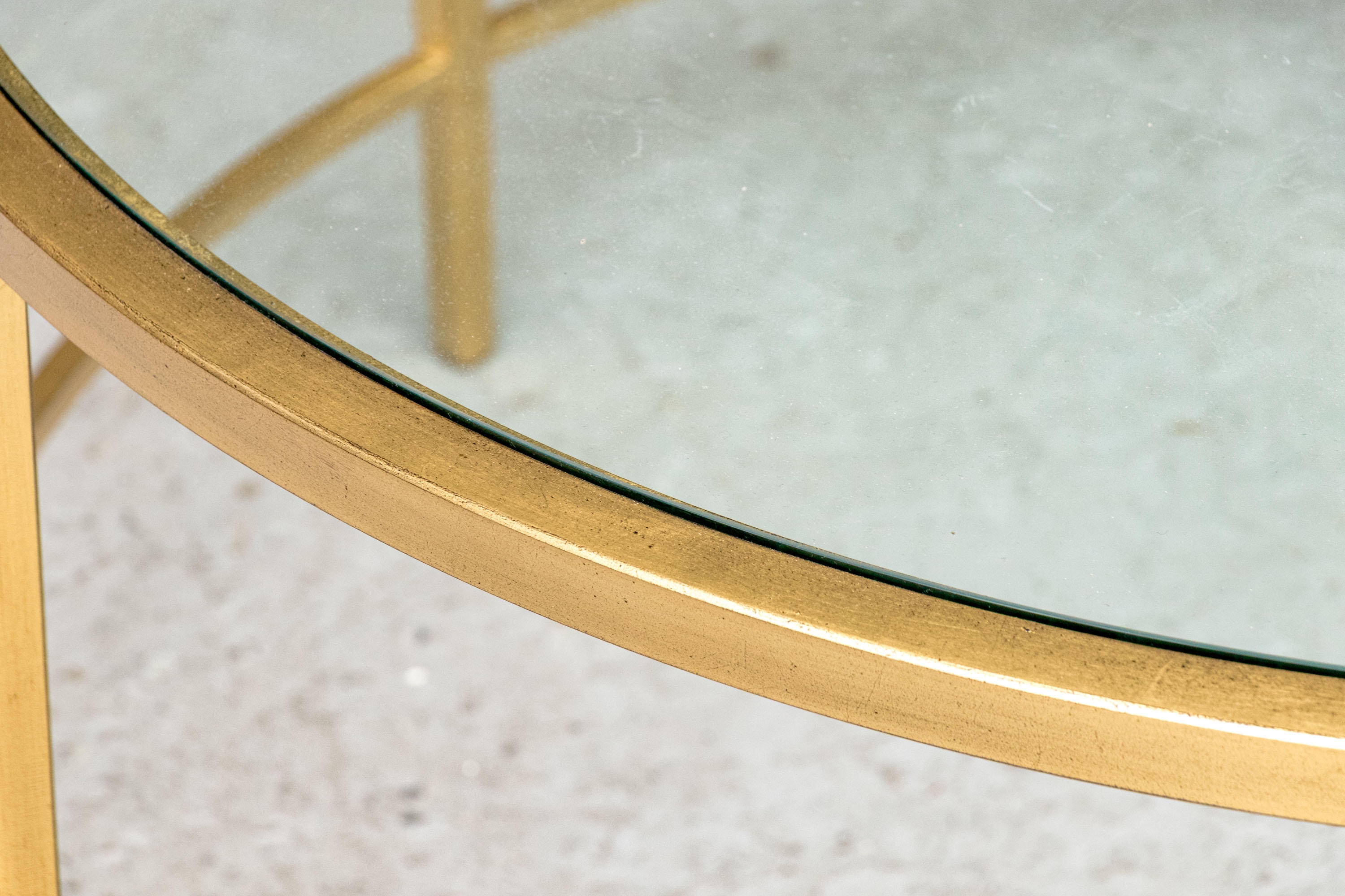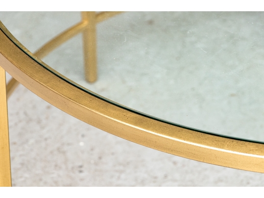 A round gilt metal cocktail table surmounted with a glass top having a slight bevel cut edge. The table with 5 tapering legs and a round conforming stretcher.