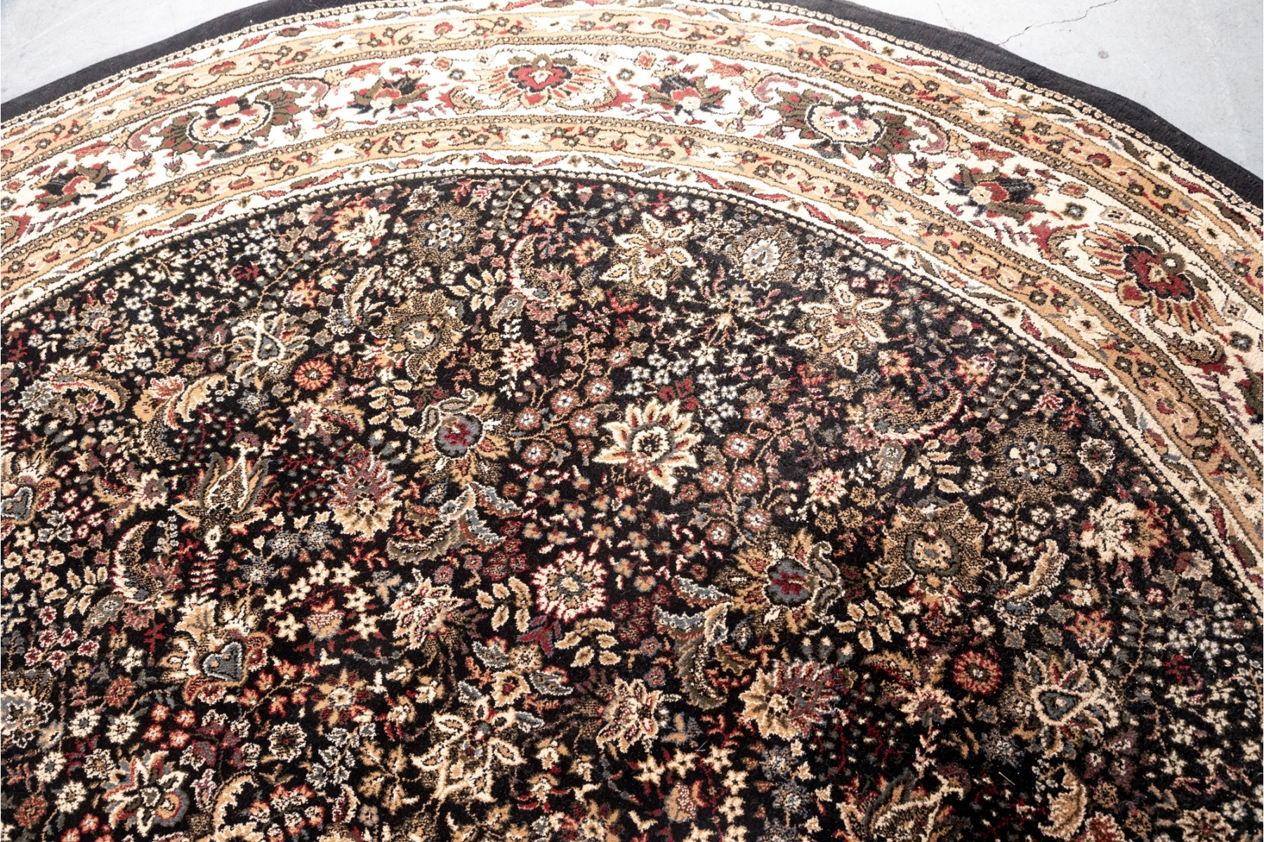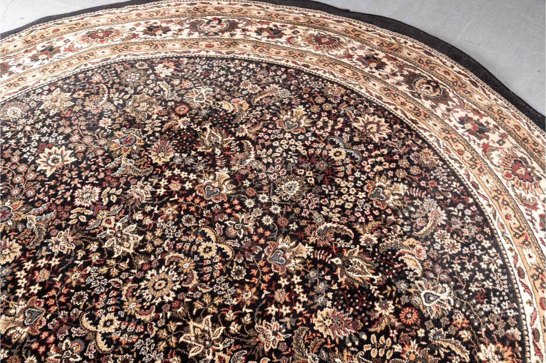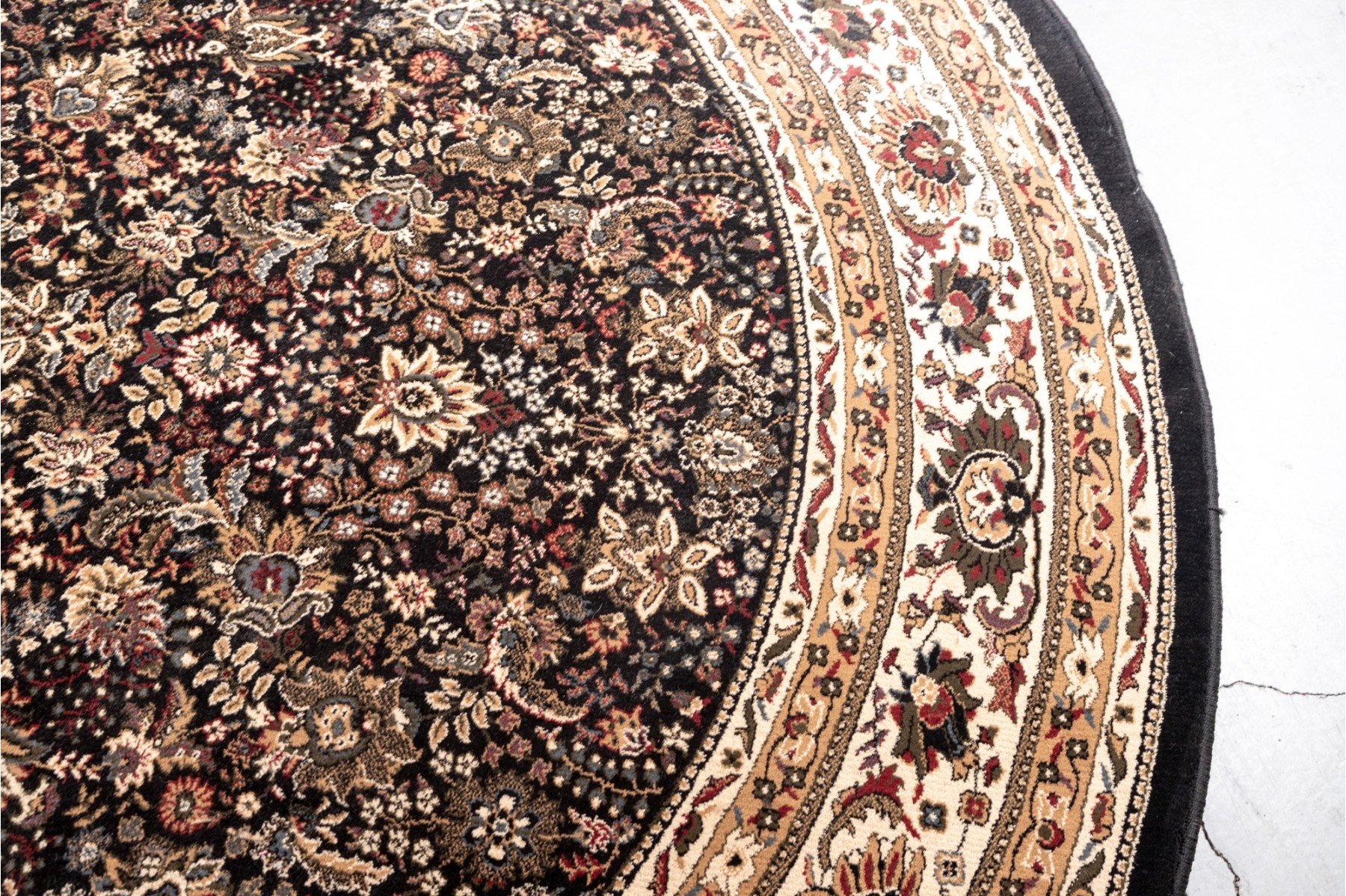 A richly detaile, machine made rug showcasing a floral medallion pattern on a dark ground, framed by cream and multicolor borders with intricate vine and blossom motifs.