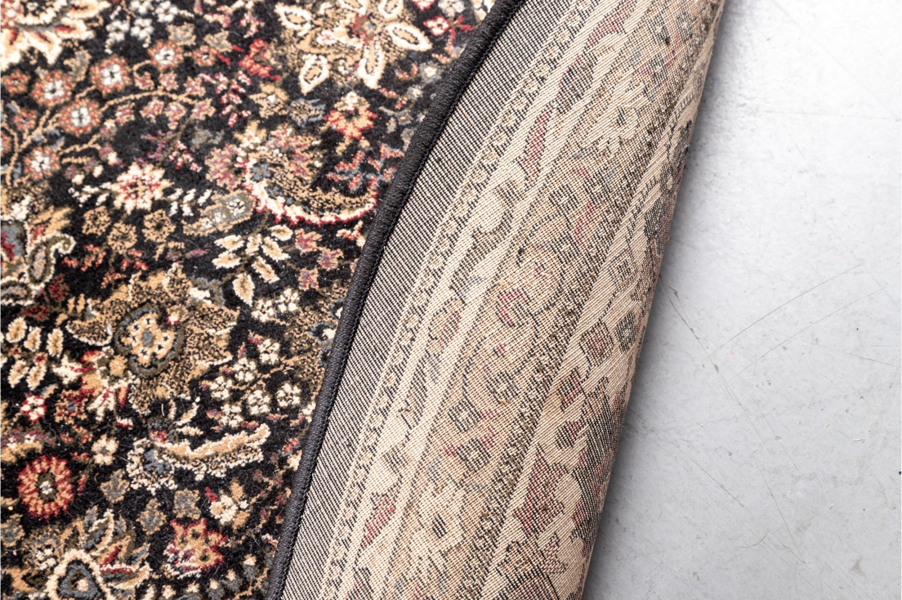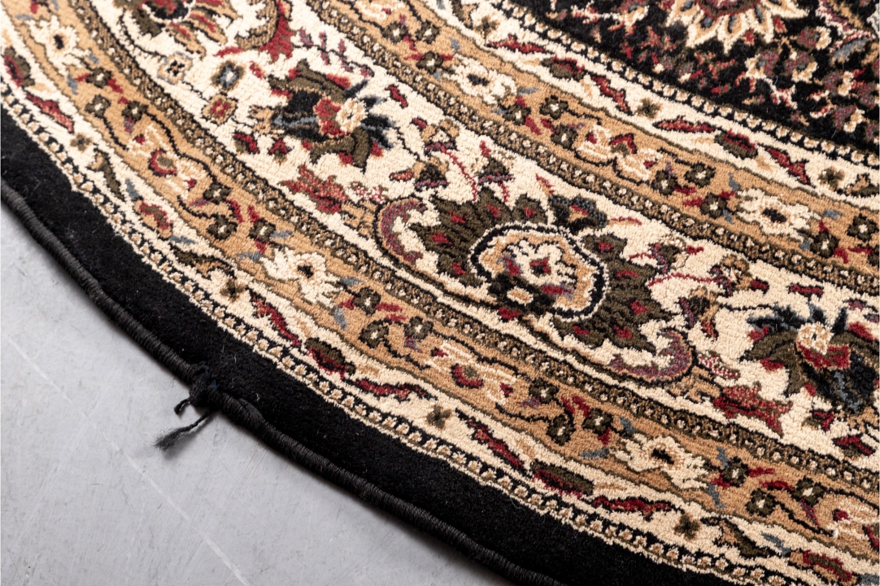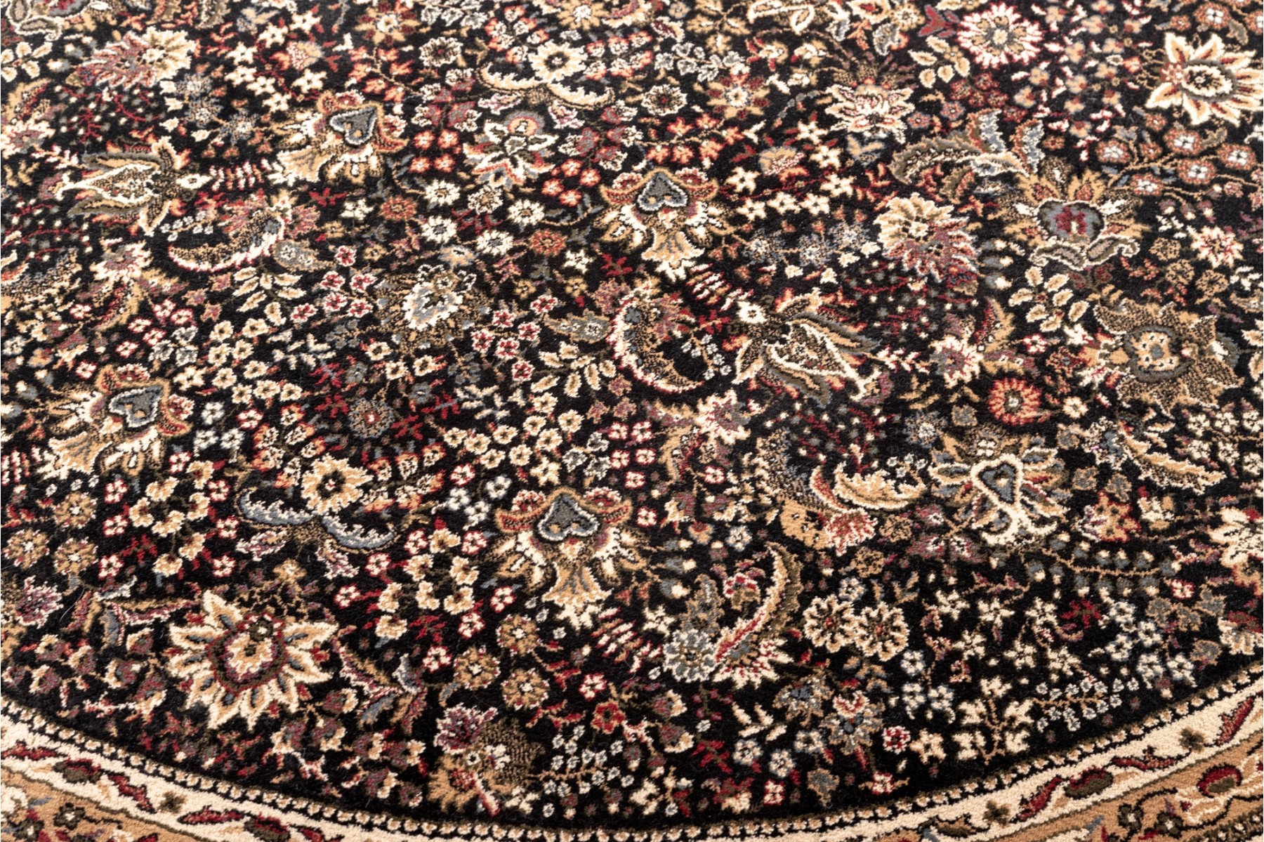 A richly detaile, machine made rug showcasing a floral medallion pattern on a dark ground, framed by cream and multicolor borders with intricate vine and blossom motifs.