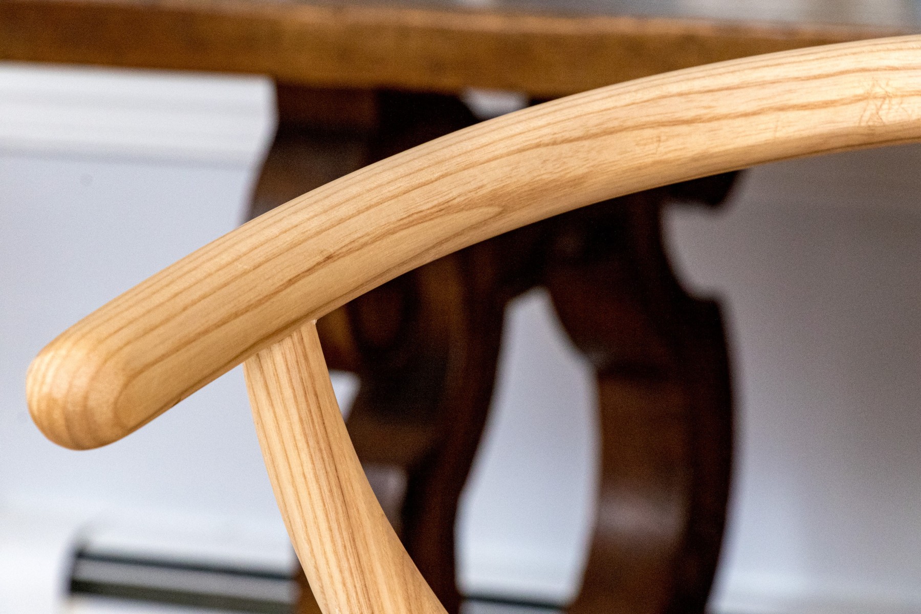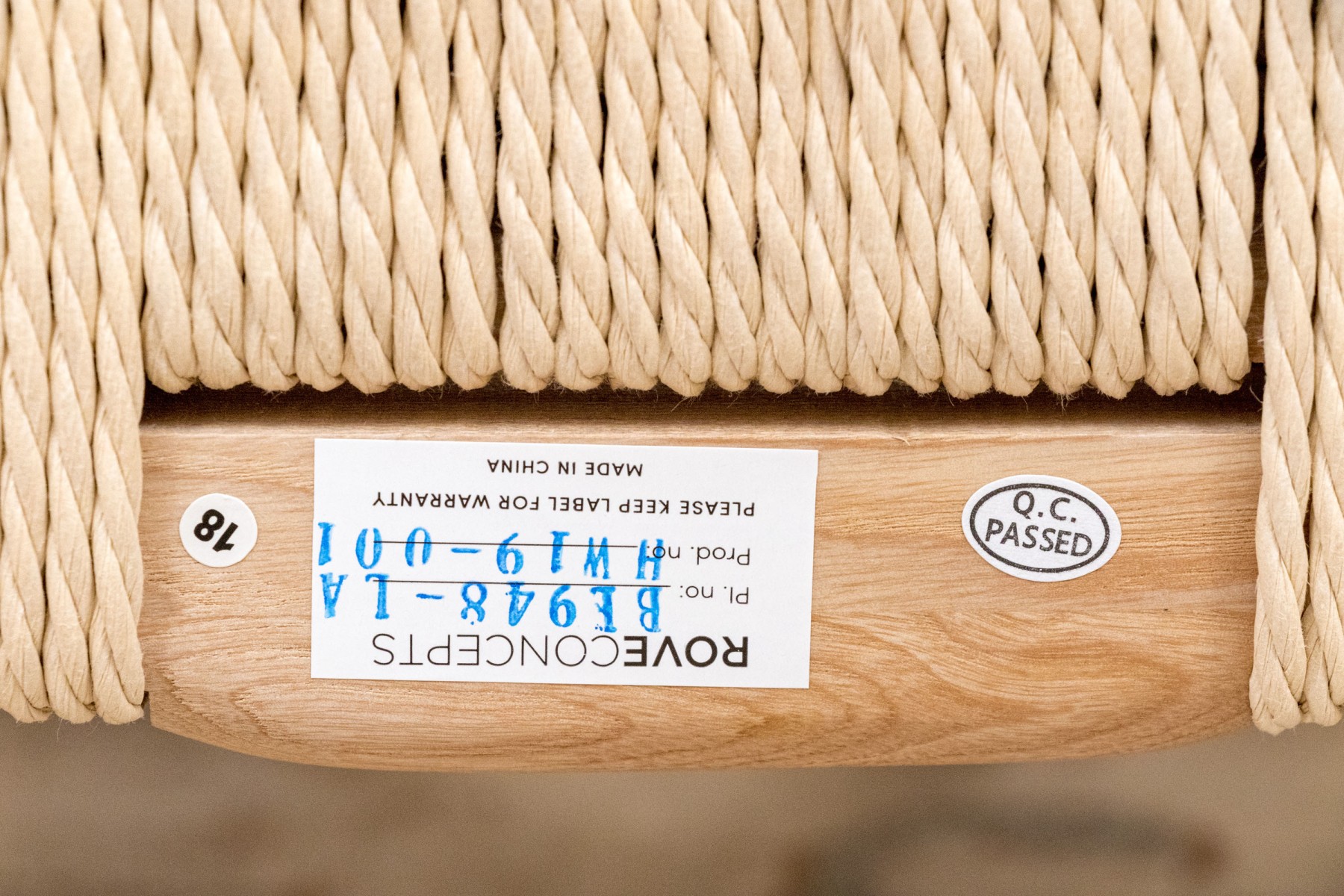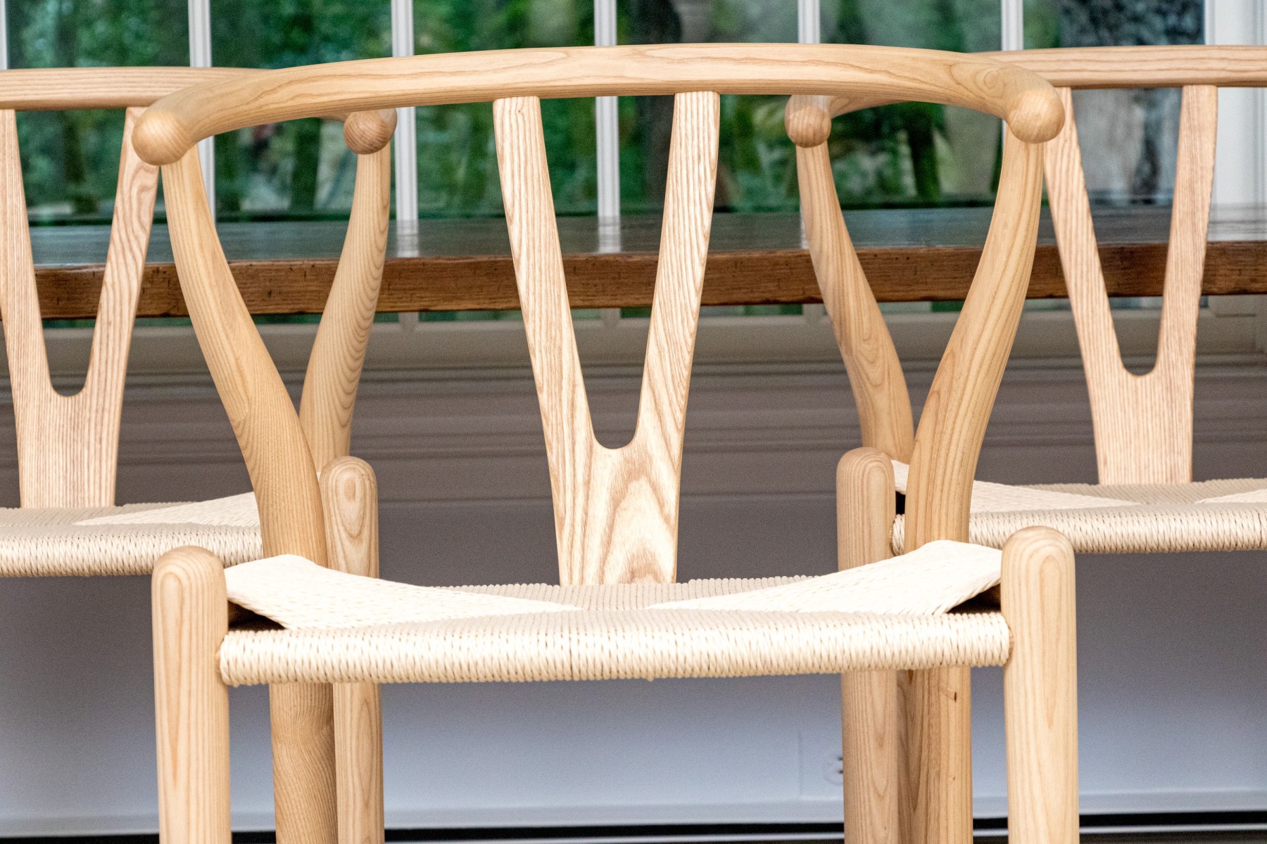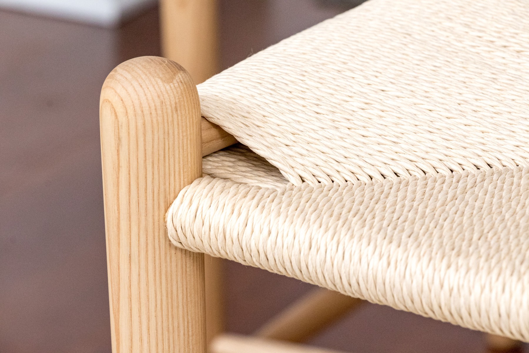 Each is raised on four cylindrical form carved and light stained wooden legs with natural seat woven cord seats and bent wood seat backs with wishbone form back splats, echoing the traditional Chinese horseshoe back chairs it draws inspiration from.