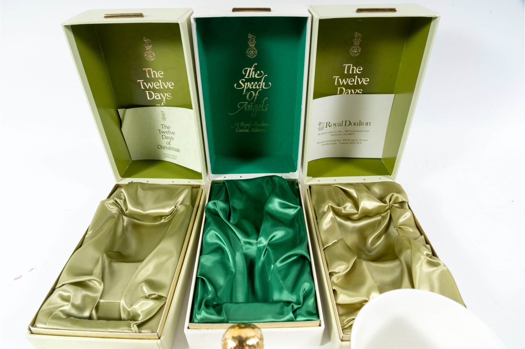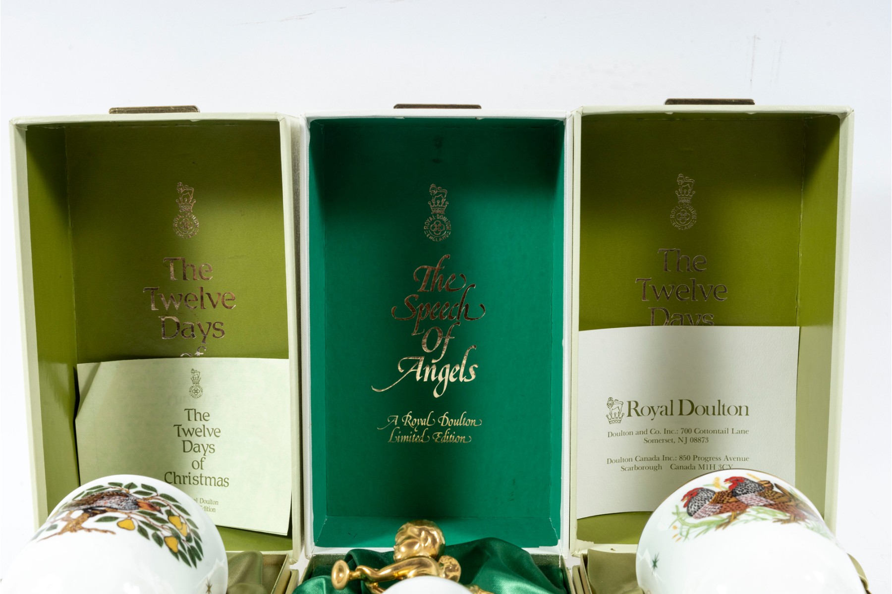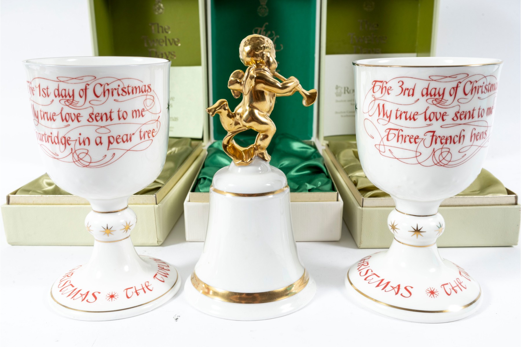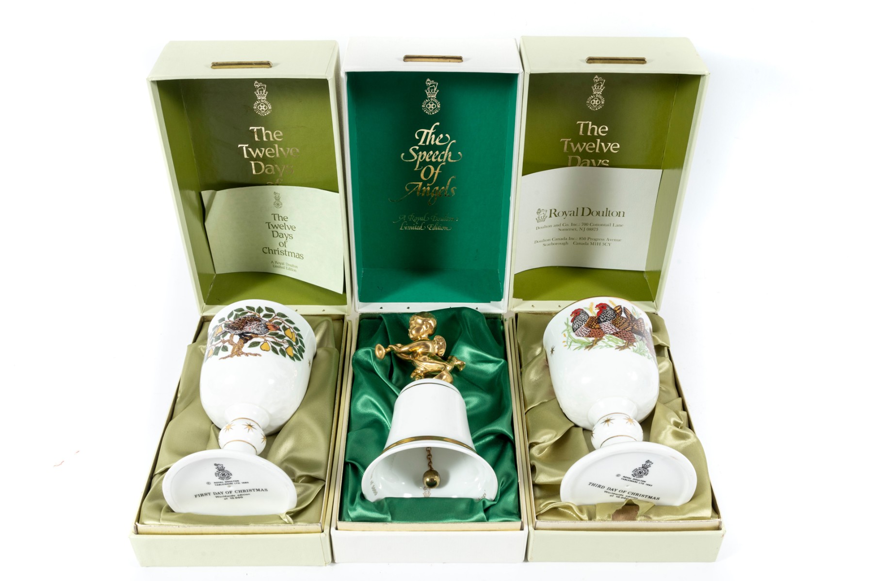 A set of three limited edition Royal Doulton porcelains. Includes two chalices from Royal Doulton's "The Twelve Days of Christmas", and one bell from "The Speech of Angels" collection. See photos for details.