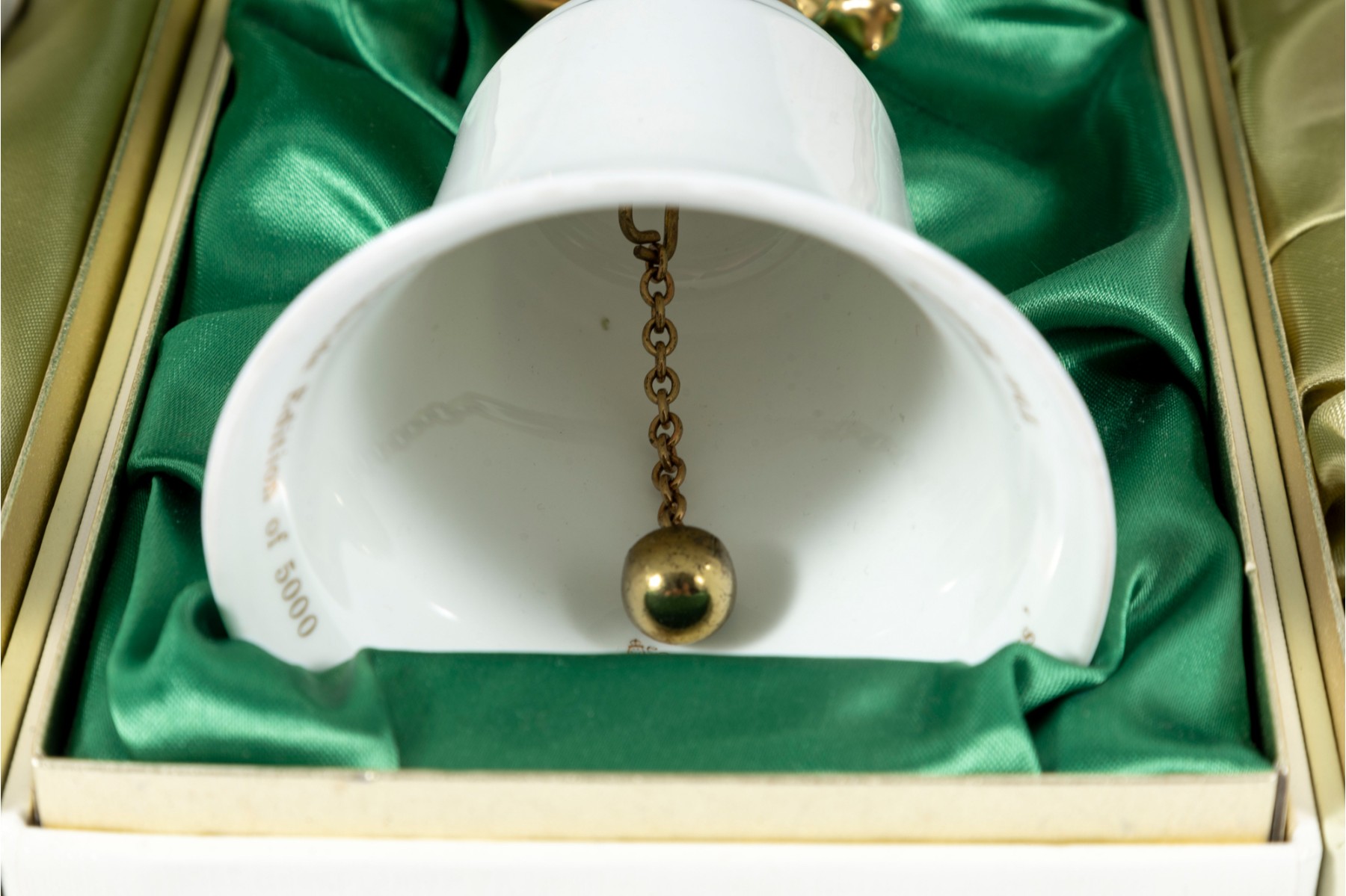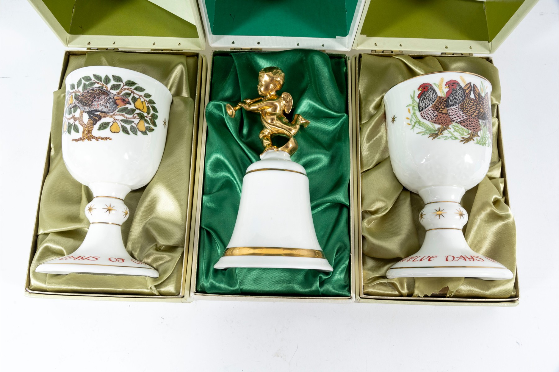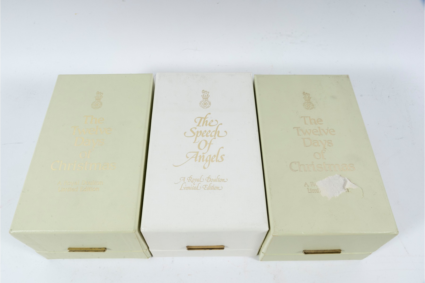 A set of three limited edition Royal Doulton porcelains. Includes two chalices from Royal Doulton's "The Twelve Days of Christmas", and one bell from "The Speech of Angels" collection. See photos for details.