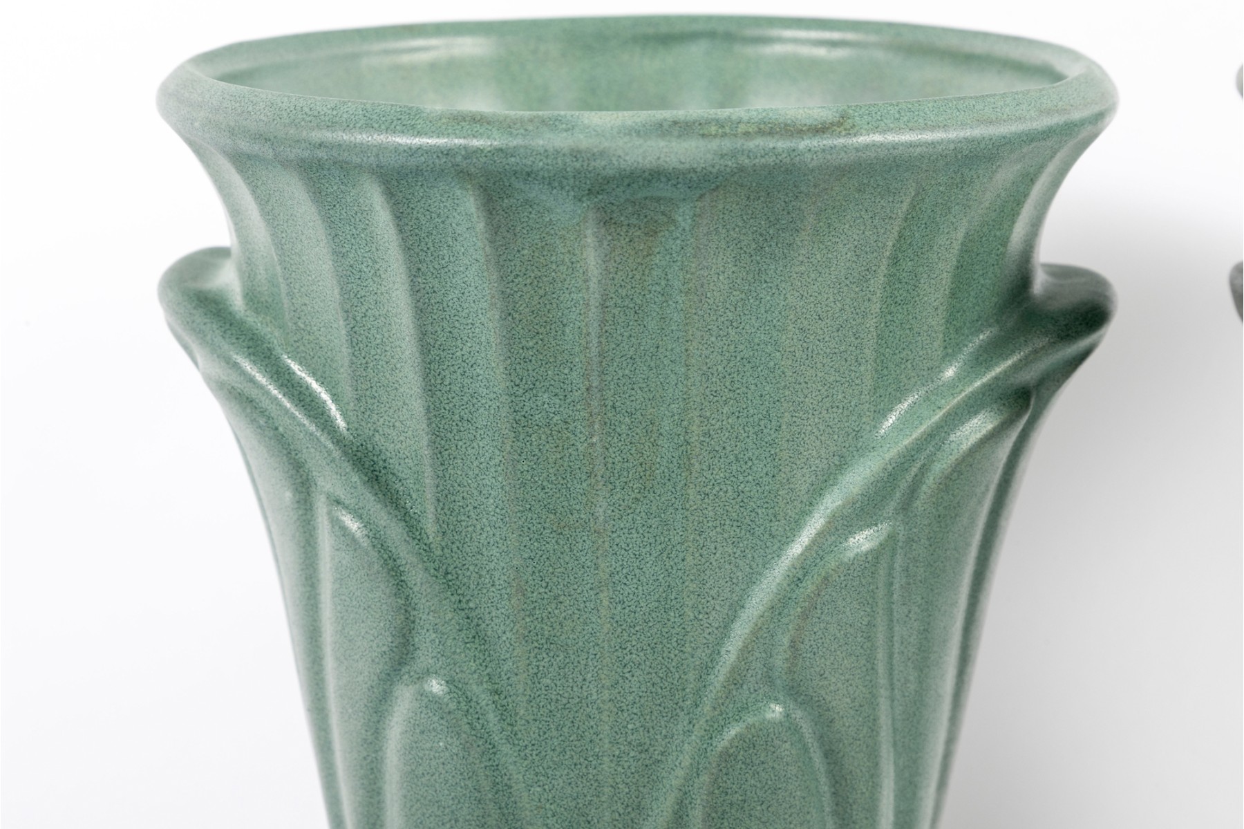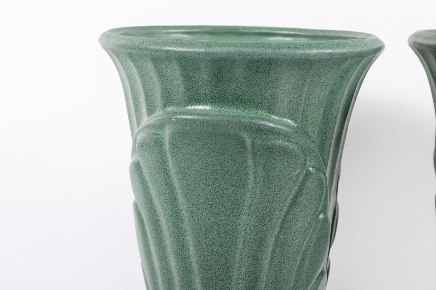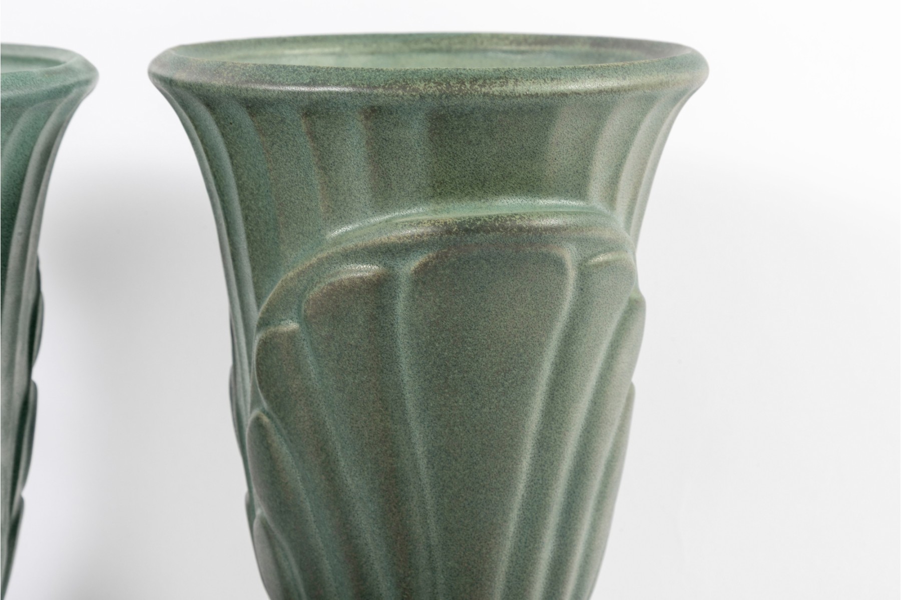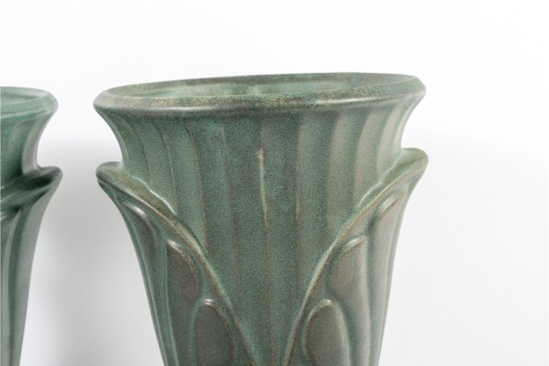A pair of 1999 'Floral' line ceramic pottery petal vases glazed in a matte moss green.