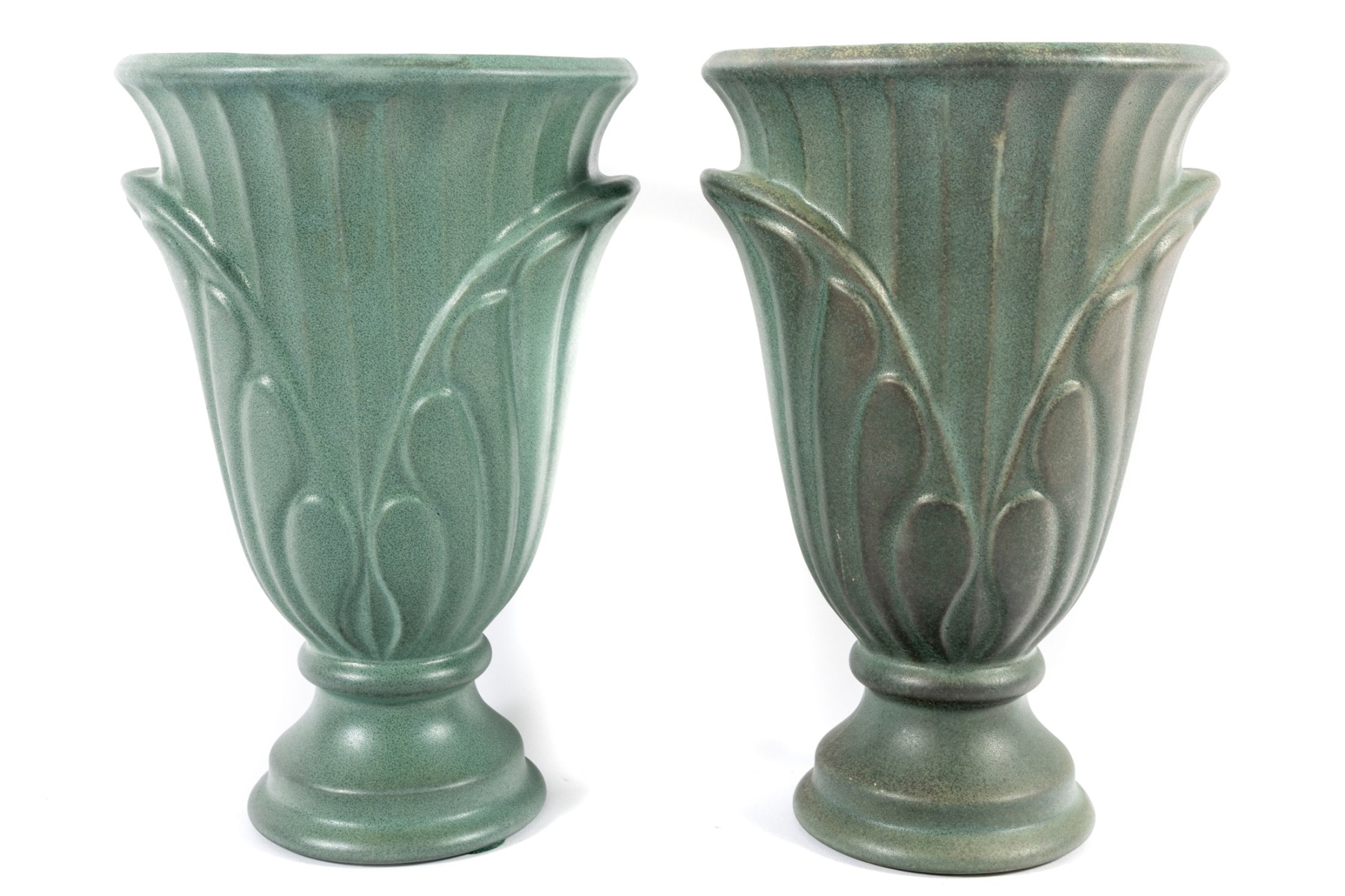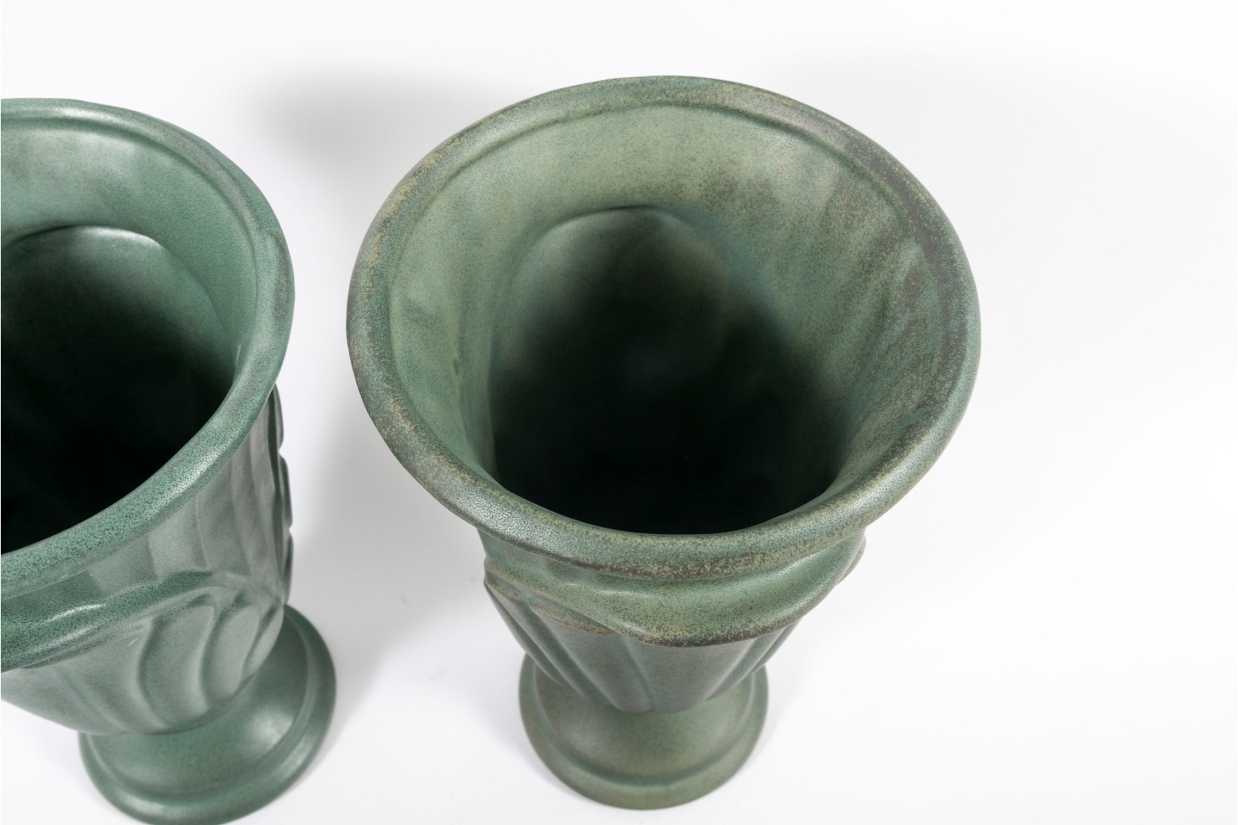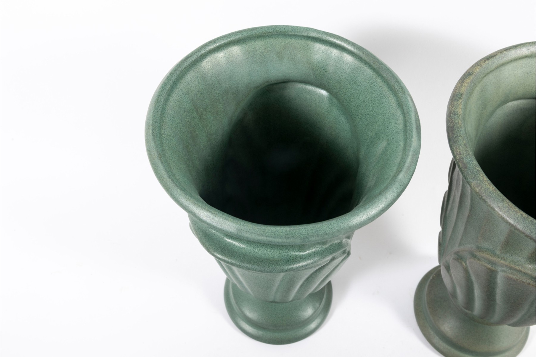 A pair of 1999 'Floral' line ceramic pottery petal vases glazed in a matte moss green.