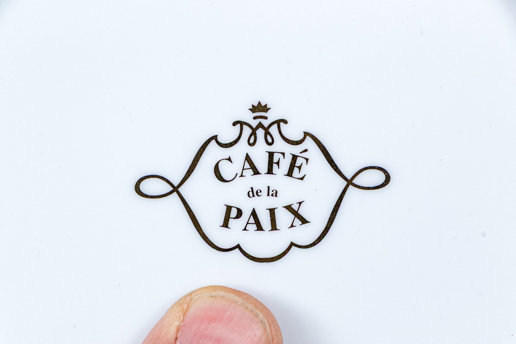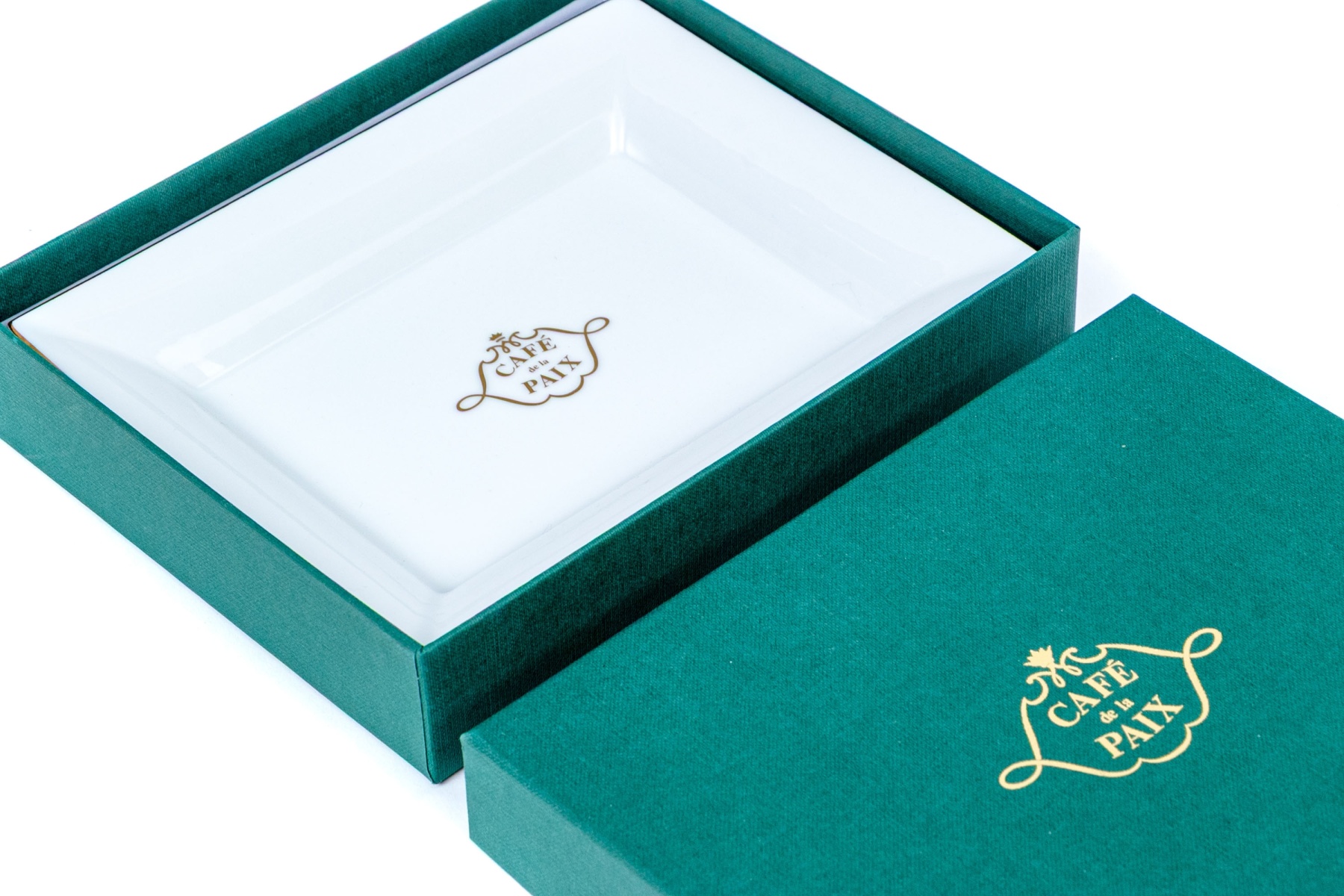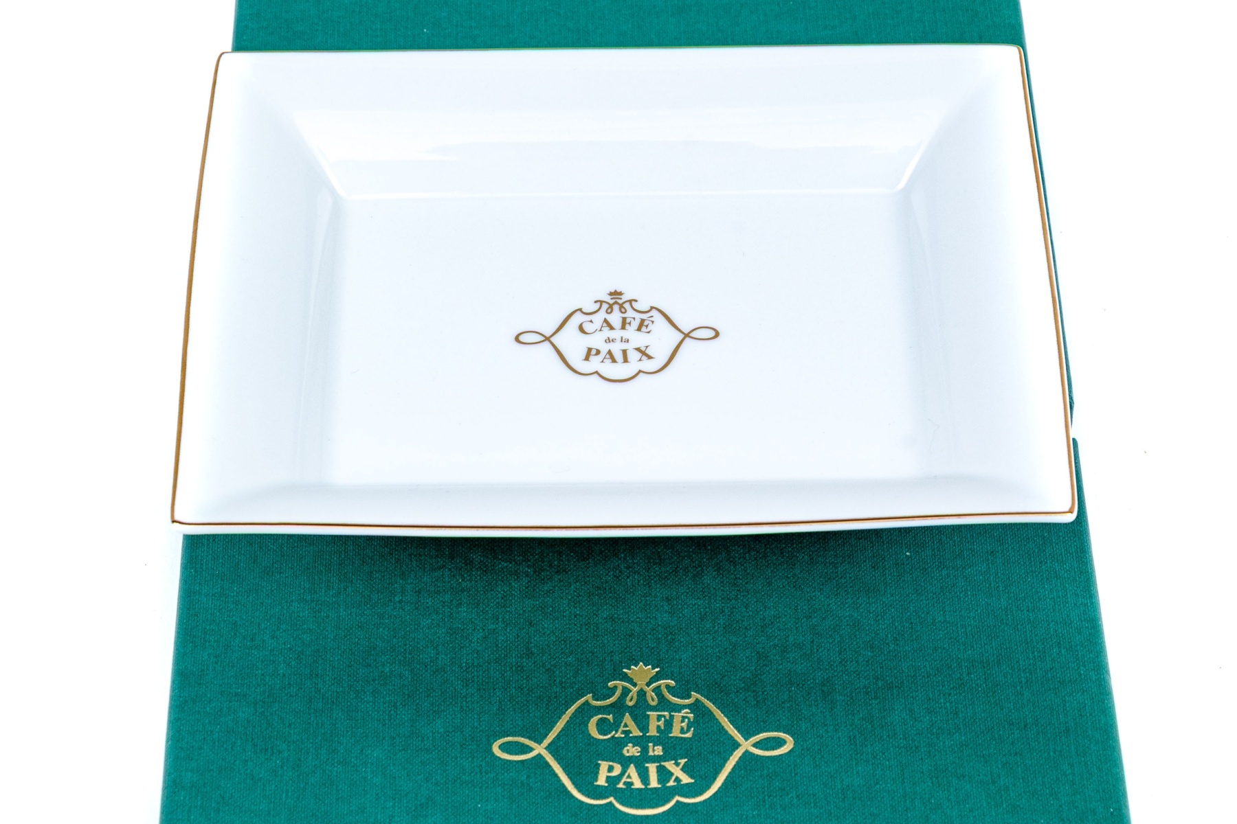 An elegant white rectangular deep dish with the Cafe de La Paix symbol in gilt in the center. Presented in a green gilt embossed box.
