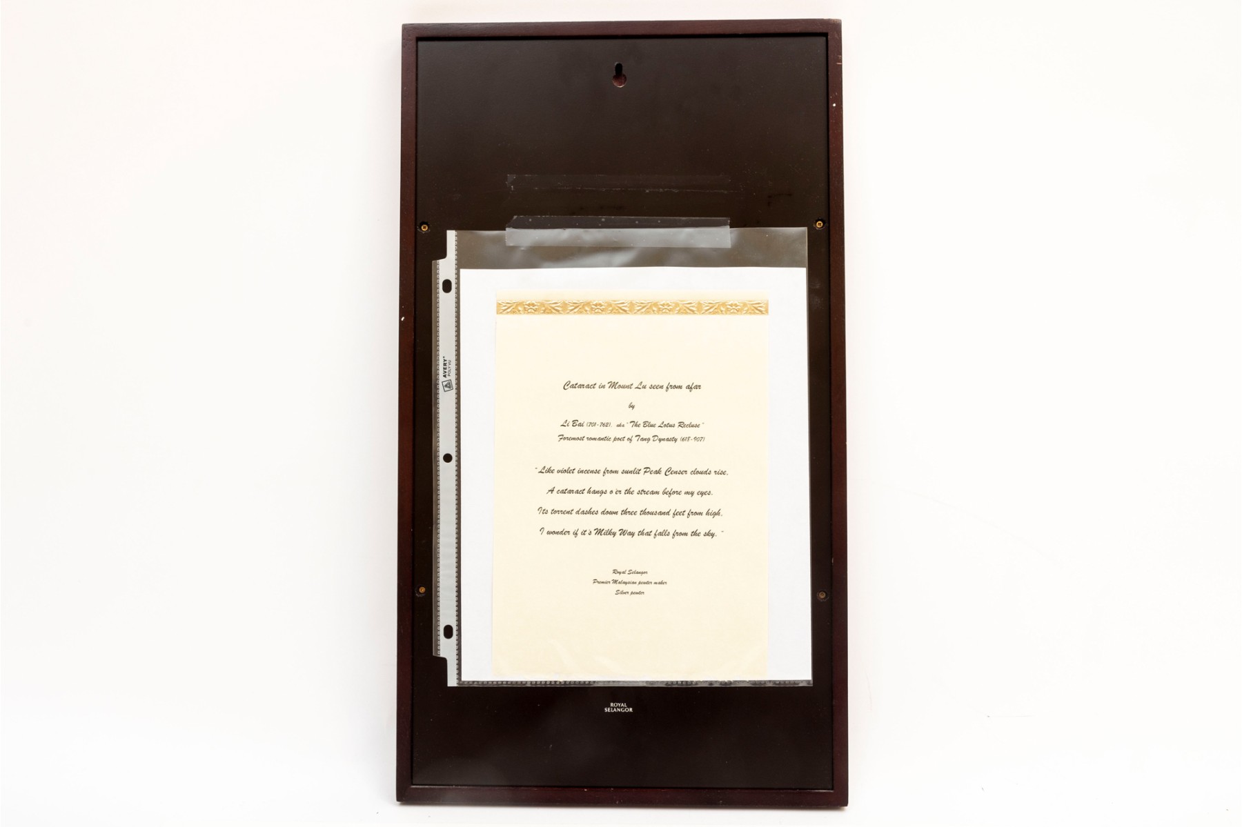 The artwork is presented openly within a wood frame with bordering linen accents. A translation of the poem and import customs details reside on the back of the frame.