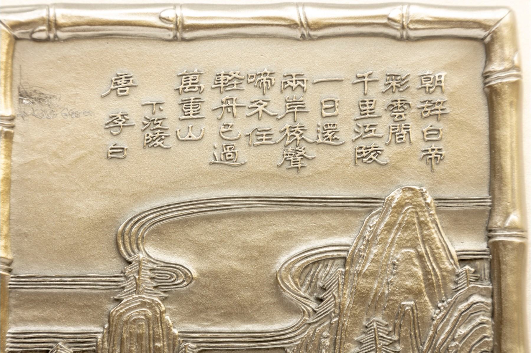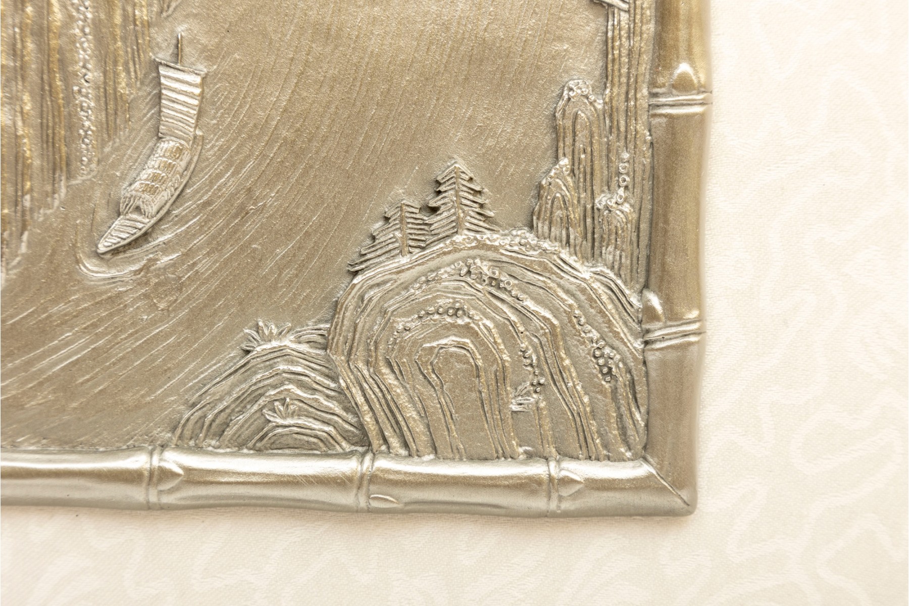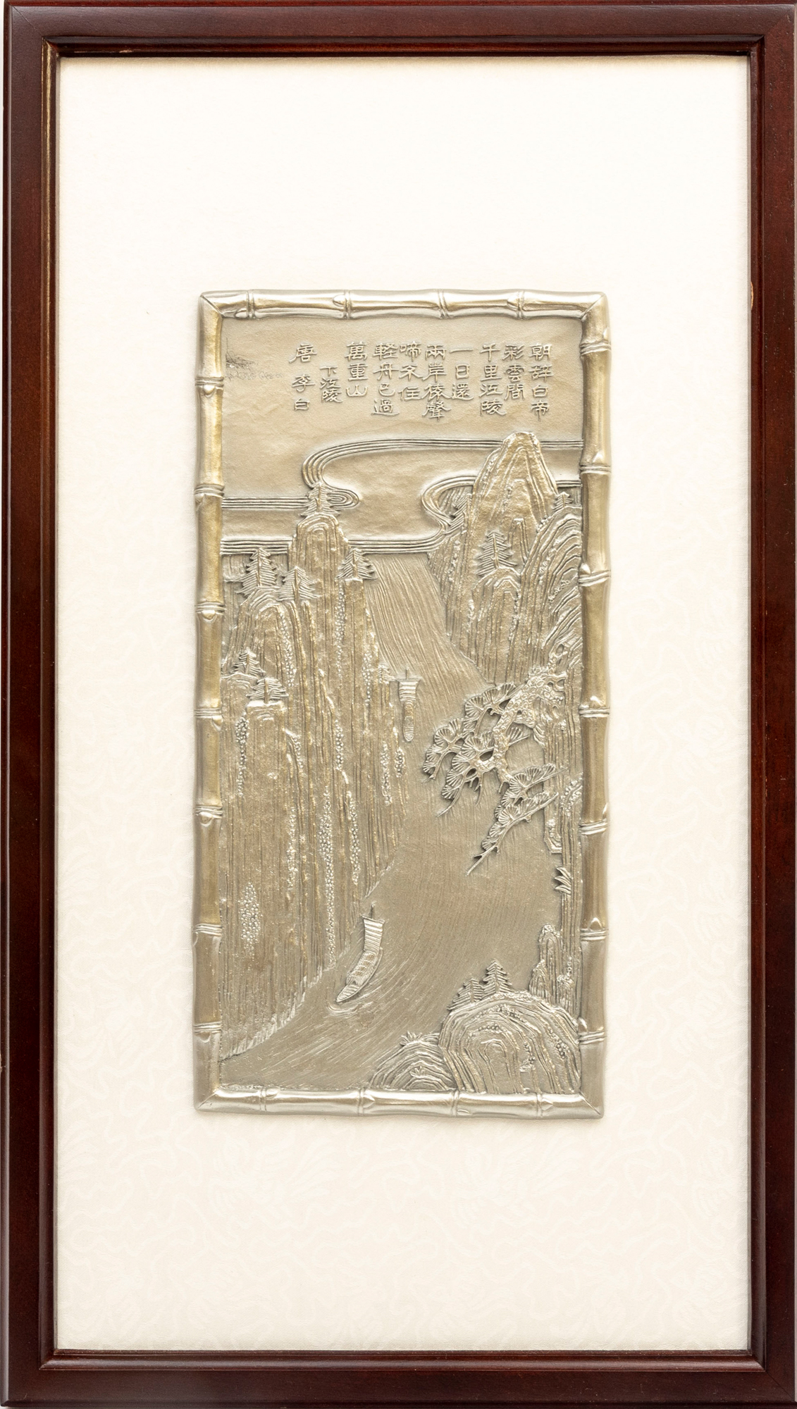 Royal Selangor pewter relief plaque showcasing a scene of Mount Lushan located in Jiujiang, China alongside a poem titled, "The Cataract in Mount Lu" by Tang Dynasty (618-907) poet Li Bai, aka "The Blue Lotus Recluse".
