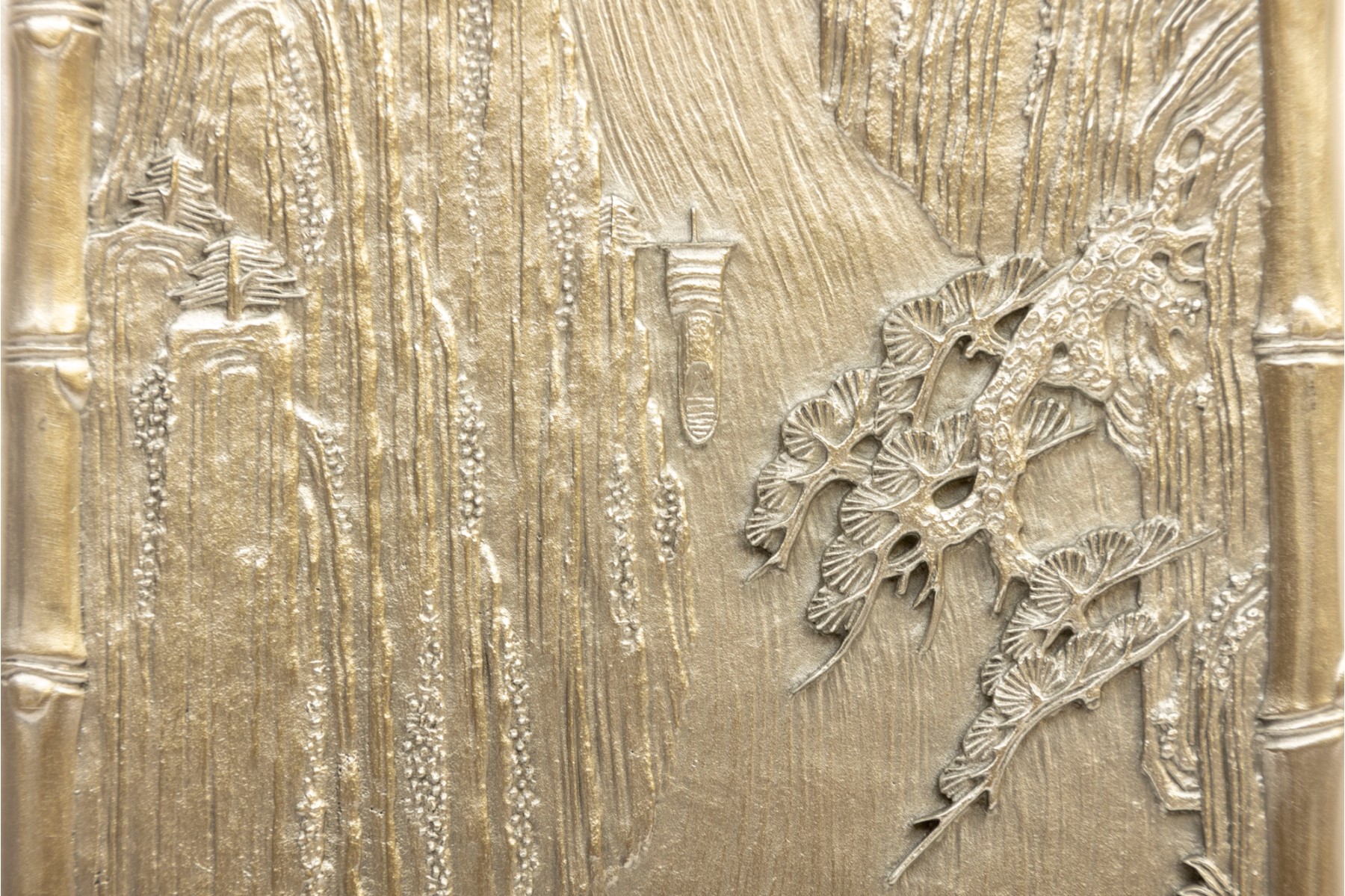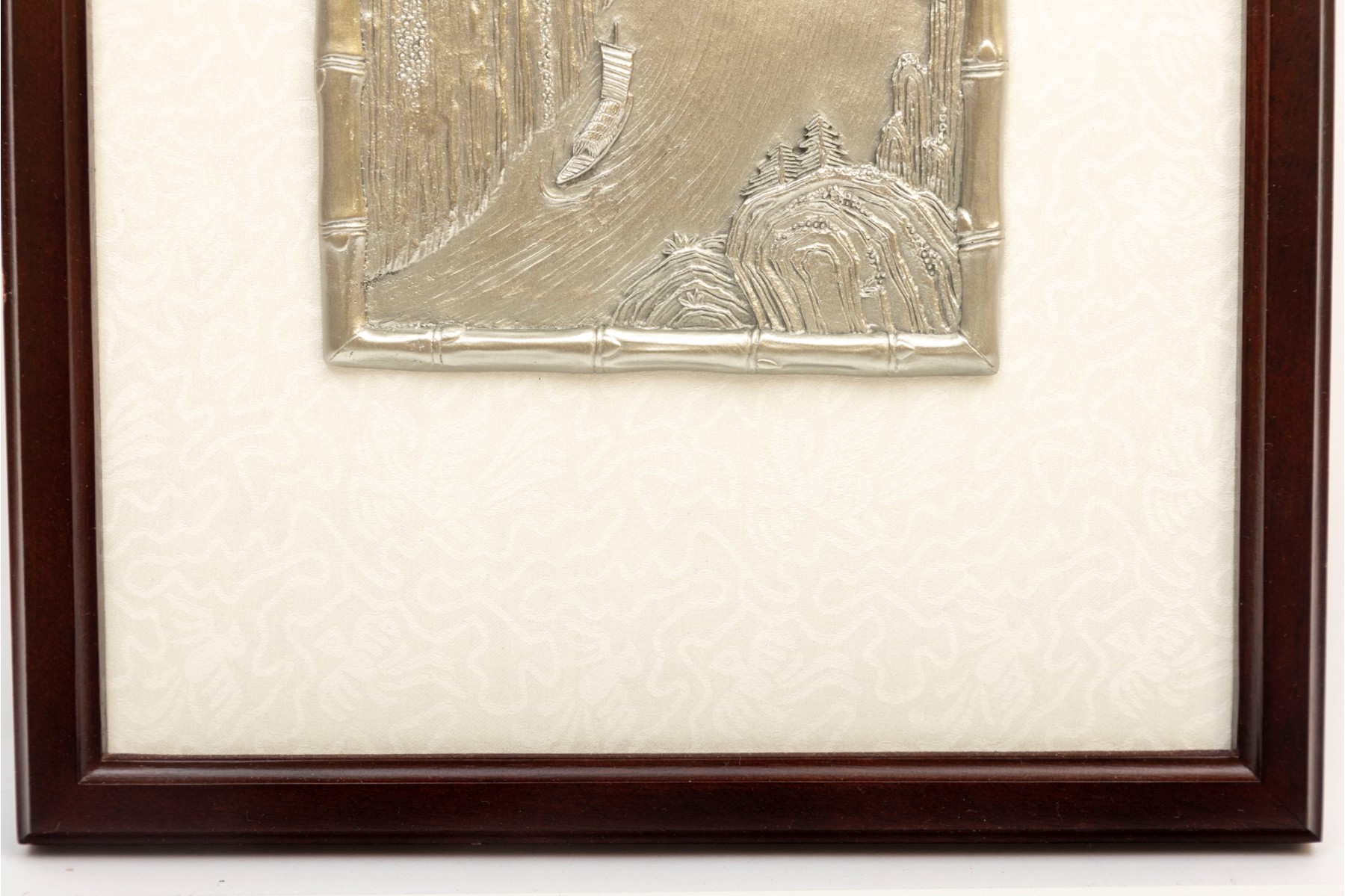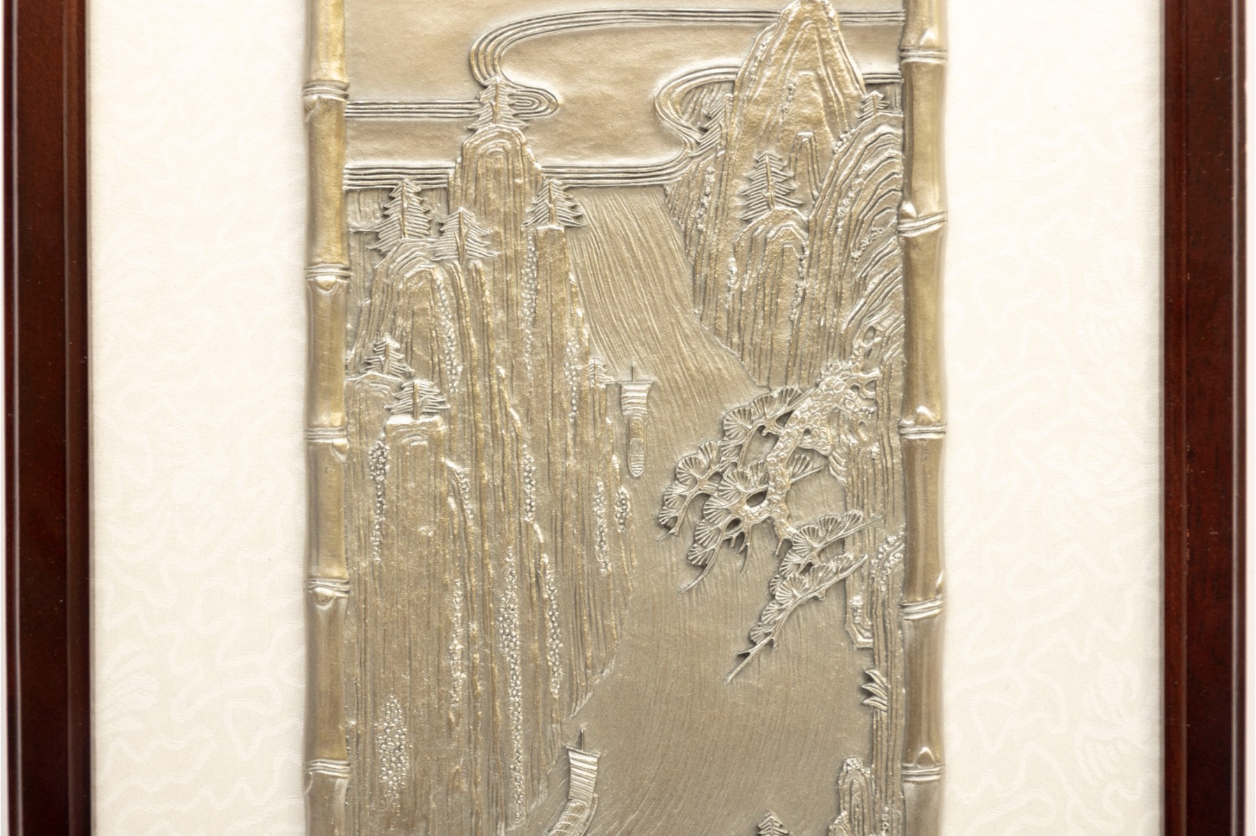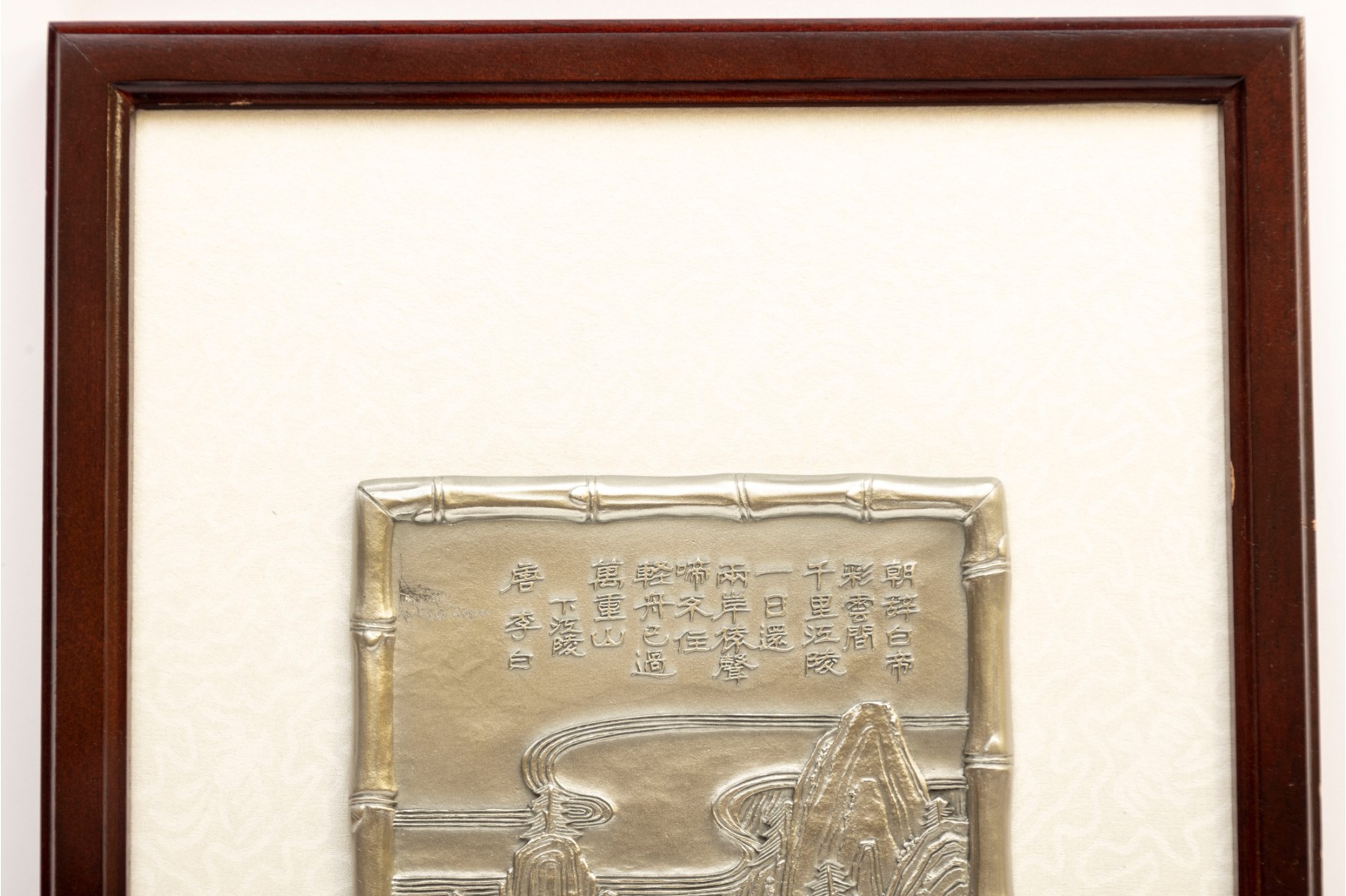 Royal Selangor pewter relief plaque showcasing a scene of Mount Lushan located in Jiujiang, China alongside a poem titled, "The Cataract in Mount Lu" by Tang Dynasty (618-907) poet Li Bai, aka "The Blue Lotus Recluse".