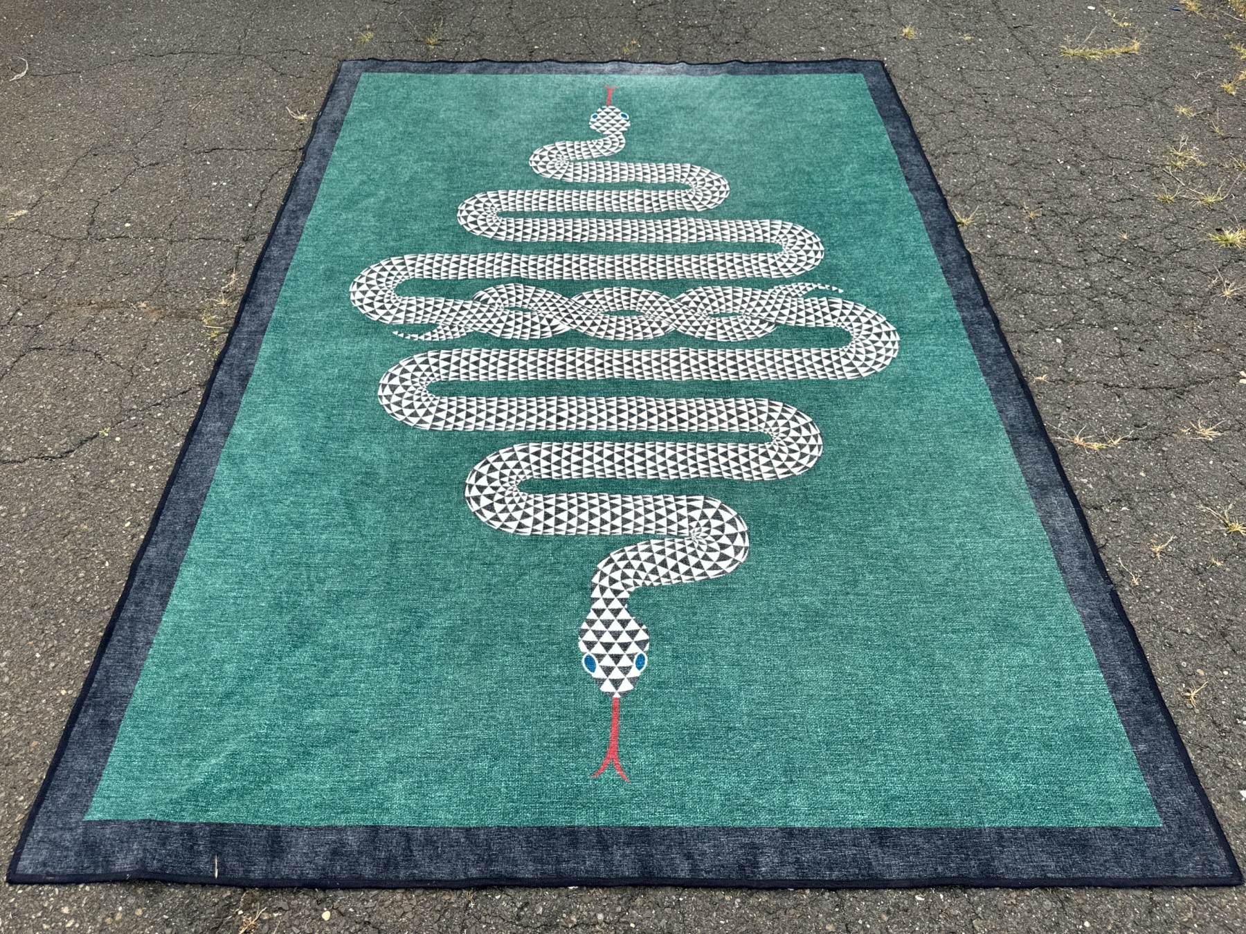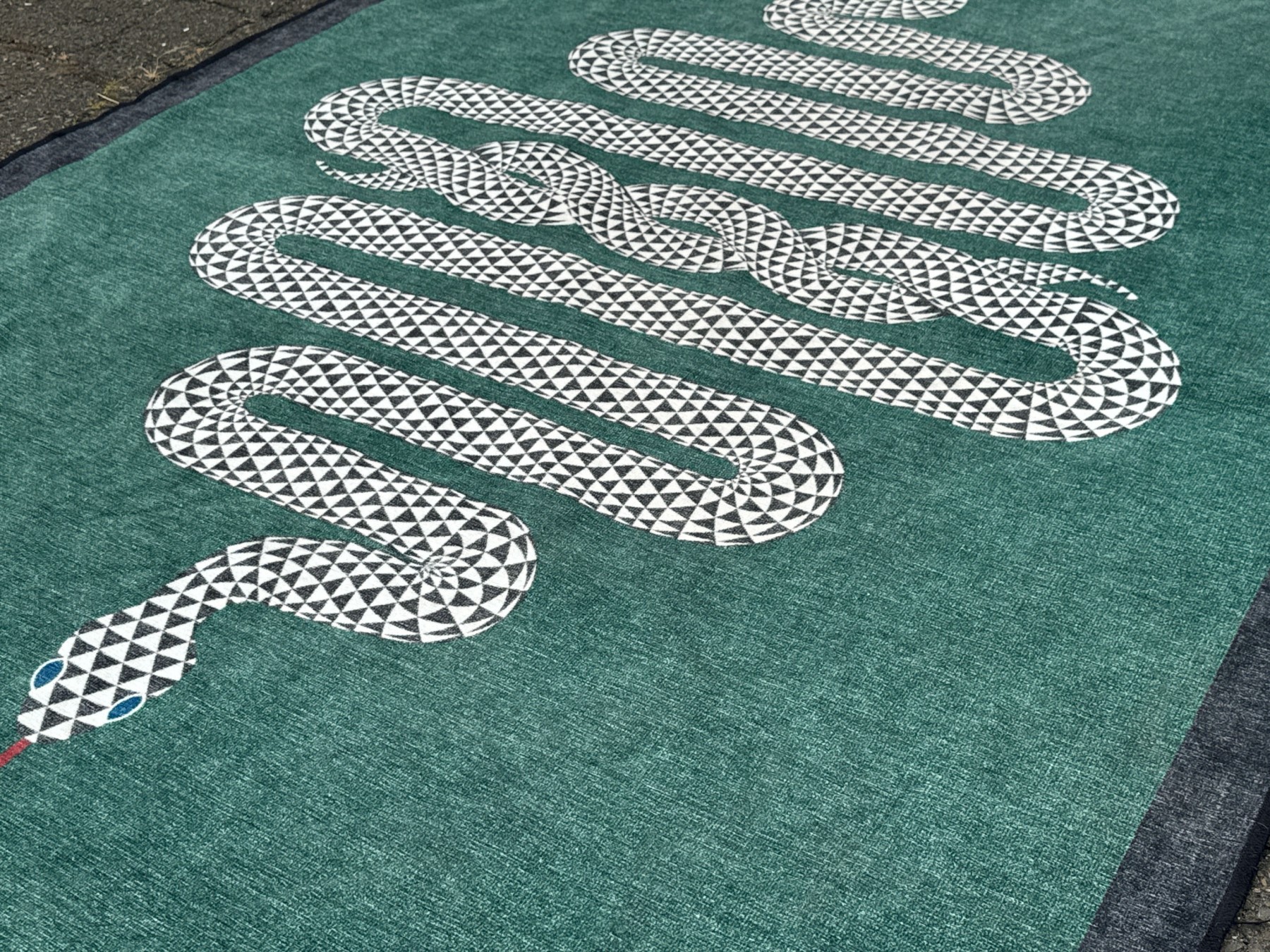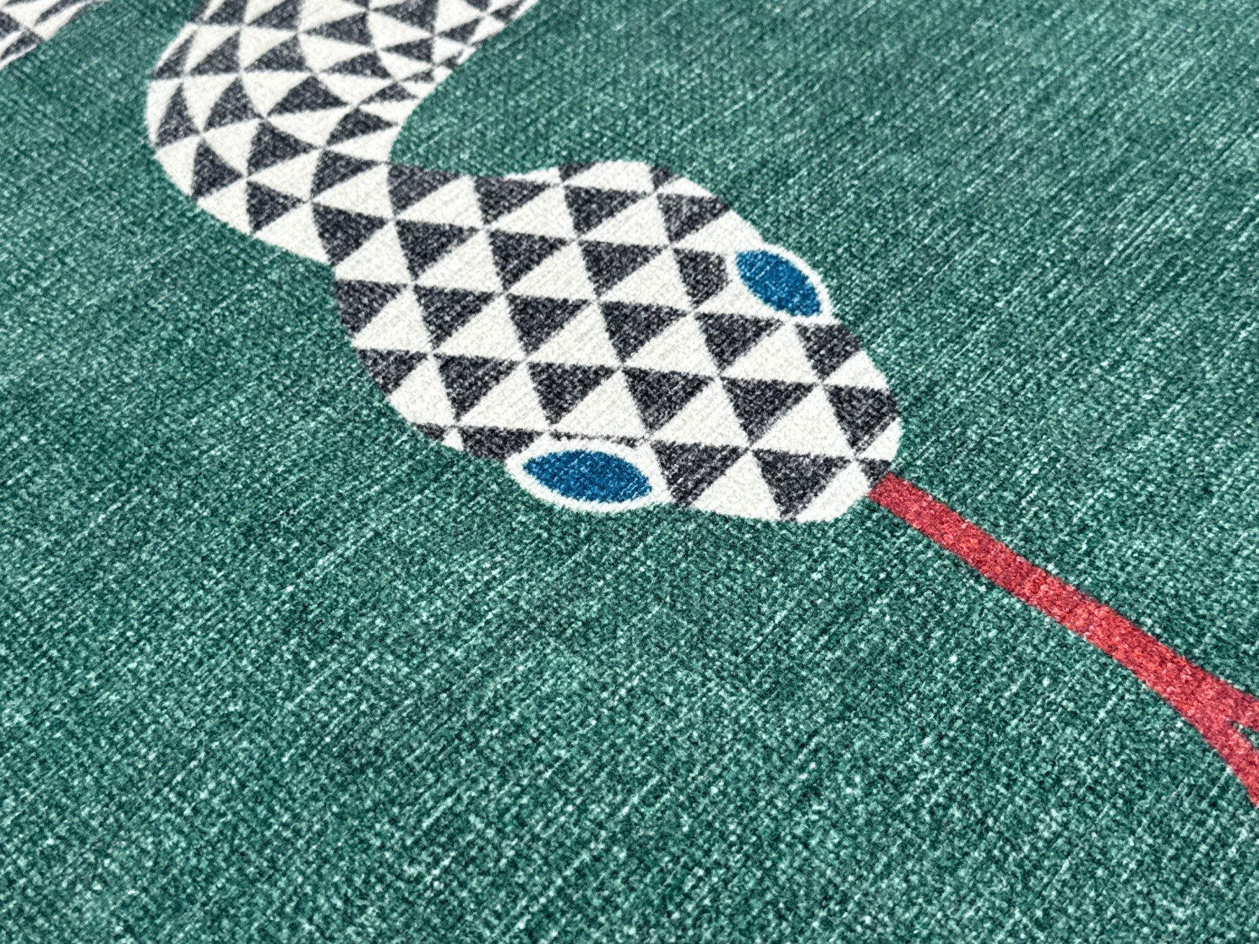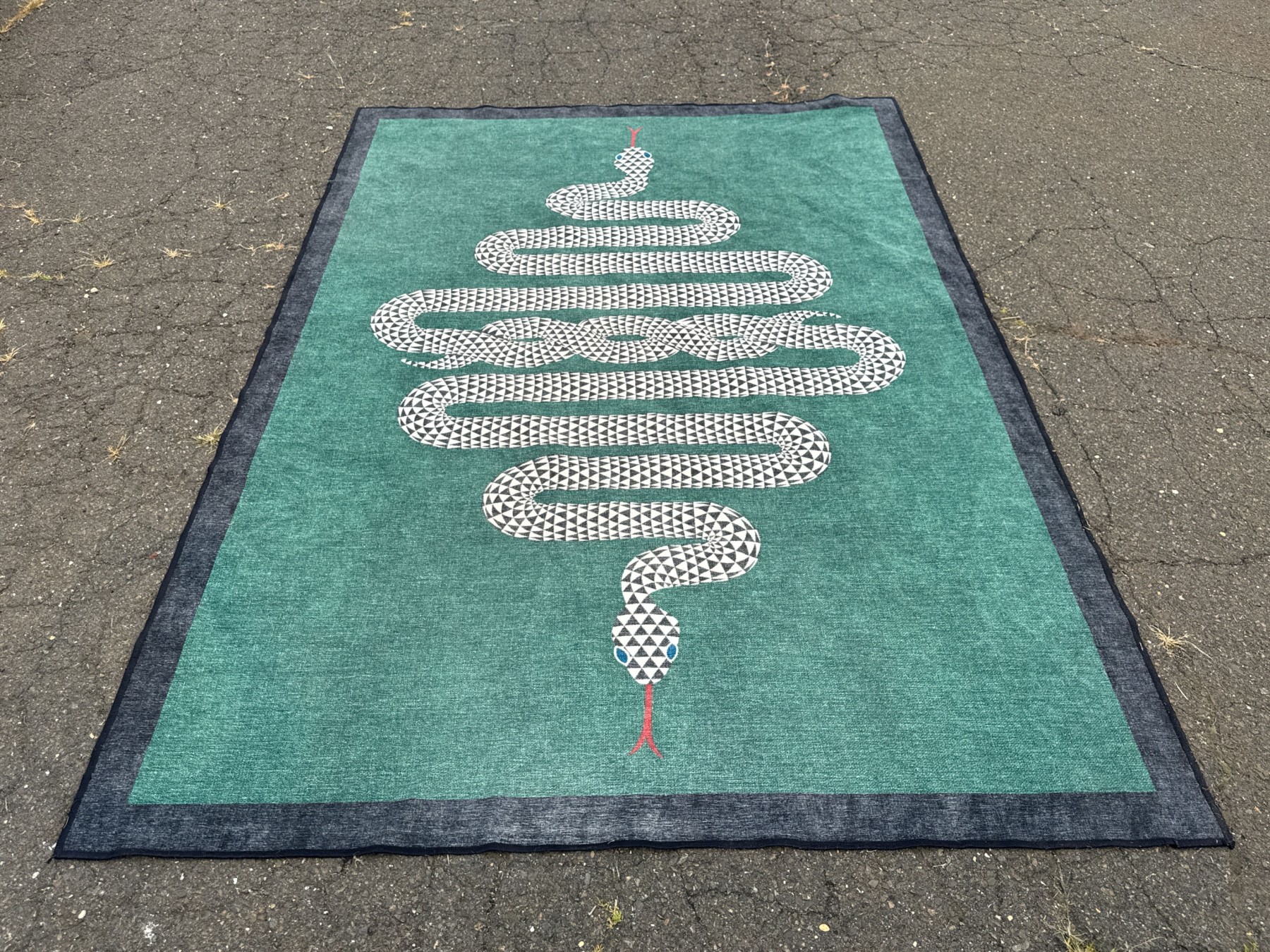With a fabulous design of two snakes with inter-coiled tails which meet in the center and appear to slither over the green ground central field.
