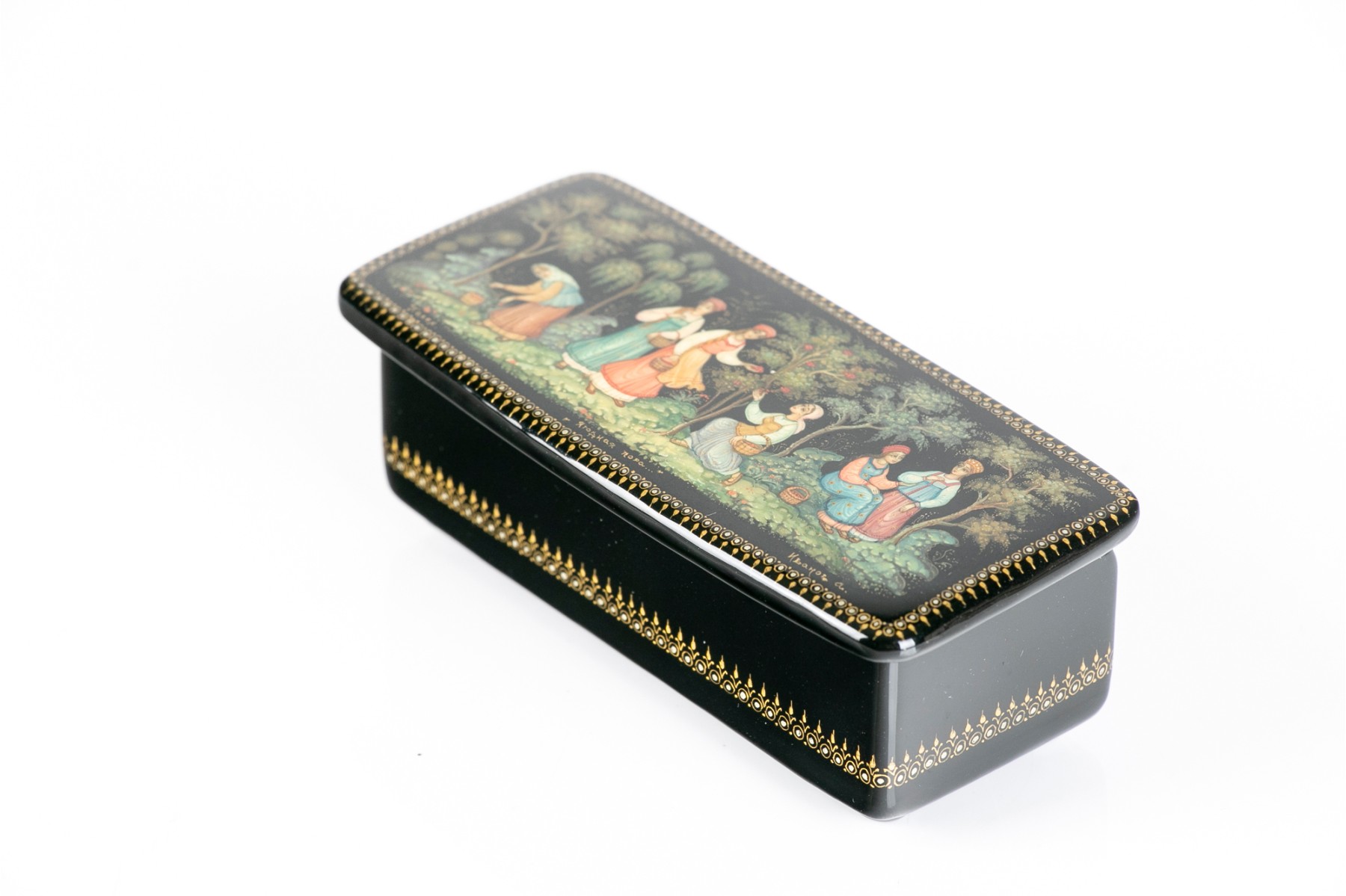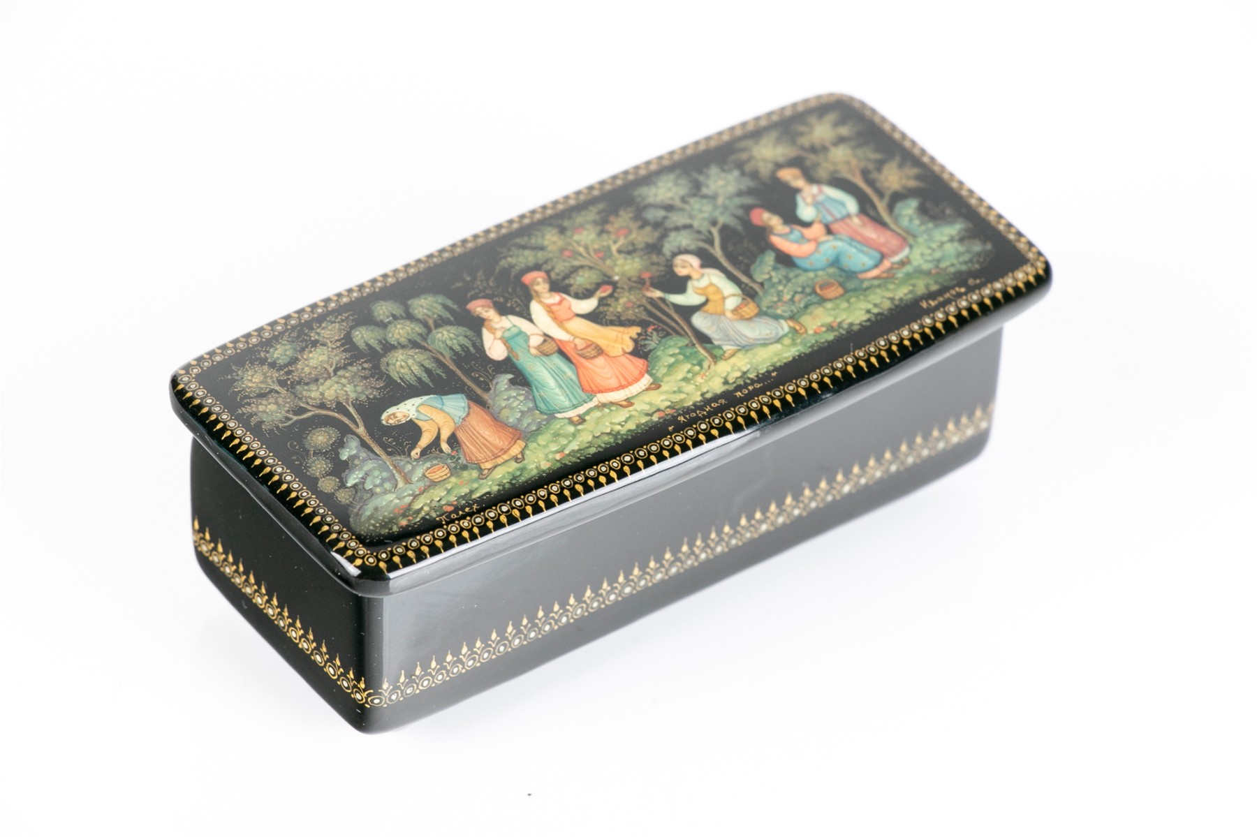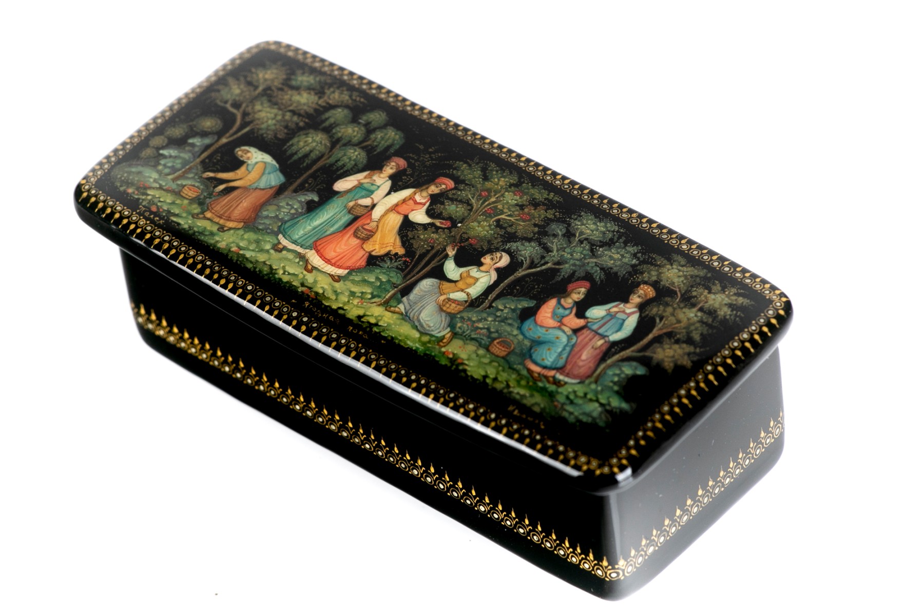 Vintage Russian hand painted lacquered box with hinged lid and inside red paint. The box decorated with women with baskets picking fruit. The hand-painted box is signed along the bottom edge.