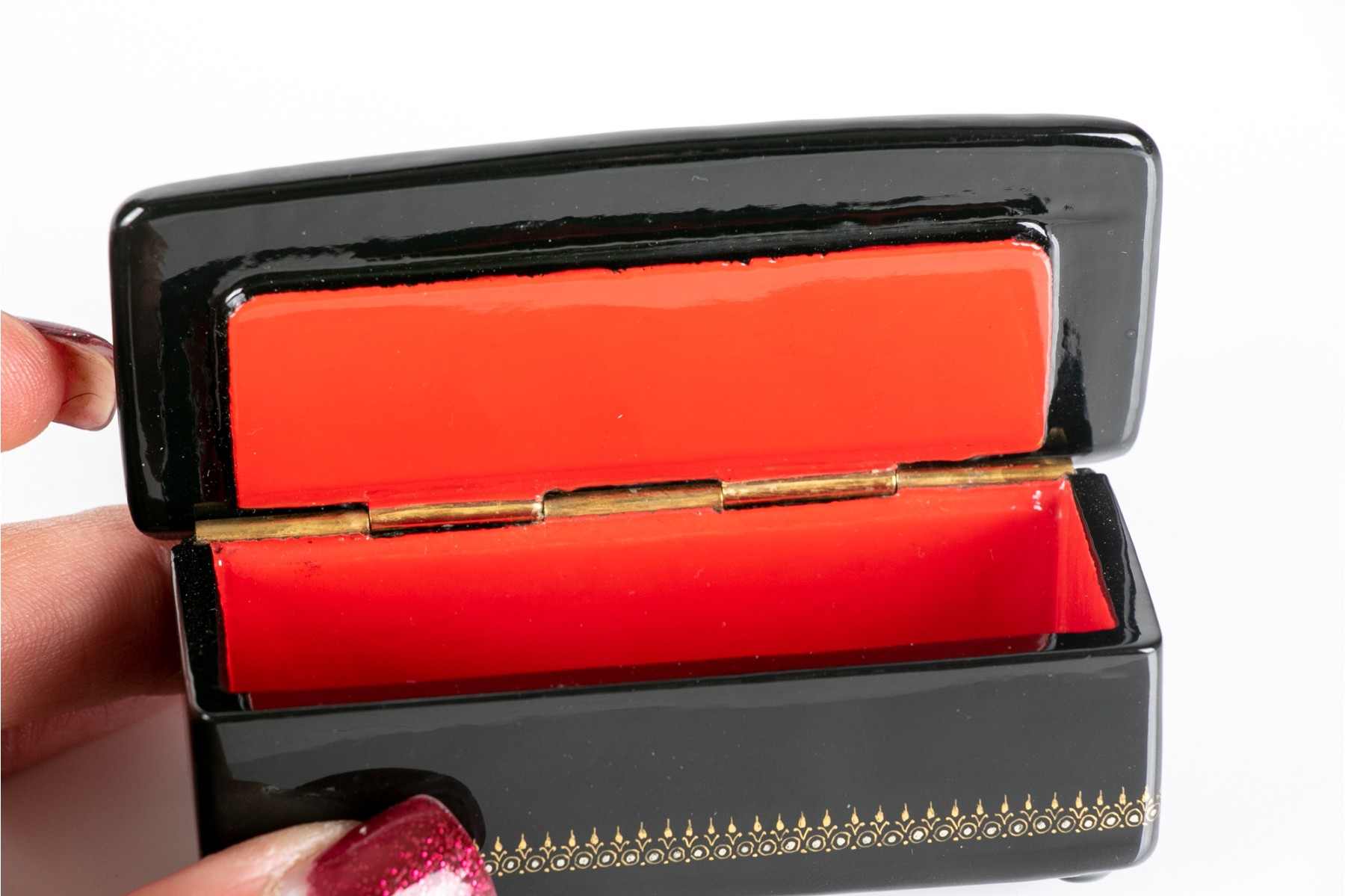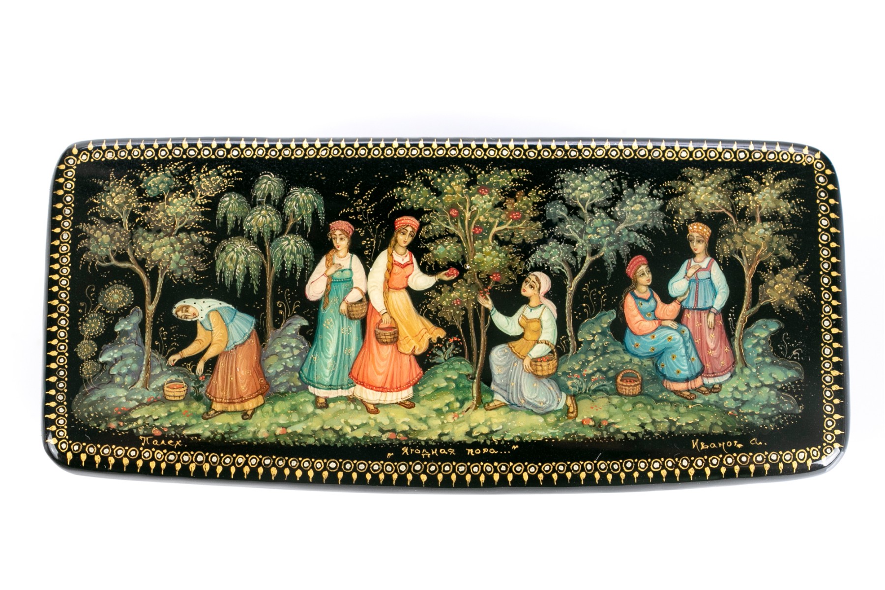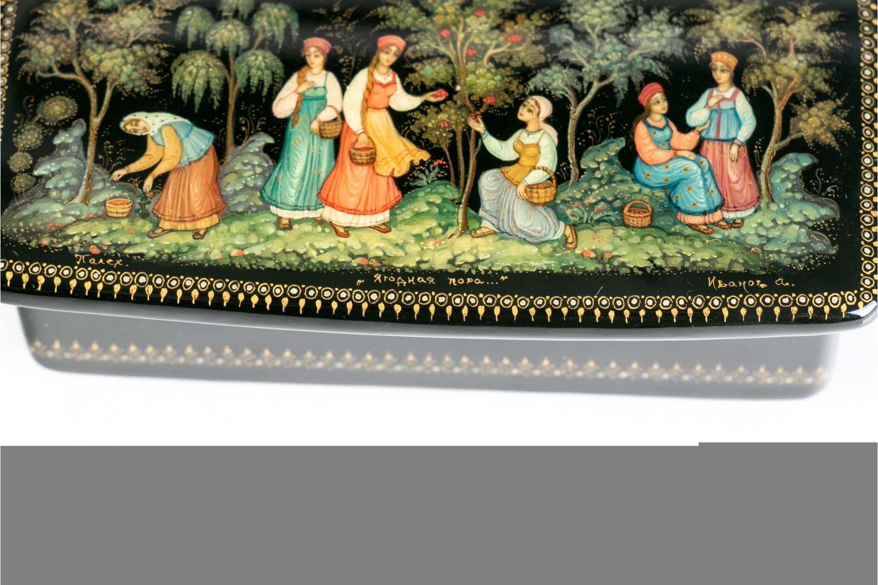 Vintage Russian hand painted lacquered box with hinged lid and inside red paint. The box decorated with women with baskets picking fruit. The hand-painted box is signed along the bottom edge.