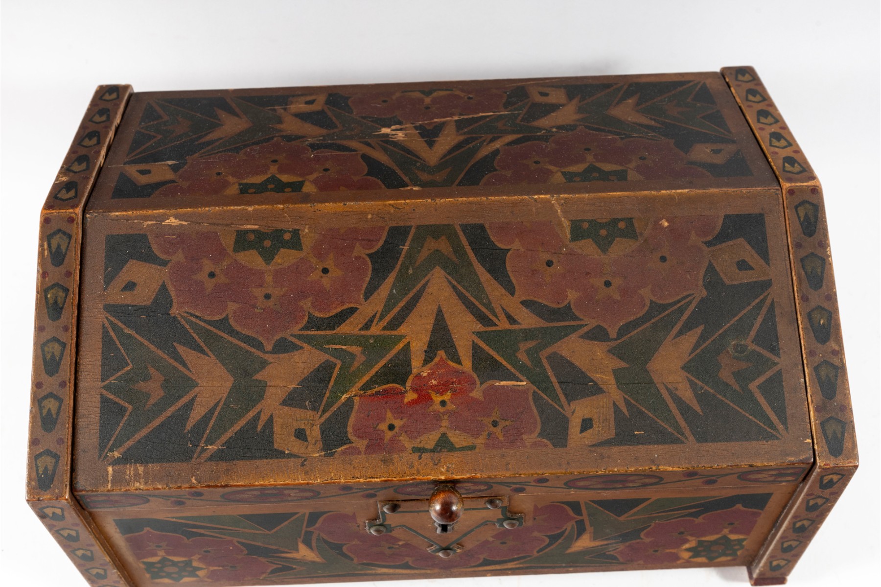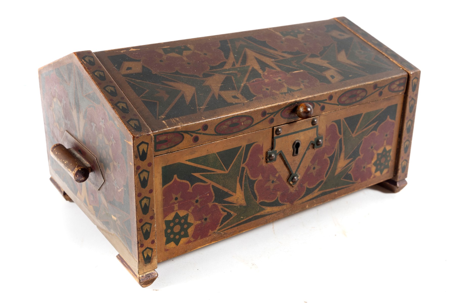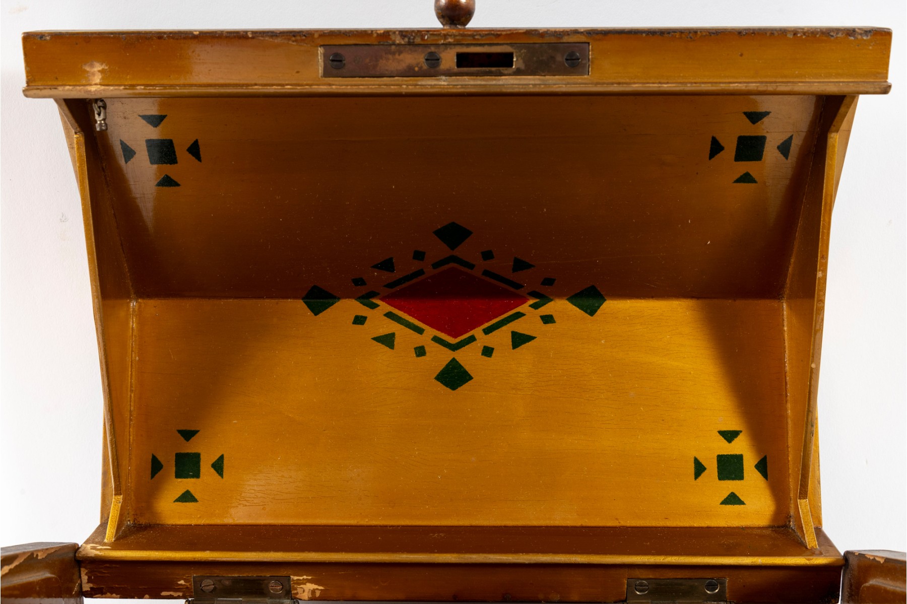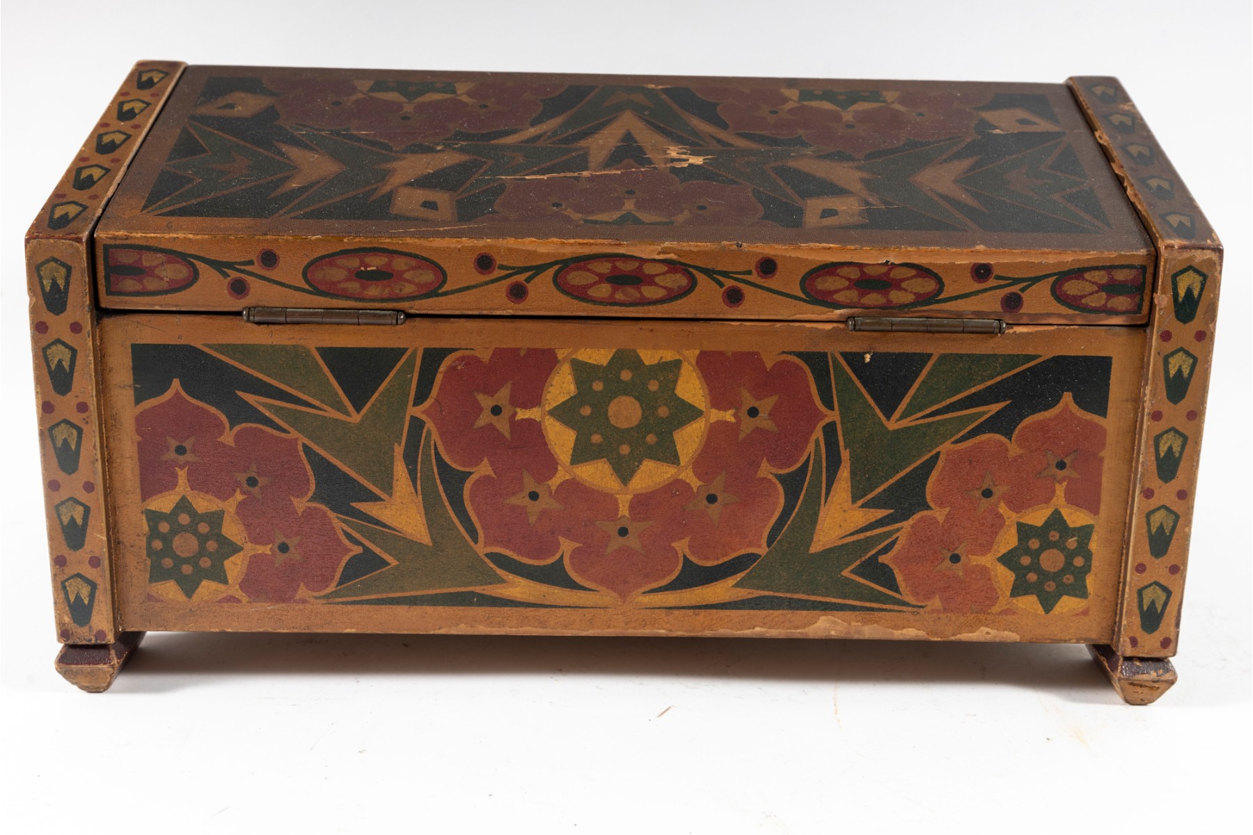A hand-painted, hinged wood box with handles and a fabric-lined interior. Vintage, 20th century -- marked "M" Russia in stencil. No key included.