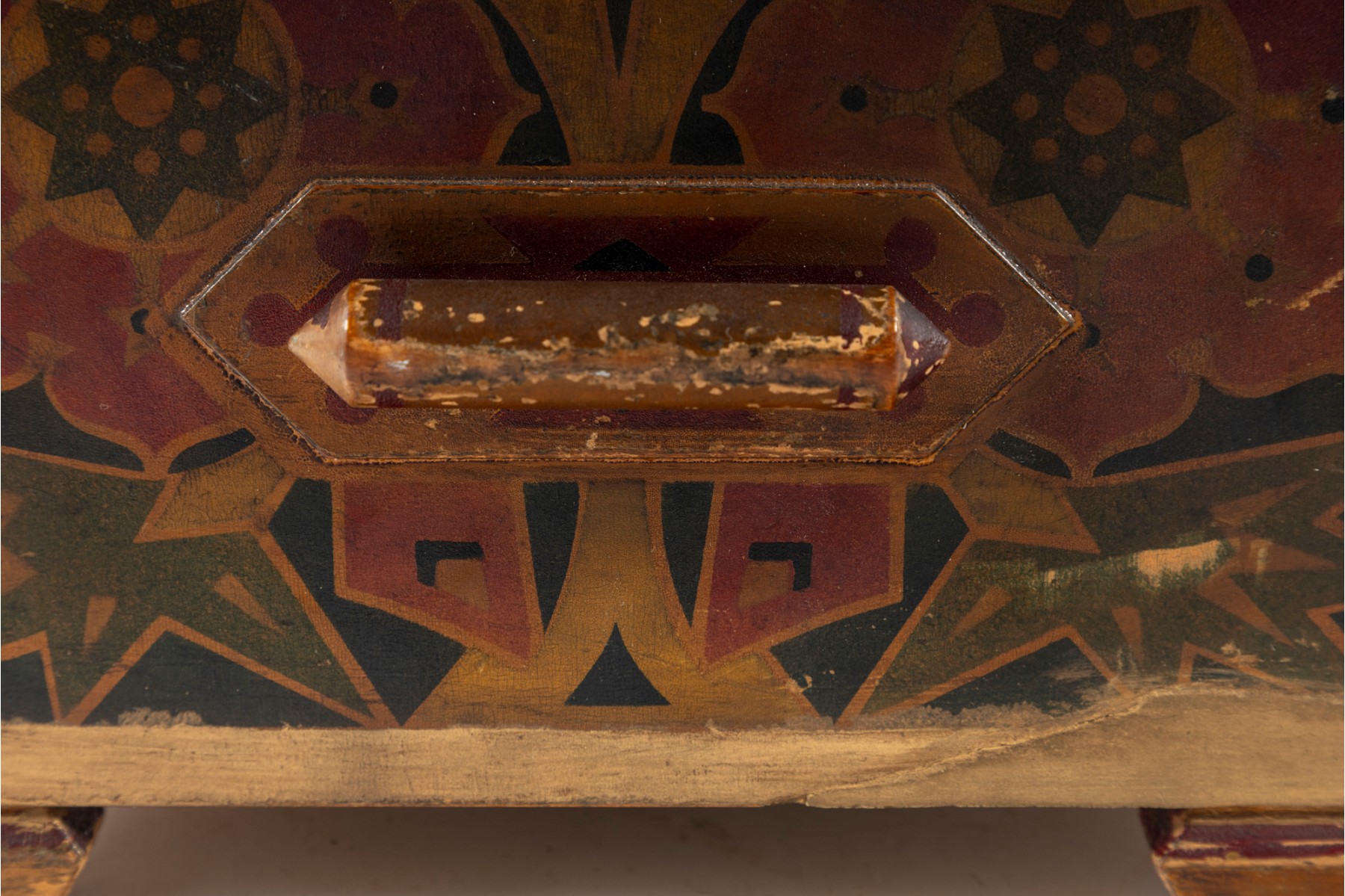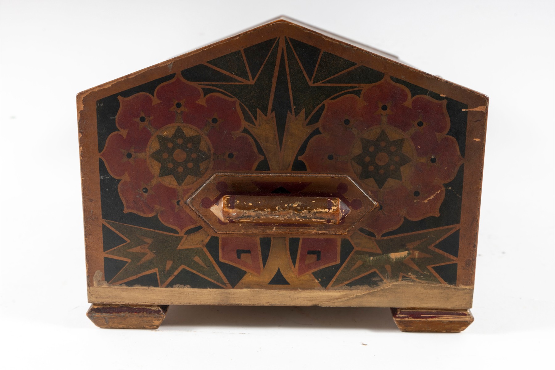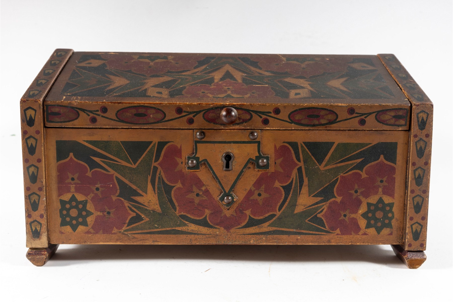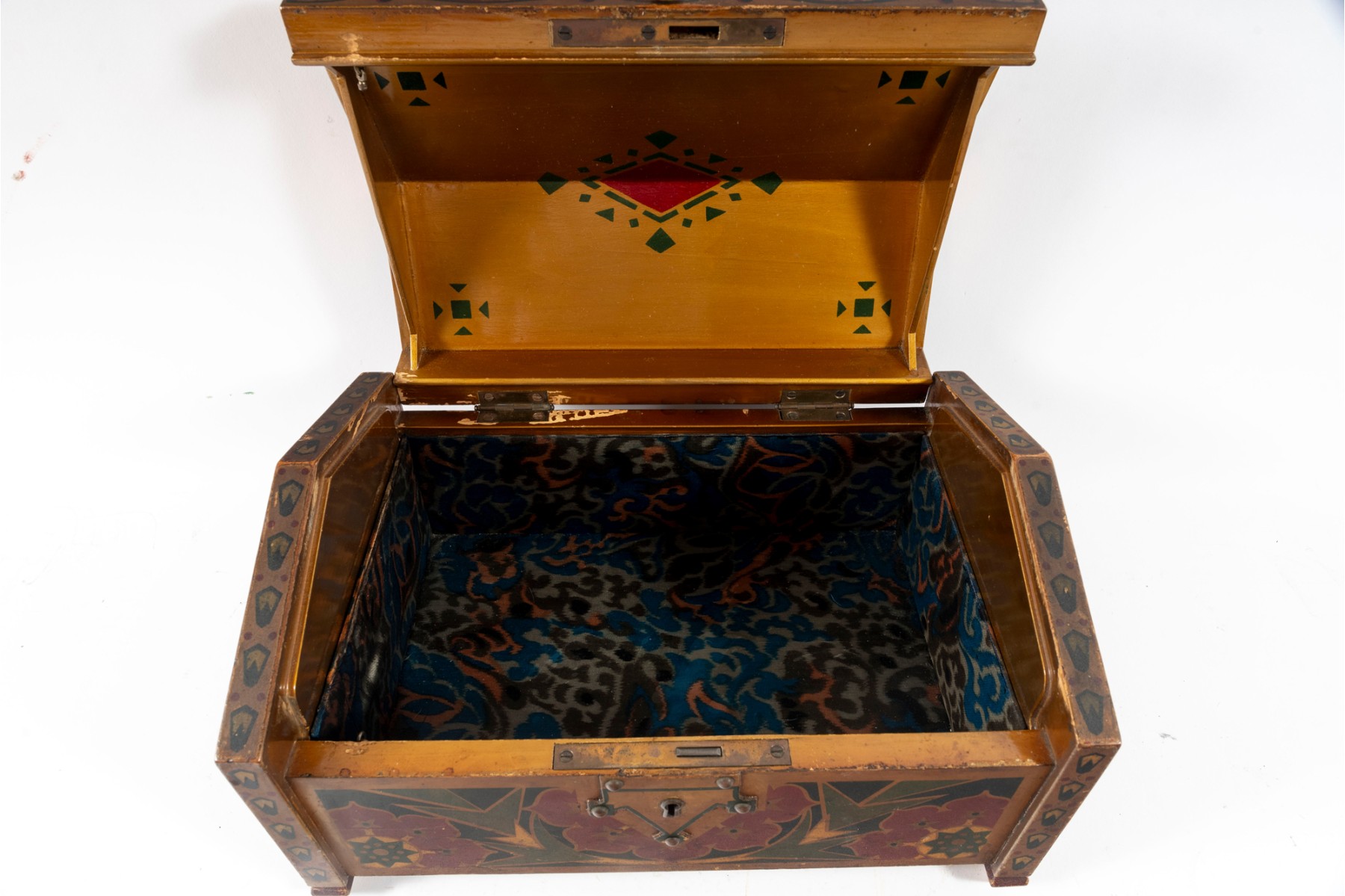 A hand-painted, hinged wood box with handles and a fabric-lined interior. Vintage, 20th century -- marked "M" Russia in stencil. No key included.