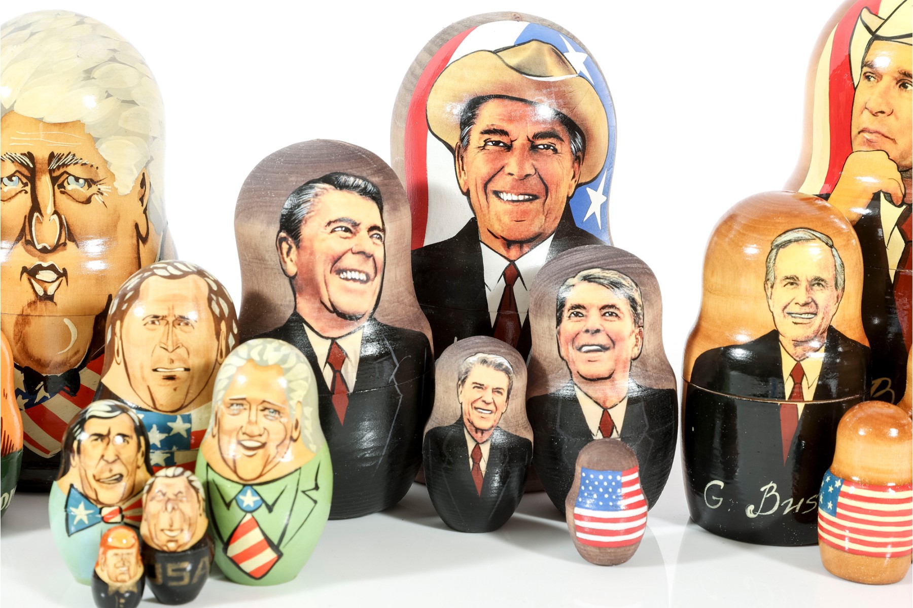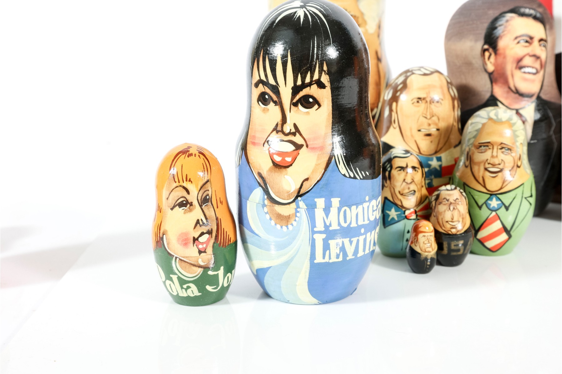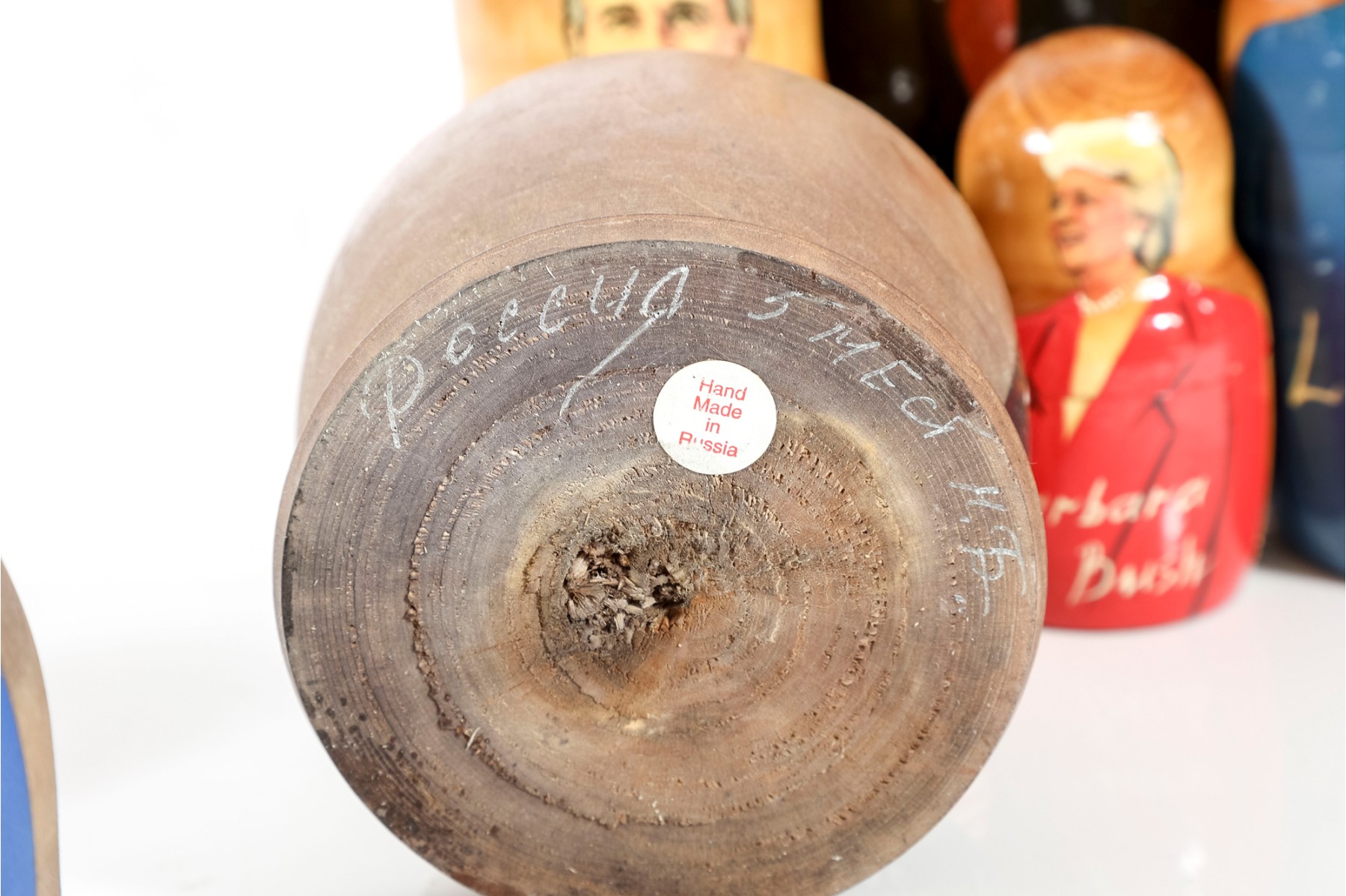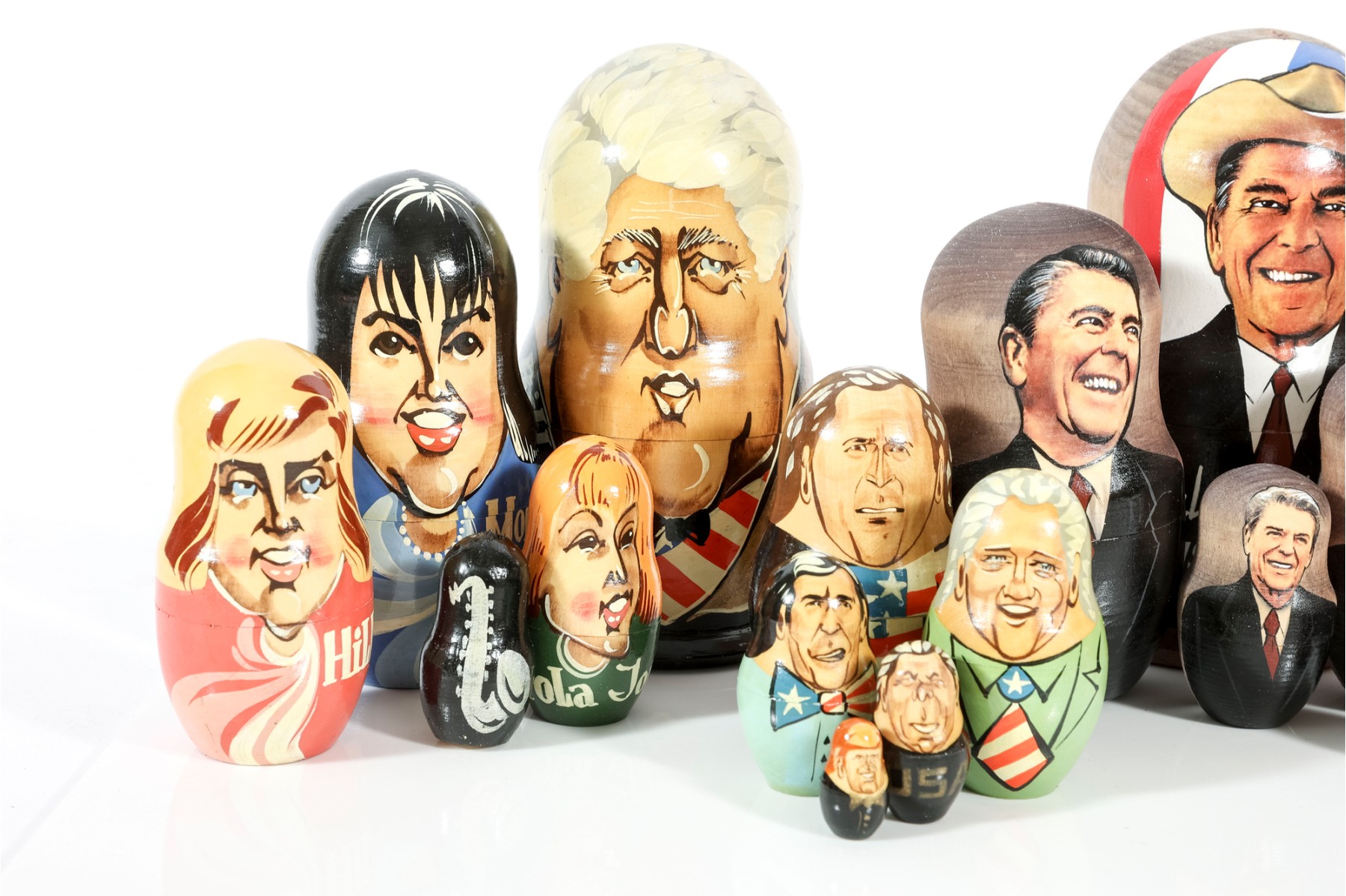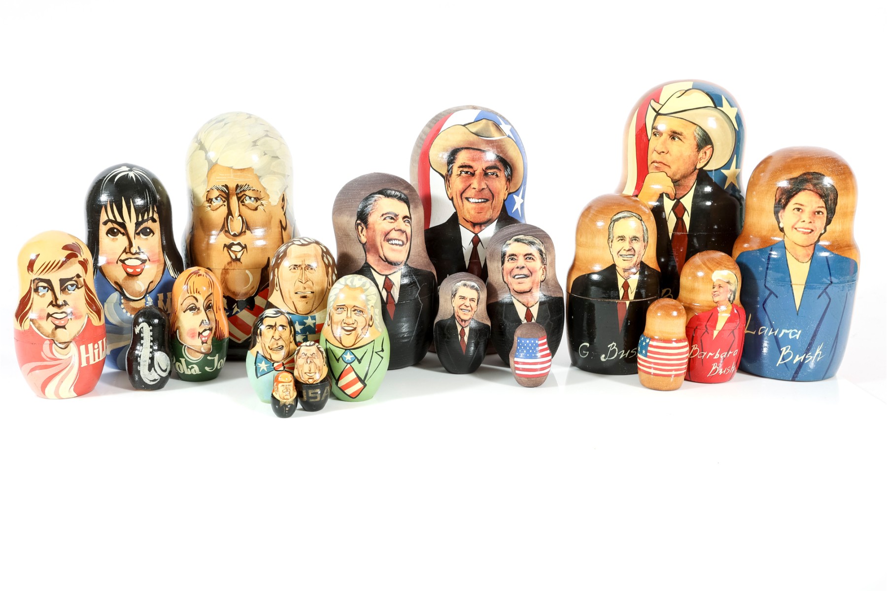 Twenty political and presidential Russian Matryoshka dolls, also known as Russian nesting dolls. Each example is hand-painted and varied in size for stacking. The largest examples are signed on the bottom.