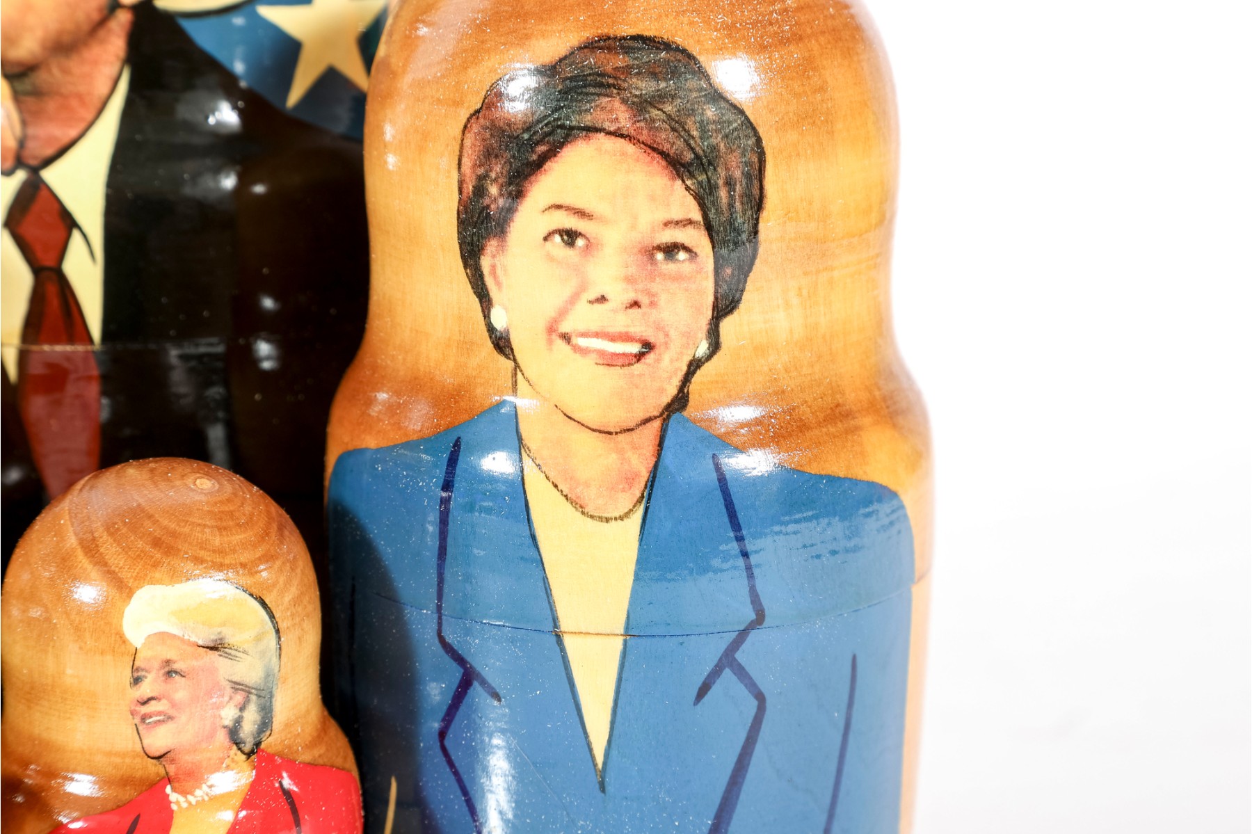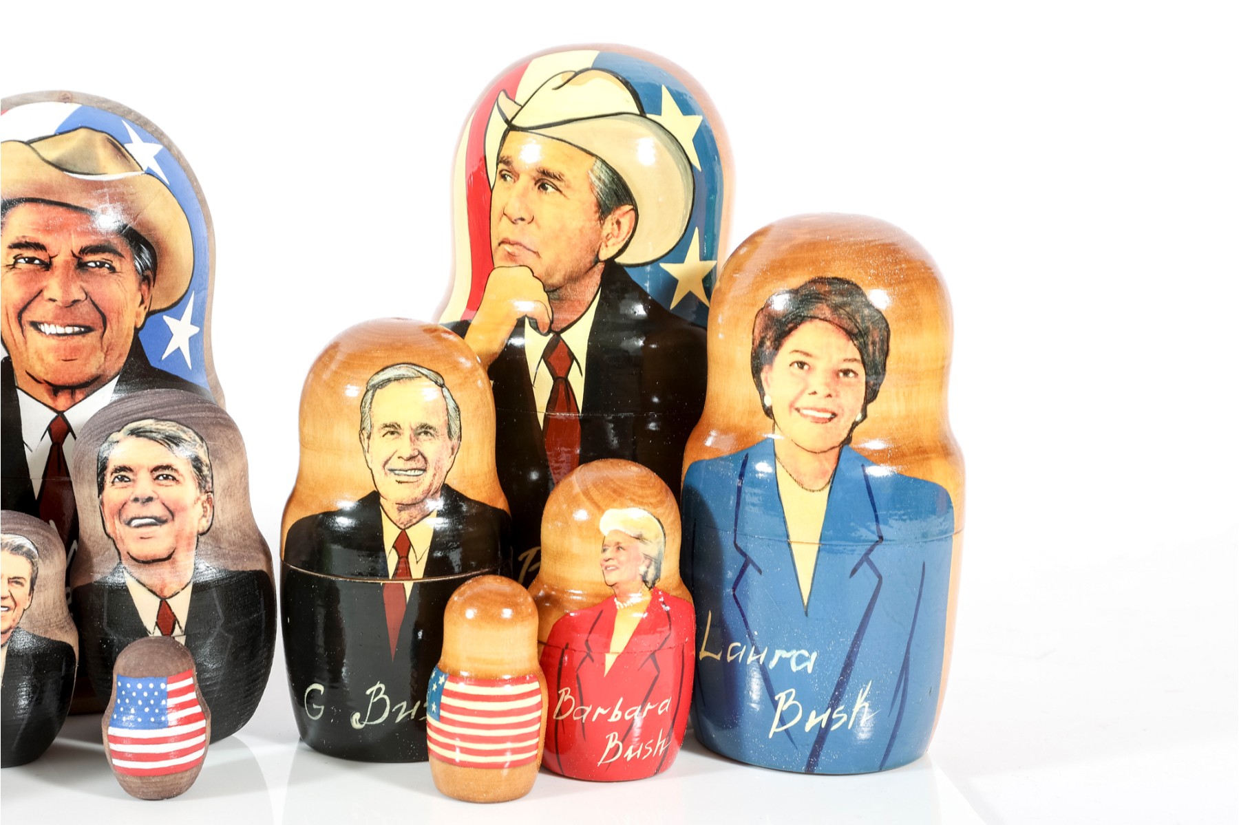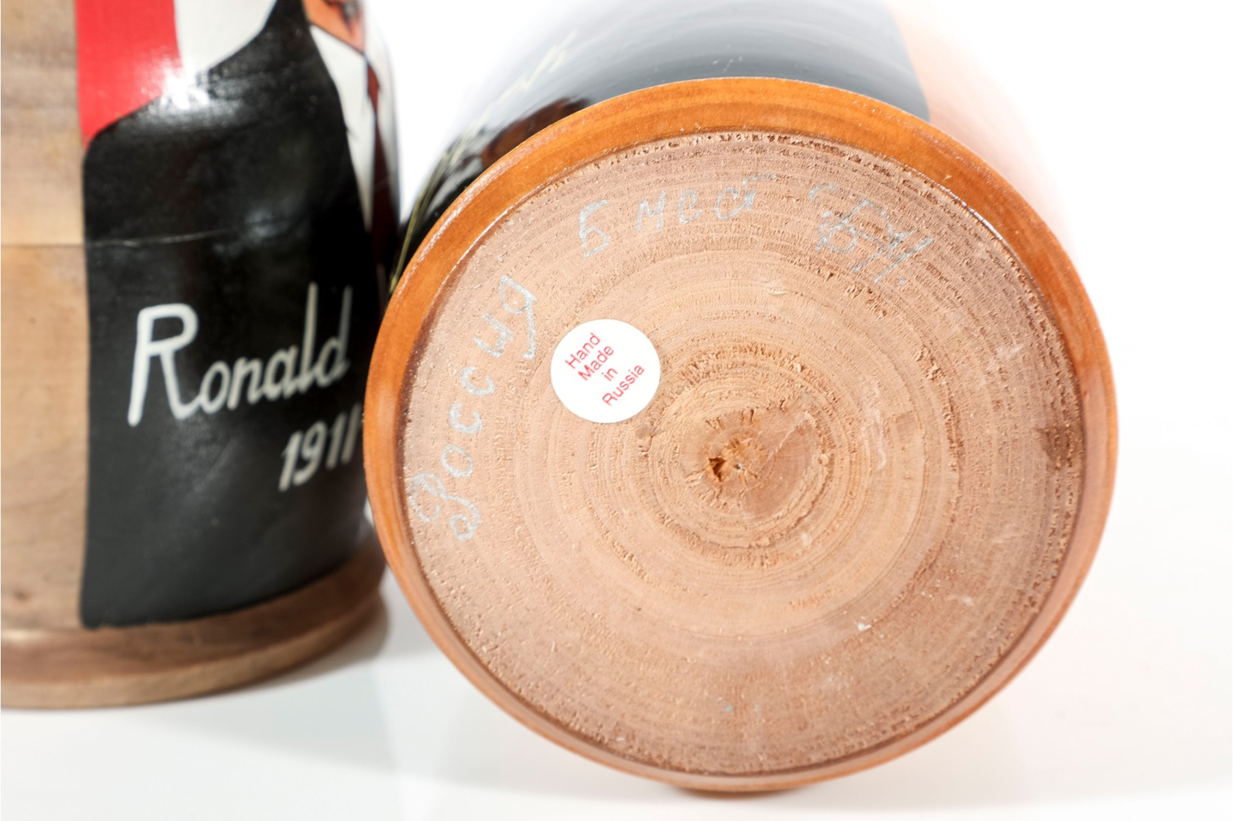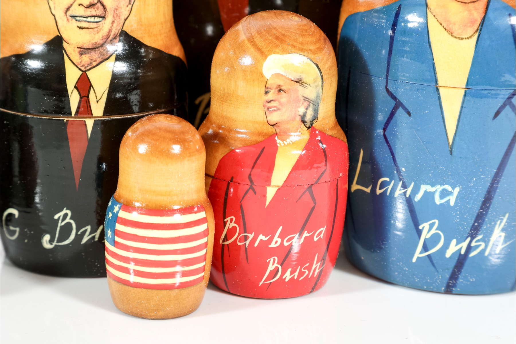 Twenty political and presidential Russian Matryoshka dolls, also known as Russian nesting dolls. Each example is hand-painted and varied in size for stacking. The largest examples are signed on the bottom.