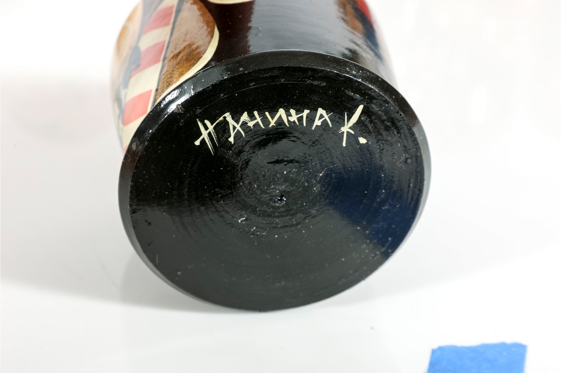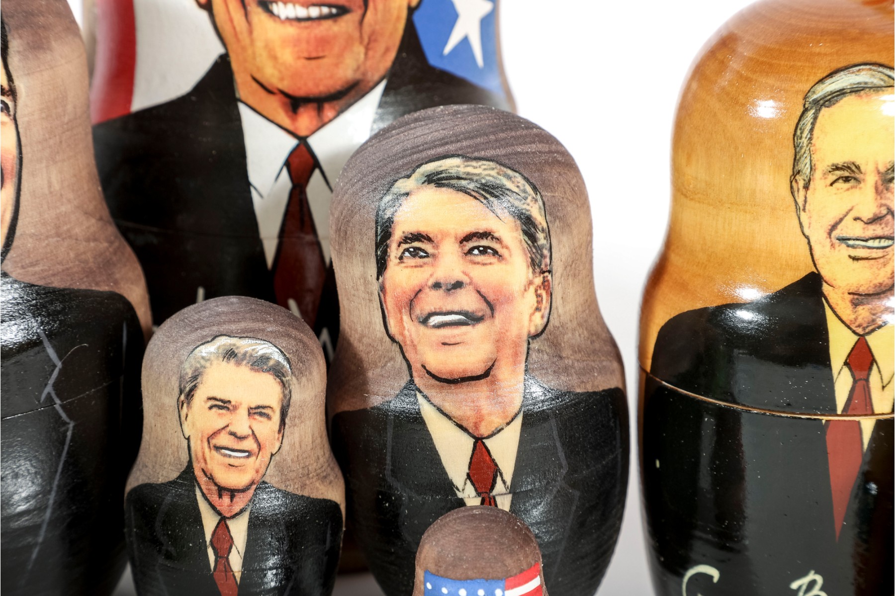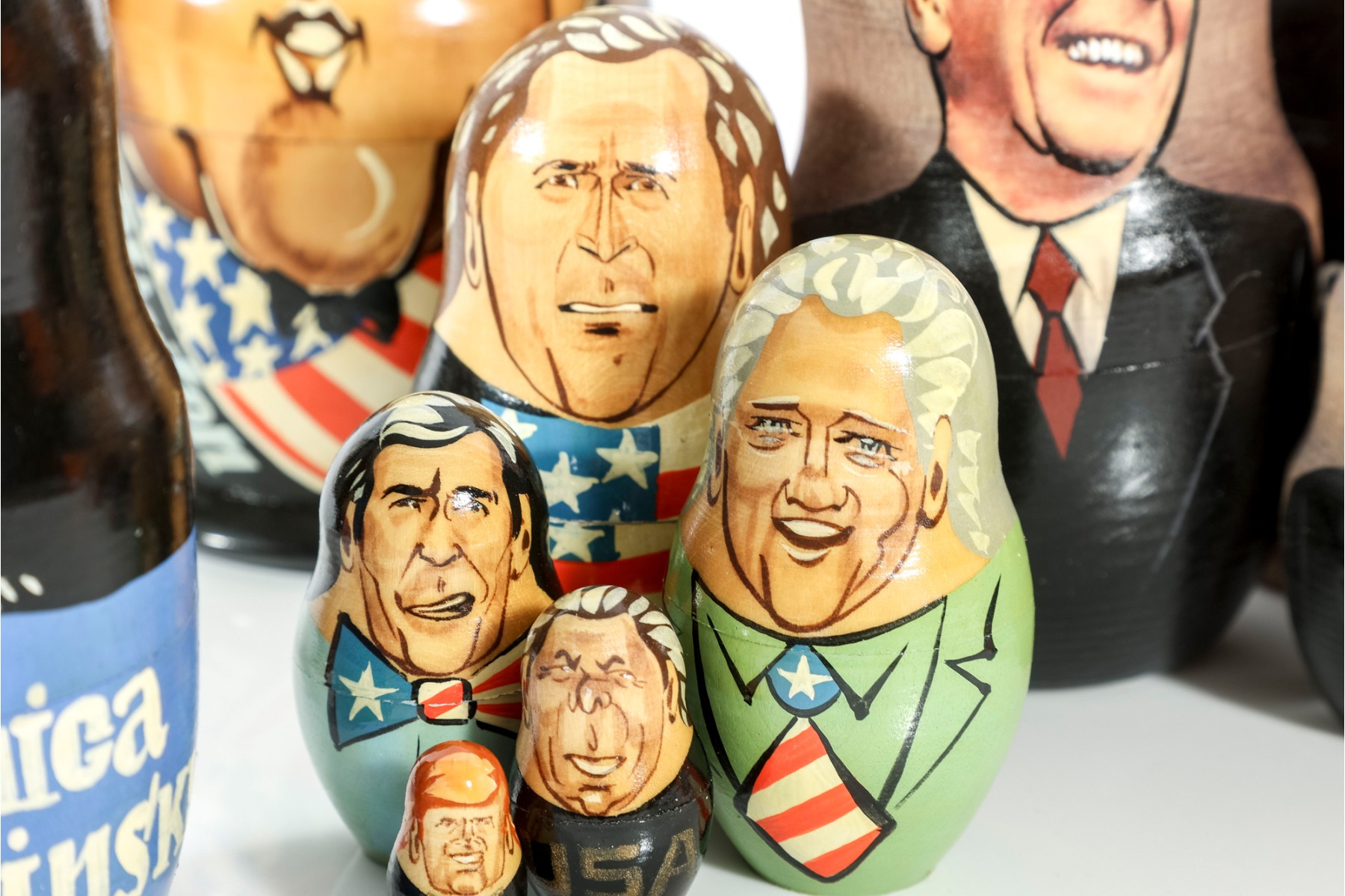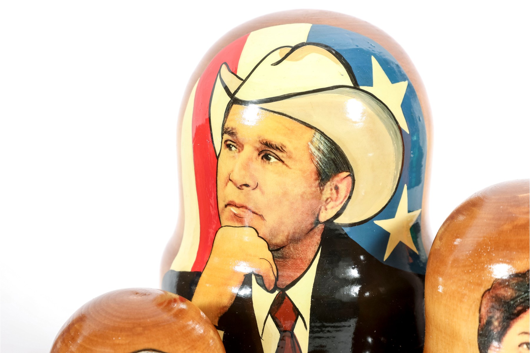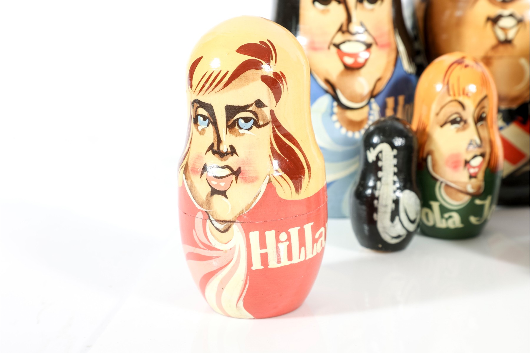 Twenty political and presidential Russian Matryoshka dolls, also known as Russian nesting dolls. Each example is hand-painted and varied in size for stacking. The largest examples are signed on the bottom.