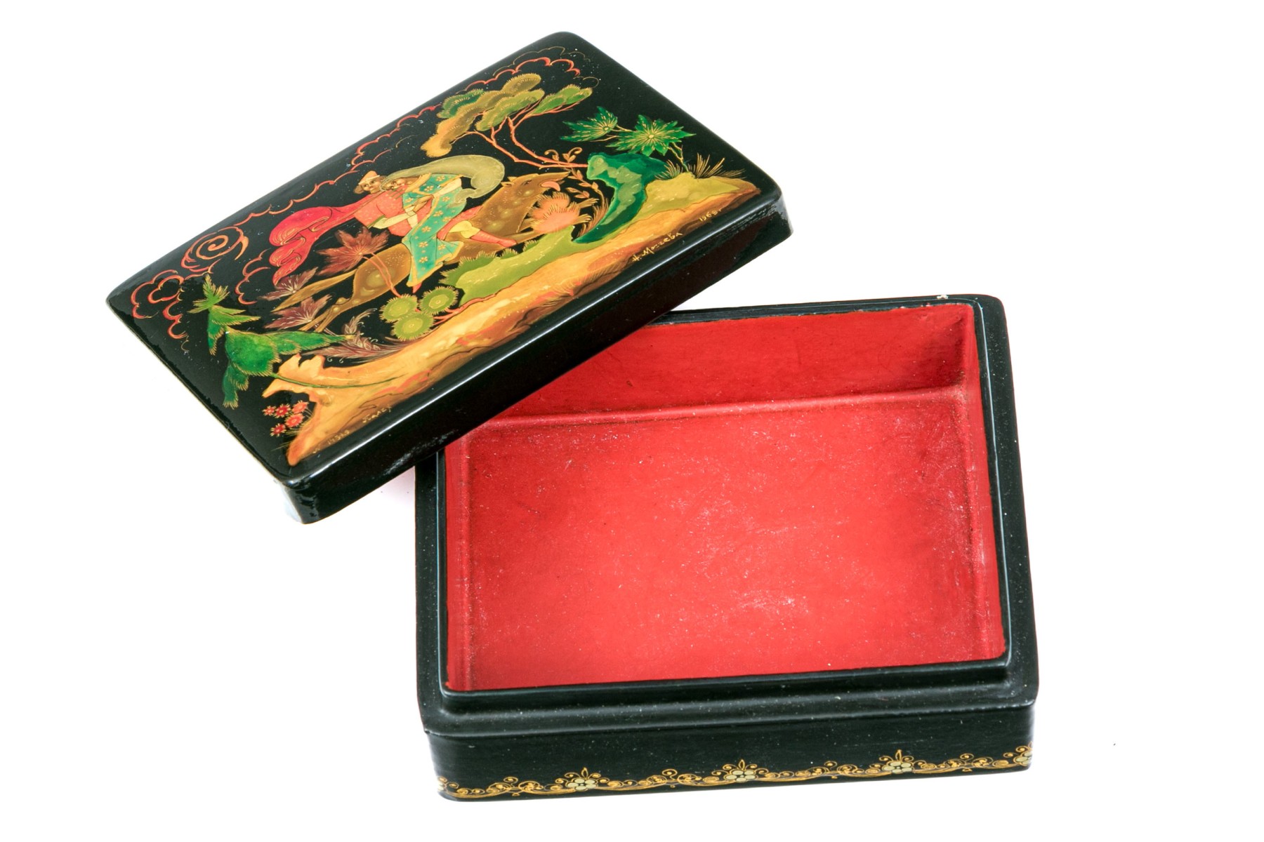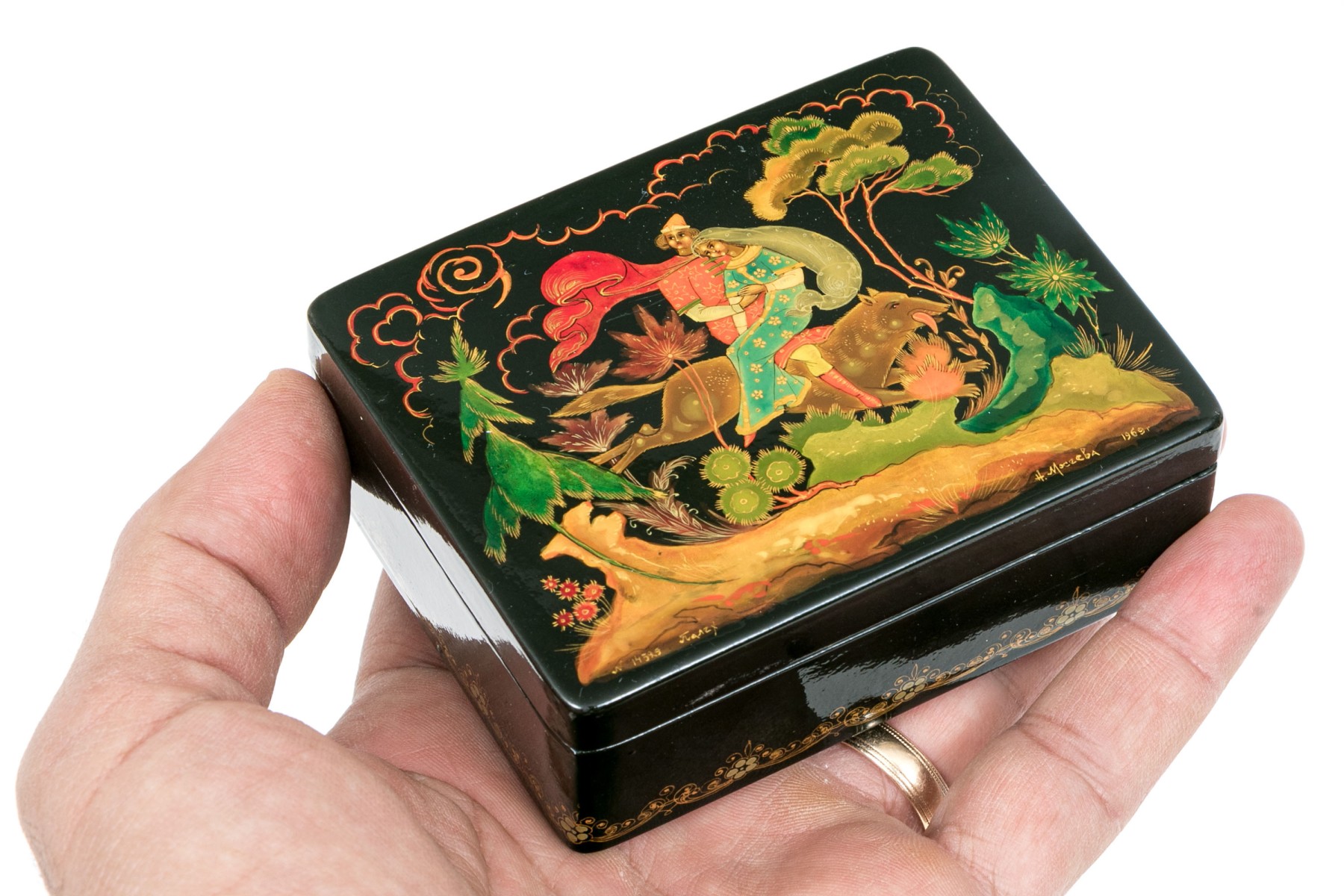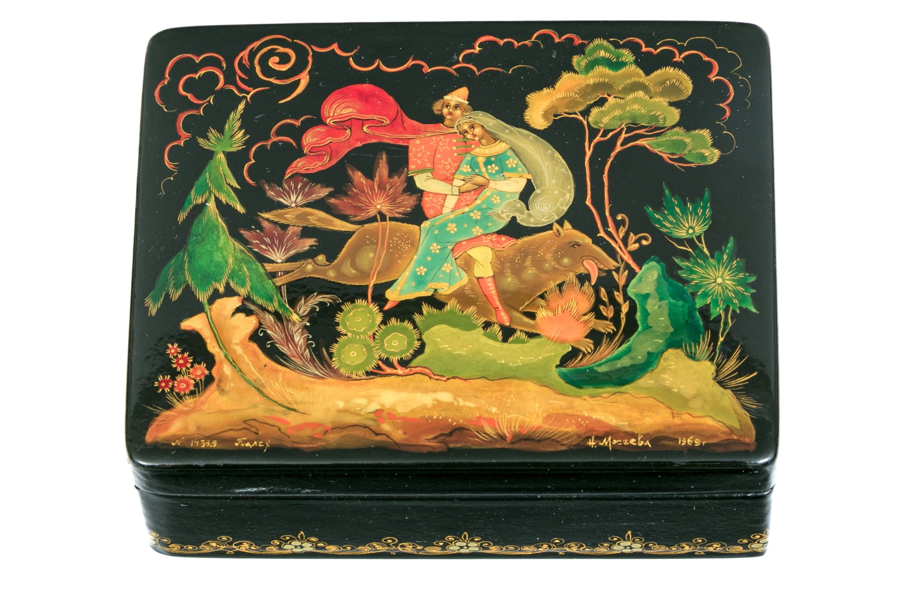 Russian stunning rectangular folk art black lacquer box, "Ivan Tsarevich Riding the Gray Wolf" theme, red interior