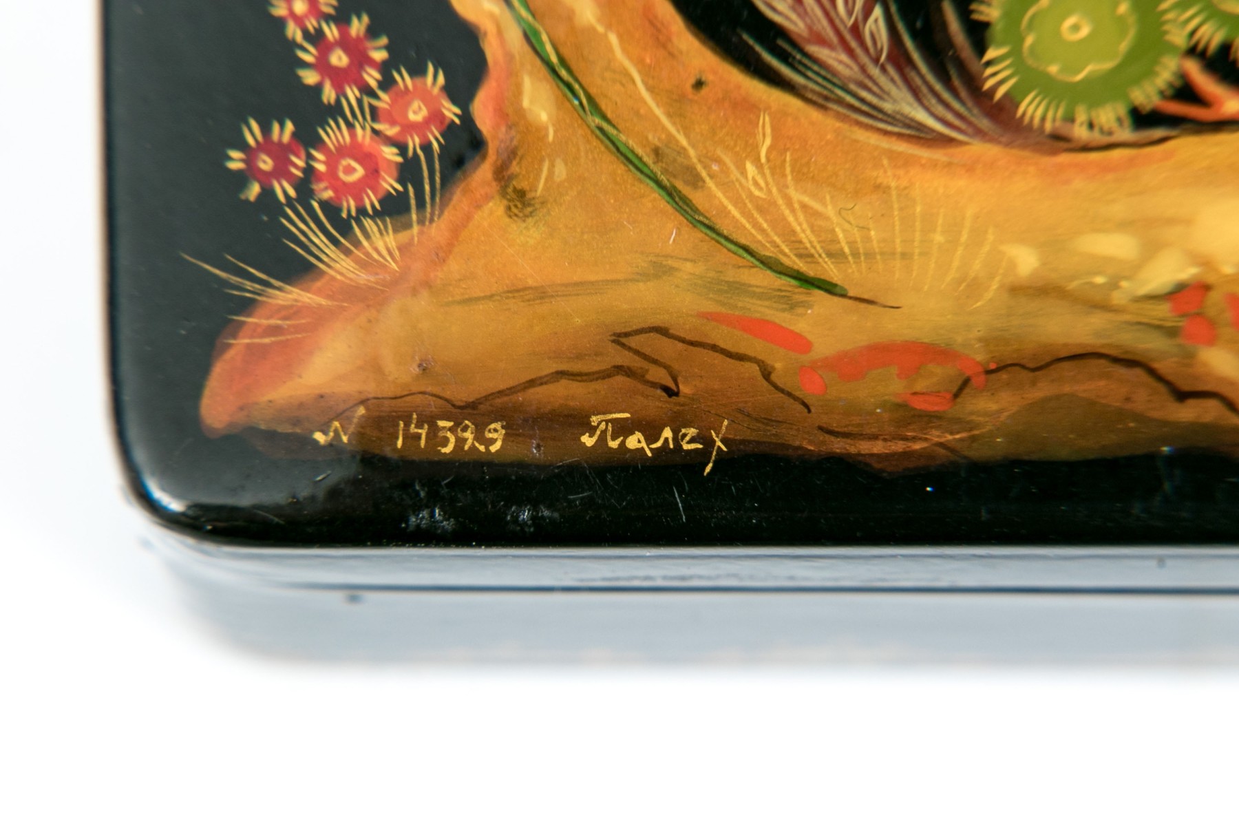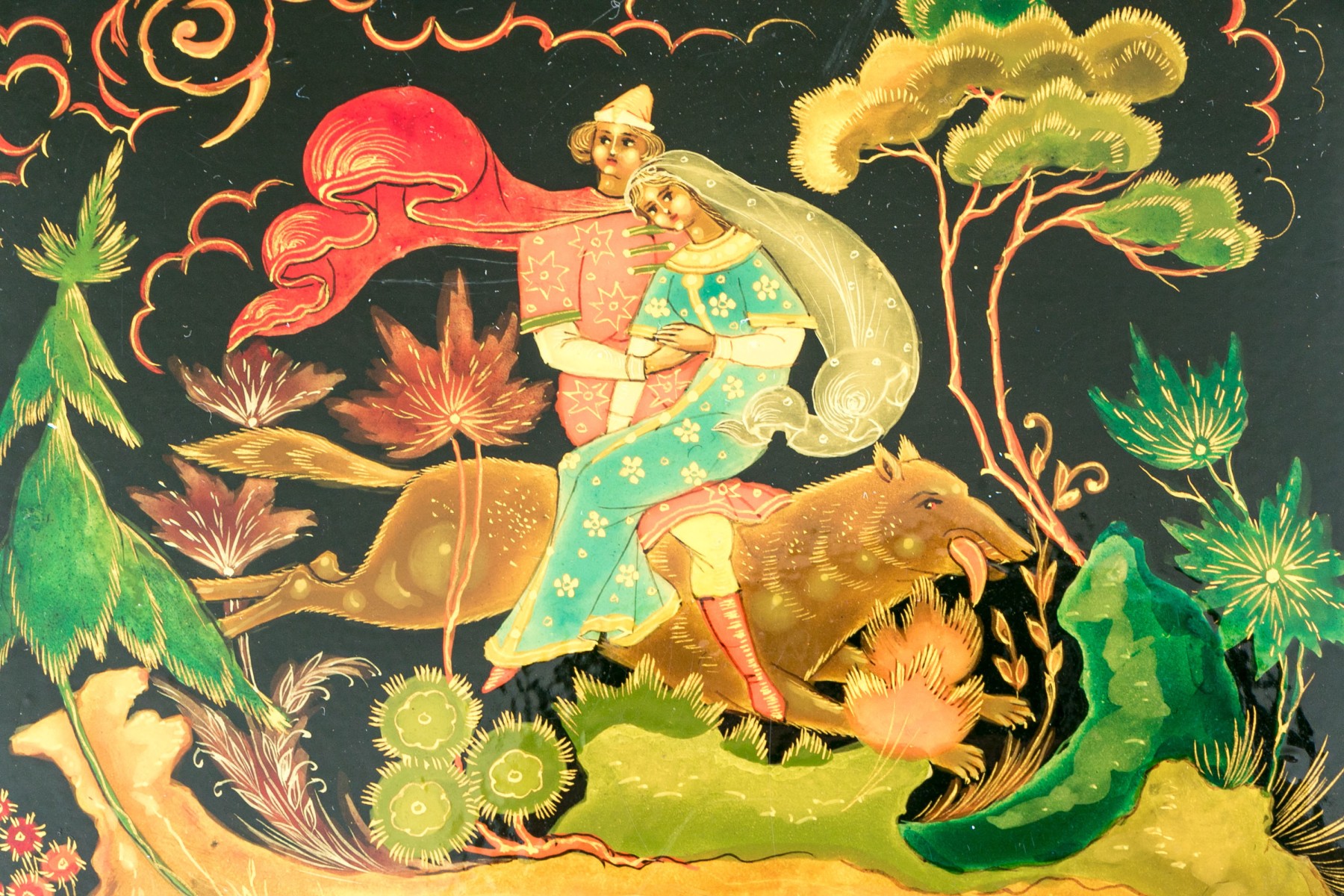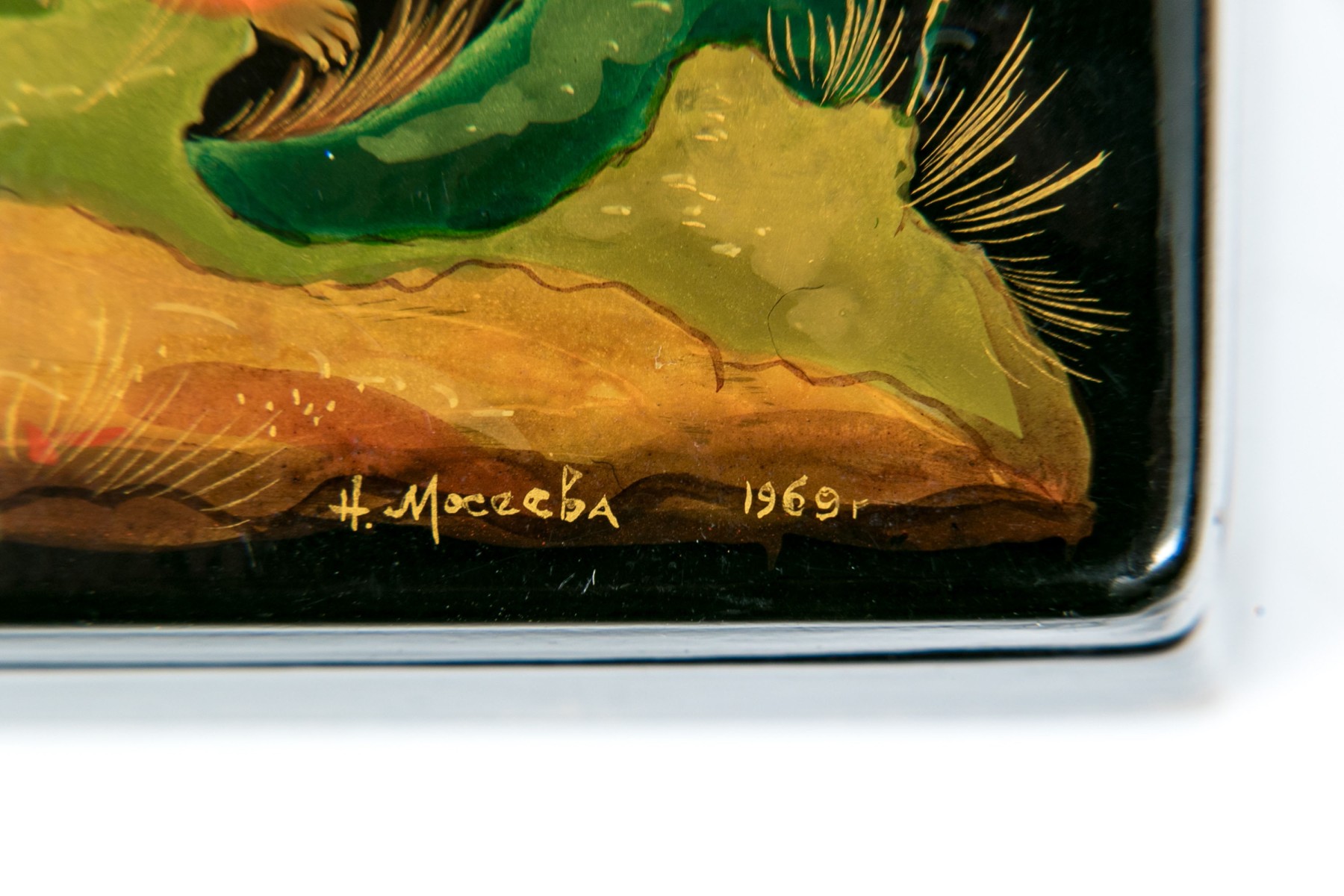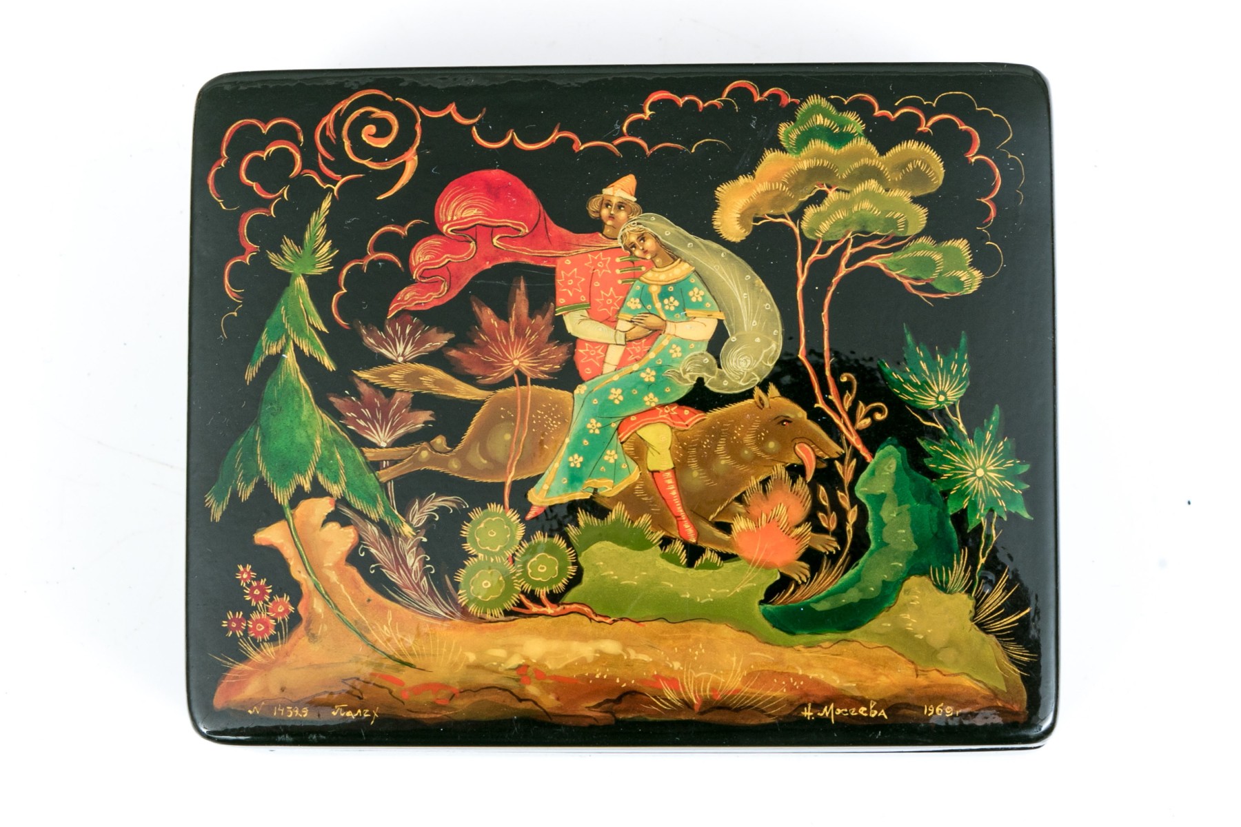Russian stunning rectangular folk art black lacquer box, "Ivan Tsarevich Riding the Gray Wolf" theme, red interior