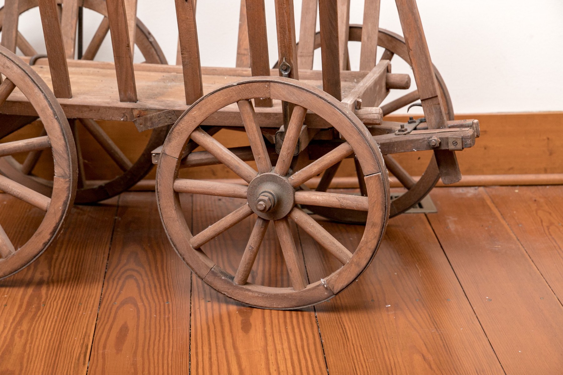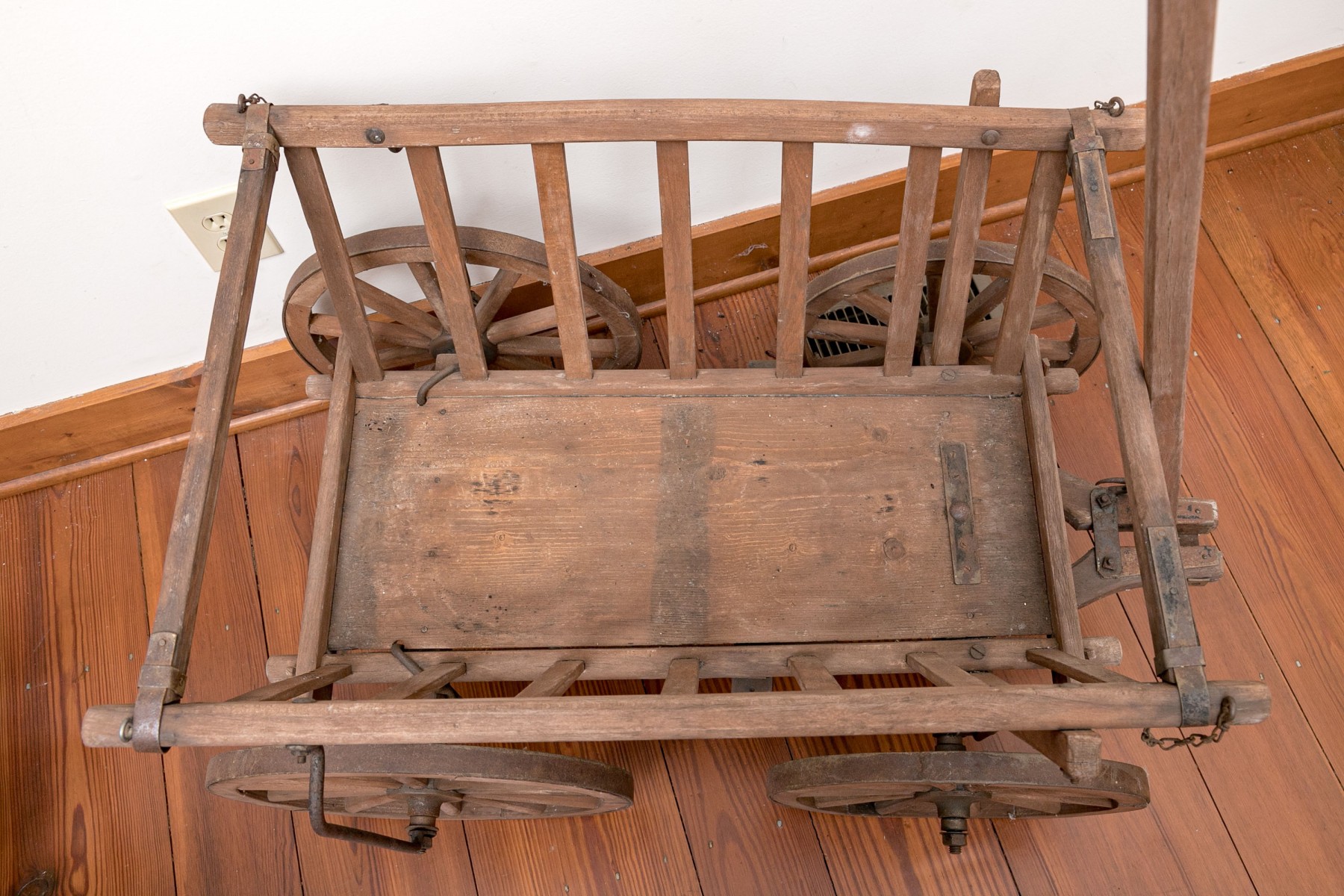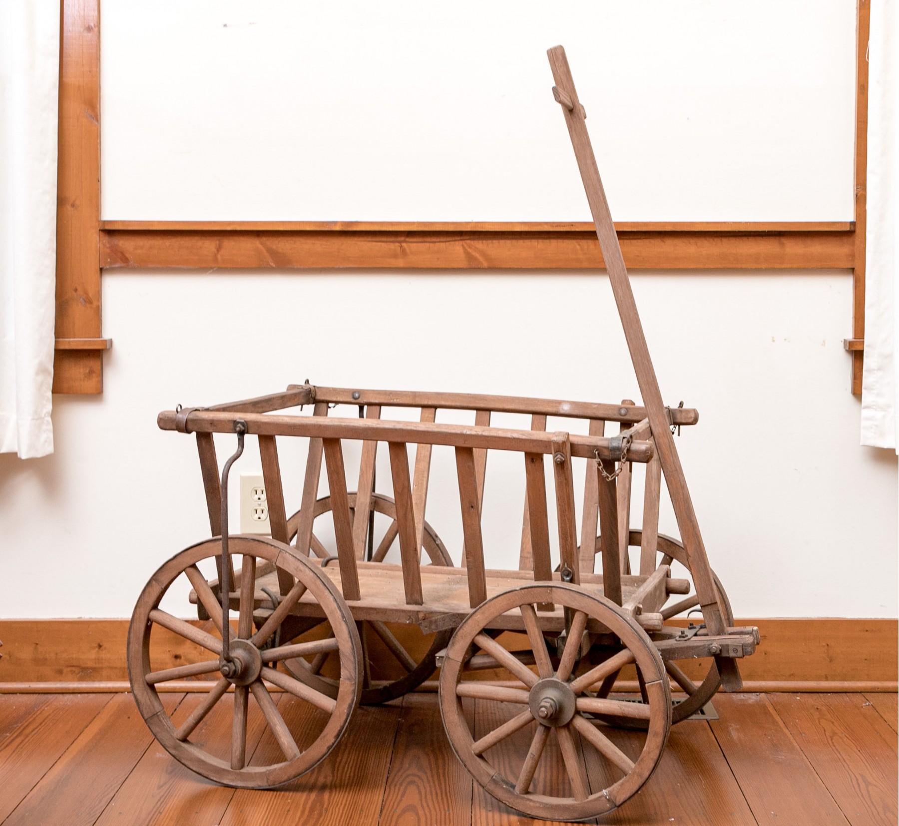 A rustic antique wooden wagon/garden cart, in traditional form, raised on four wheels and accented with a long handle.