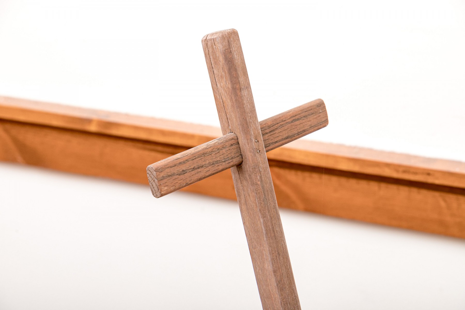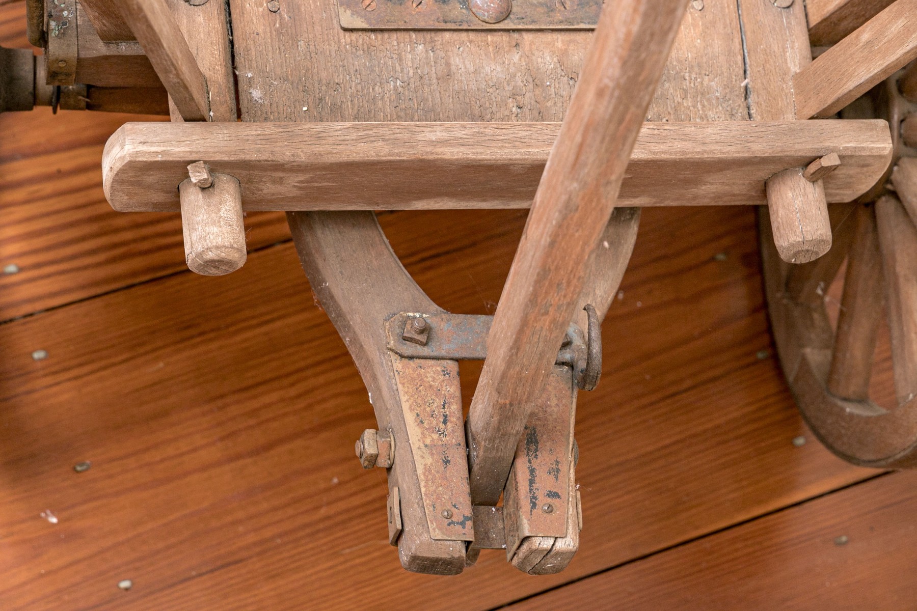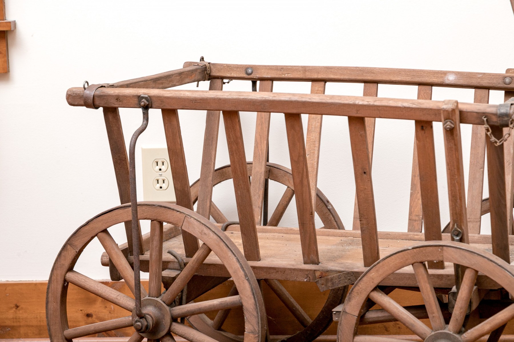 A rustic antique wooden wagon/garden cart, in traditional form, raised on four wheels and accented with a long handle.
