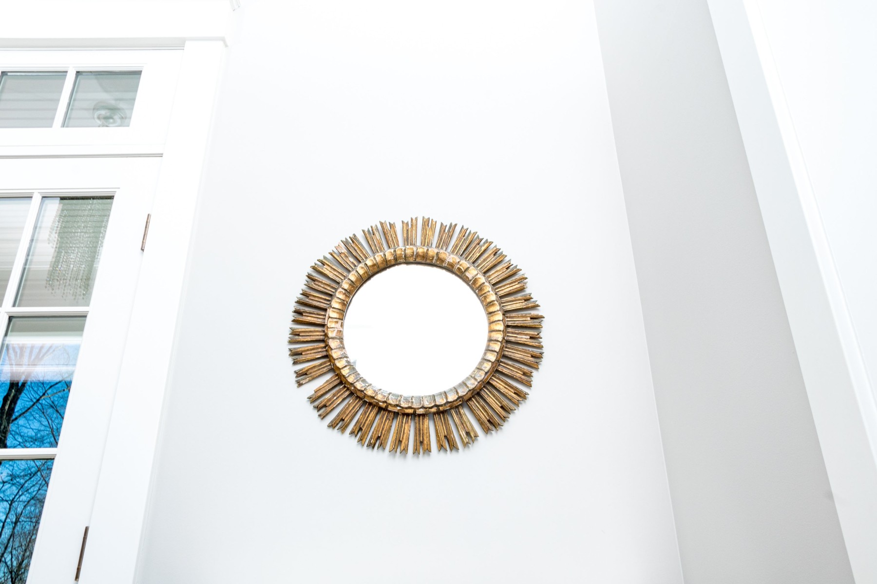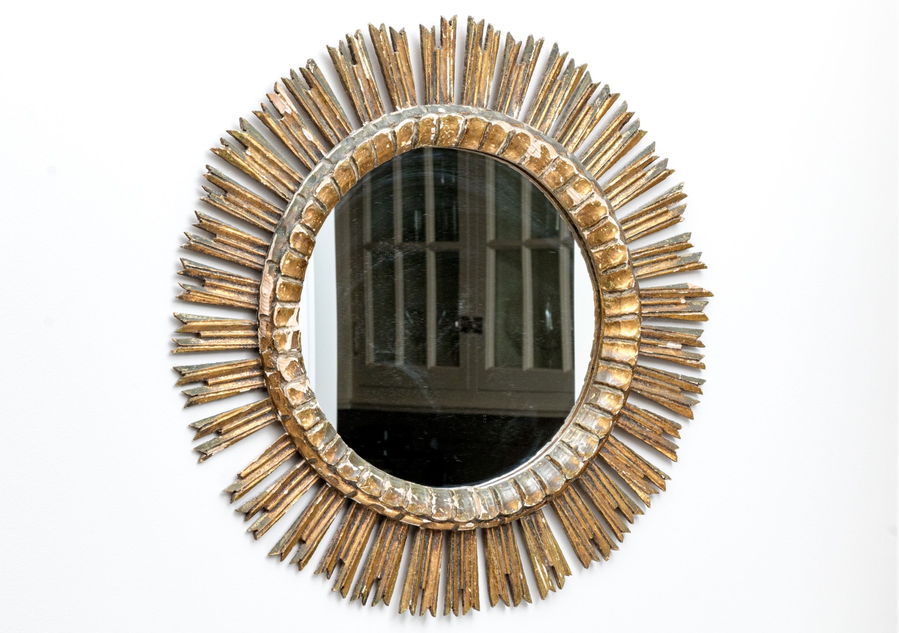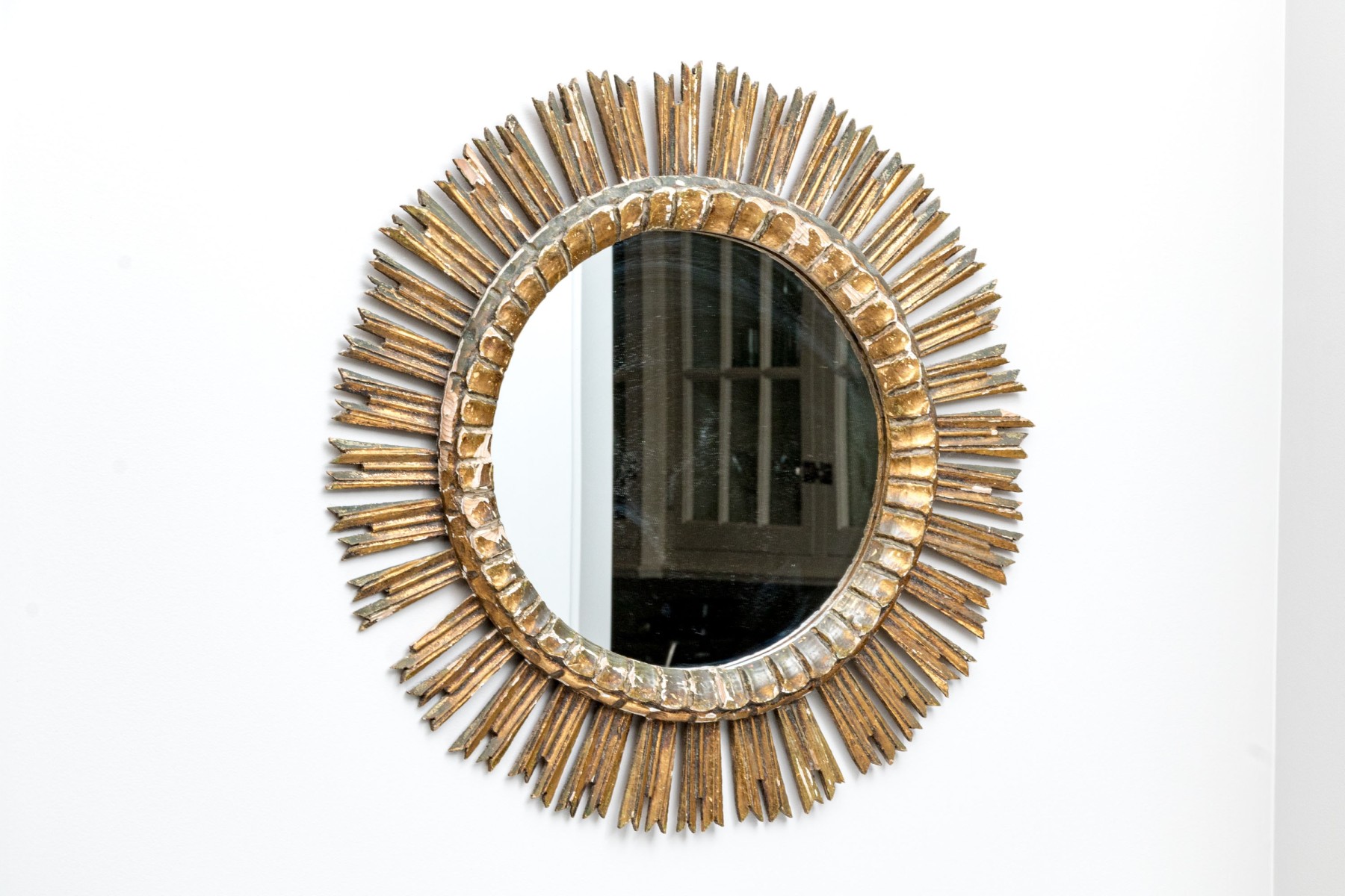 An eye-catching Italianate mirror with a wonderful sun design, showcasing a circular center with a raised rim carved with a petaled/scalloped border surrounded by sculptural rays in a rustic gilt finish.