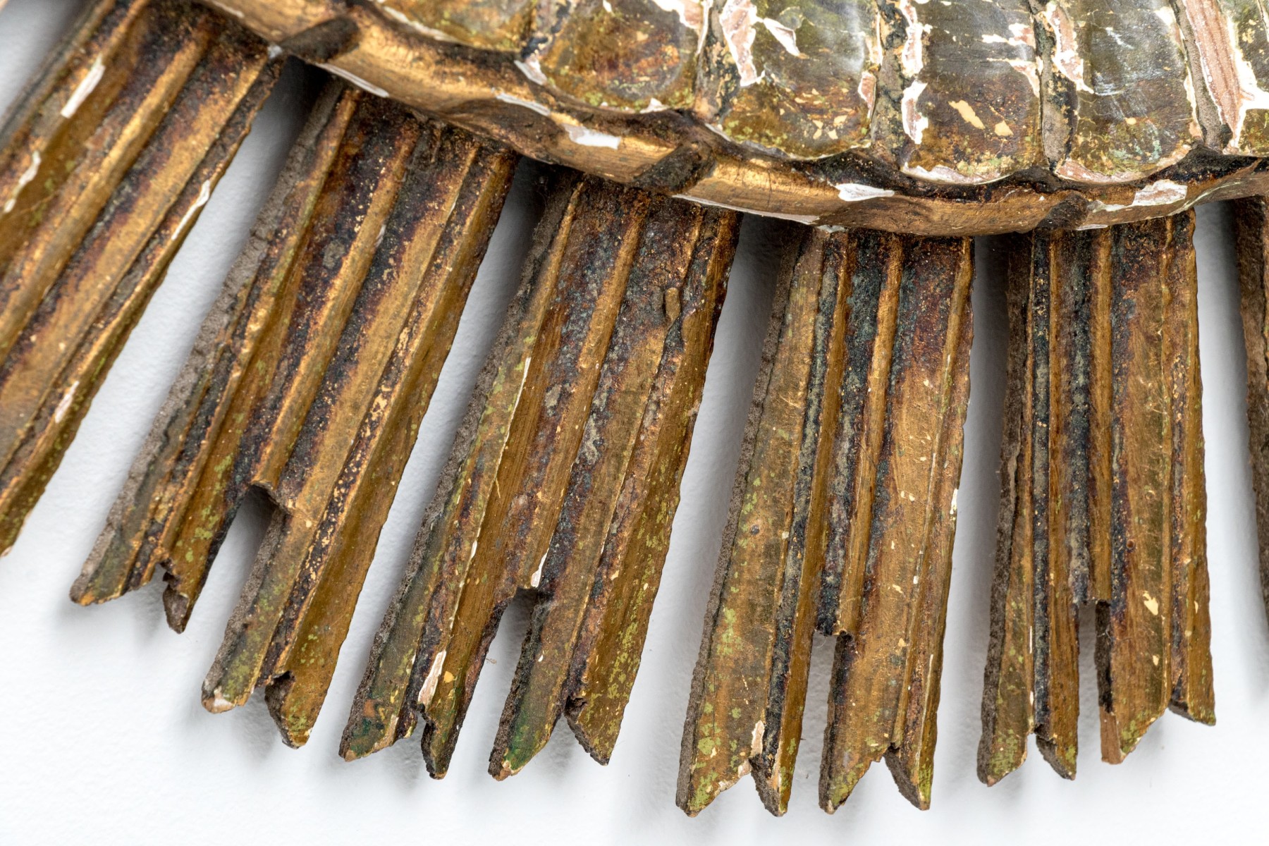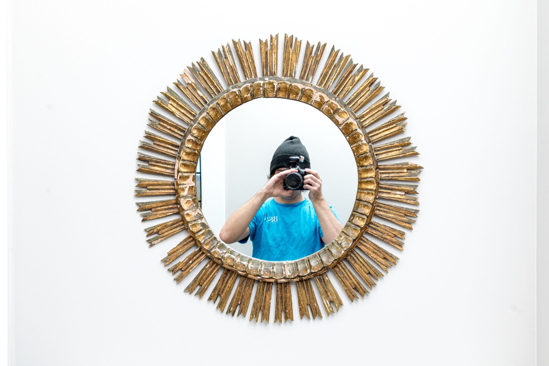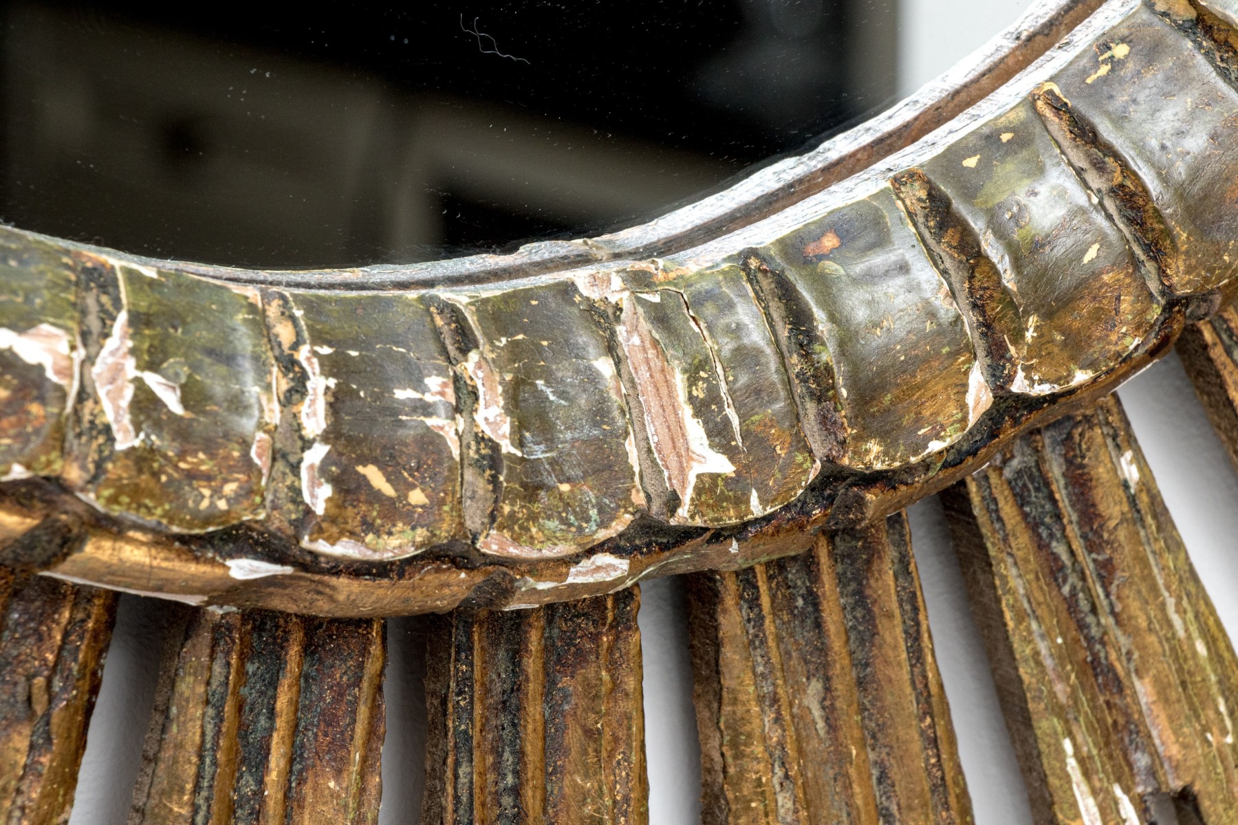 An eye-catching Italianate mirror with a wonderful sun design, showcasing a circular center with a raised rim carved with a petaled/scalloped border surrounded by sculptural rays in a rustic gilt finish.